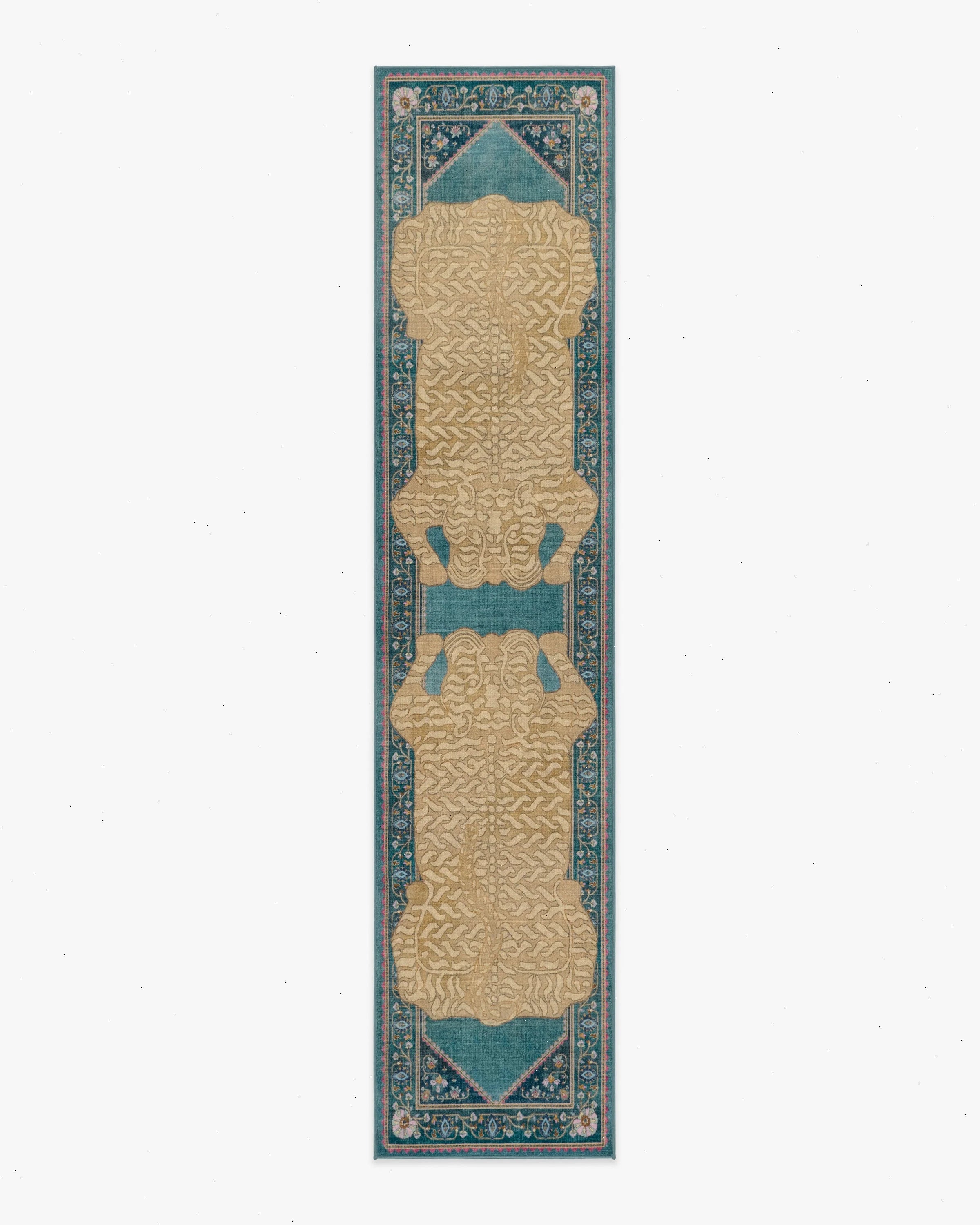A fierce take on tradition. The Tigris Blue Rug by Anthropologie features a bold wildcat design framed by intricate Persian-inspired borders. Warm neutrals, pink, orange, bright blue, lavender, soft green, and rust come alive against a rich blue background. Water-resistant, stain-resistant, and fully machine-washable. Colors may vary by device and lighting.