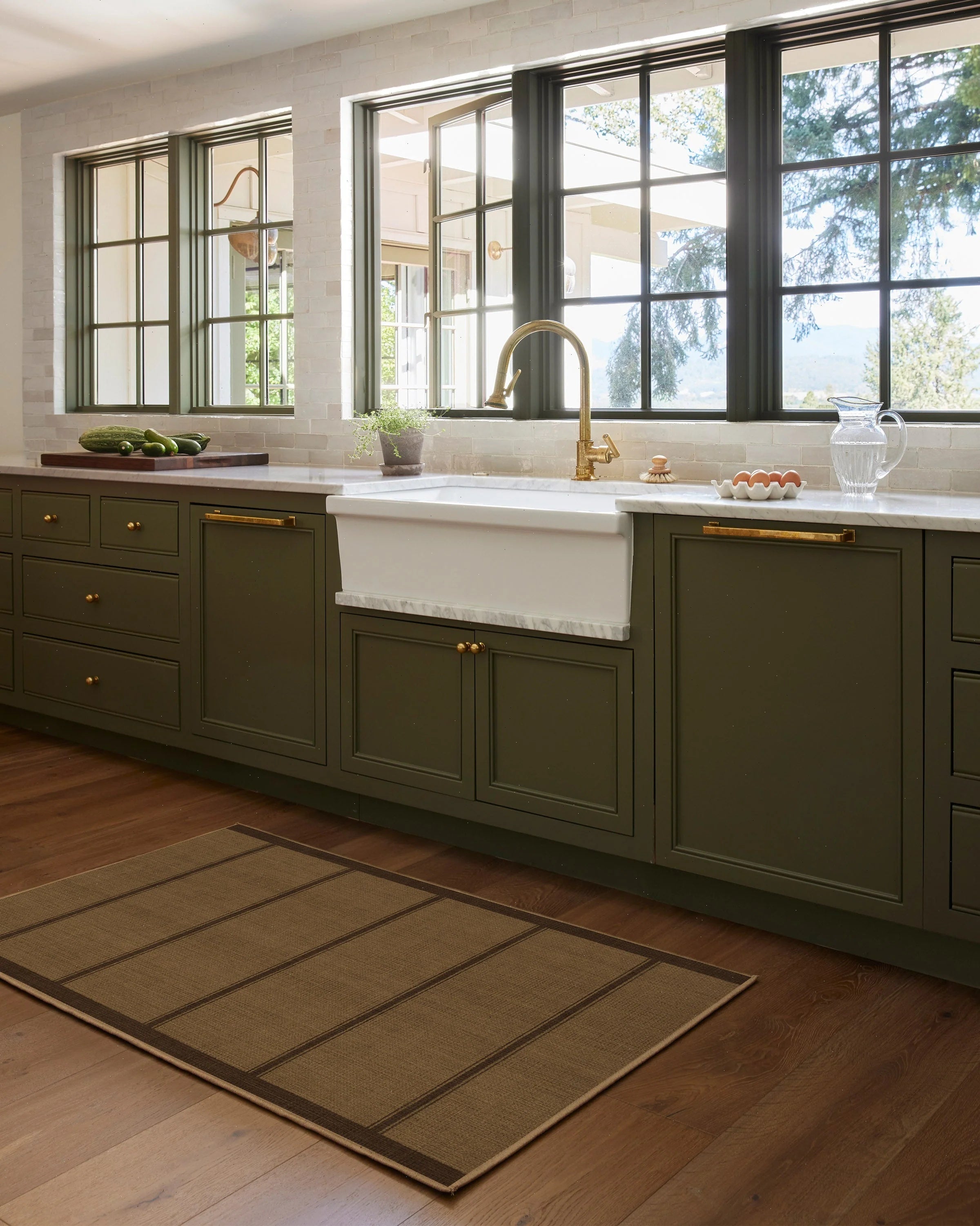 Practicality rules the kitchen. A runner near the sink adds comfort and peace of mind for spills.