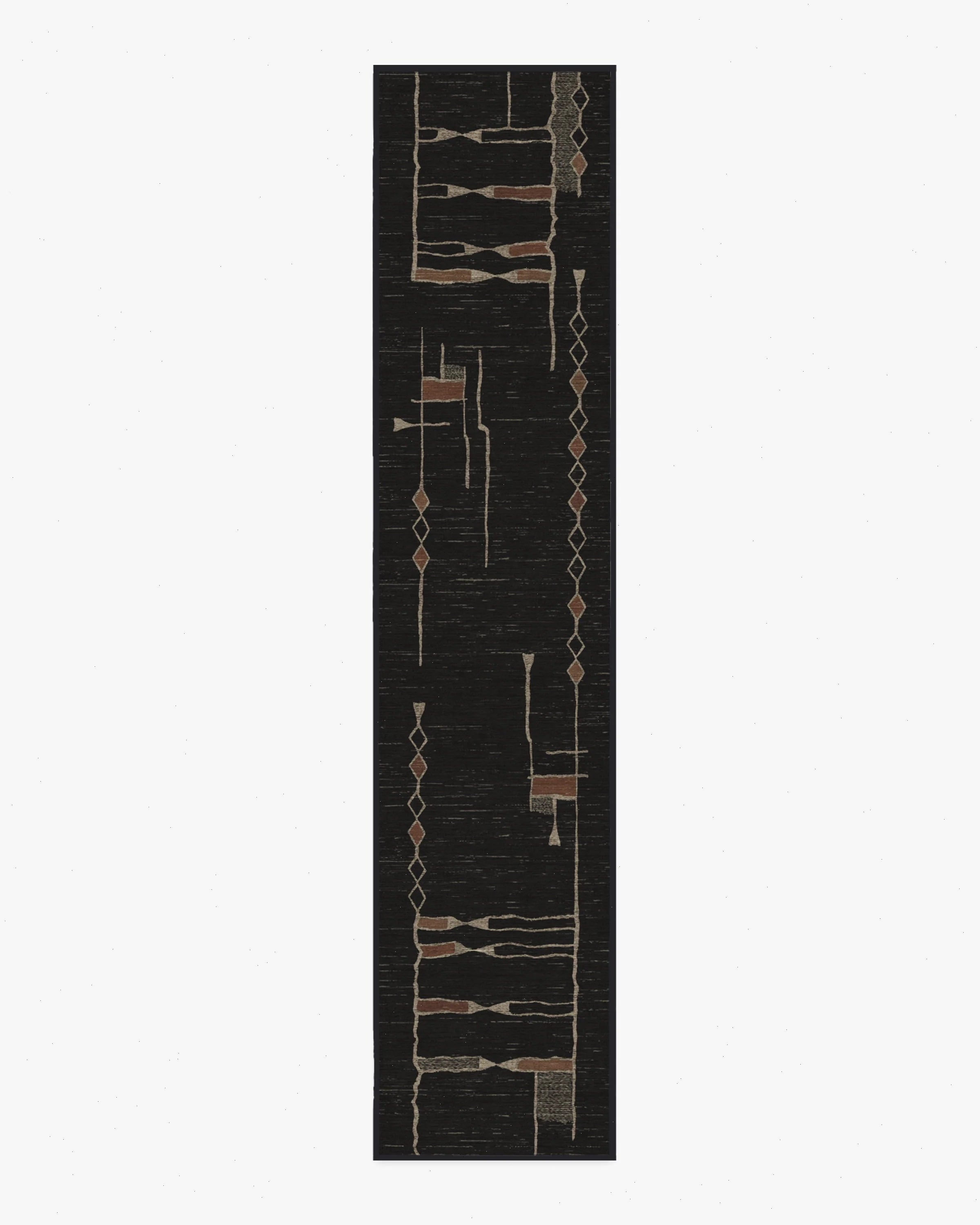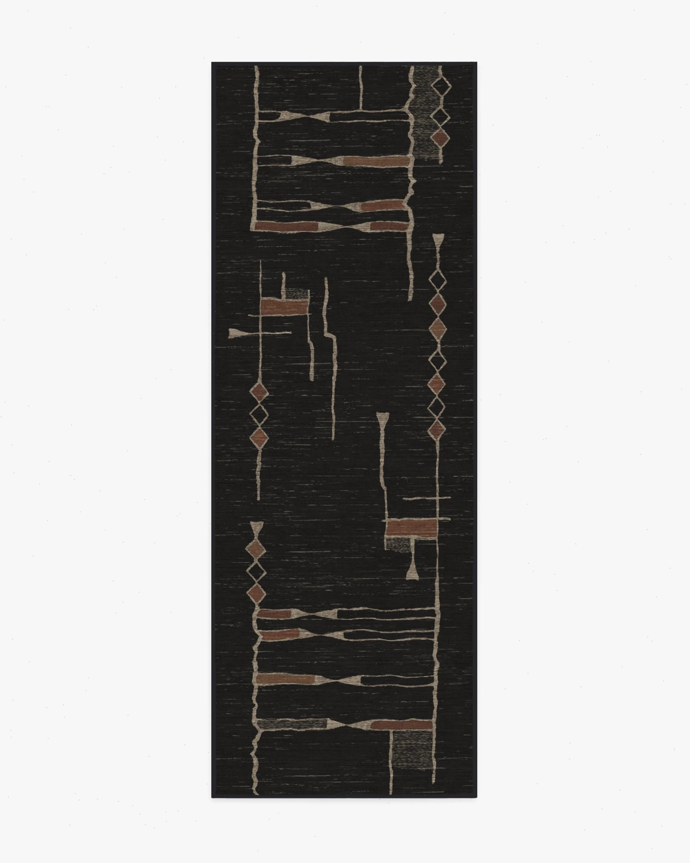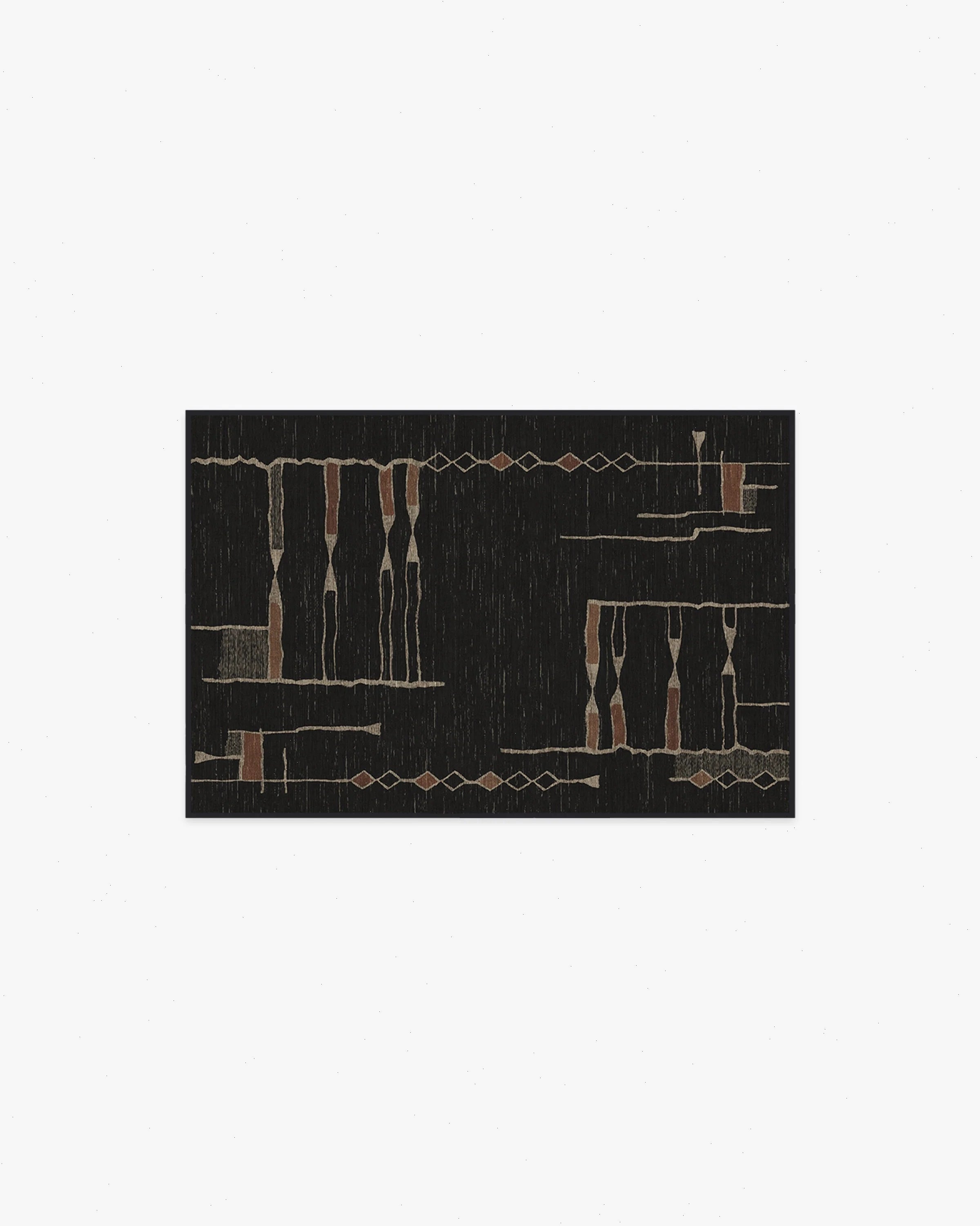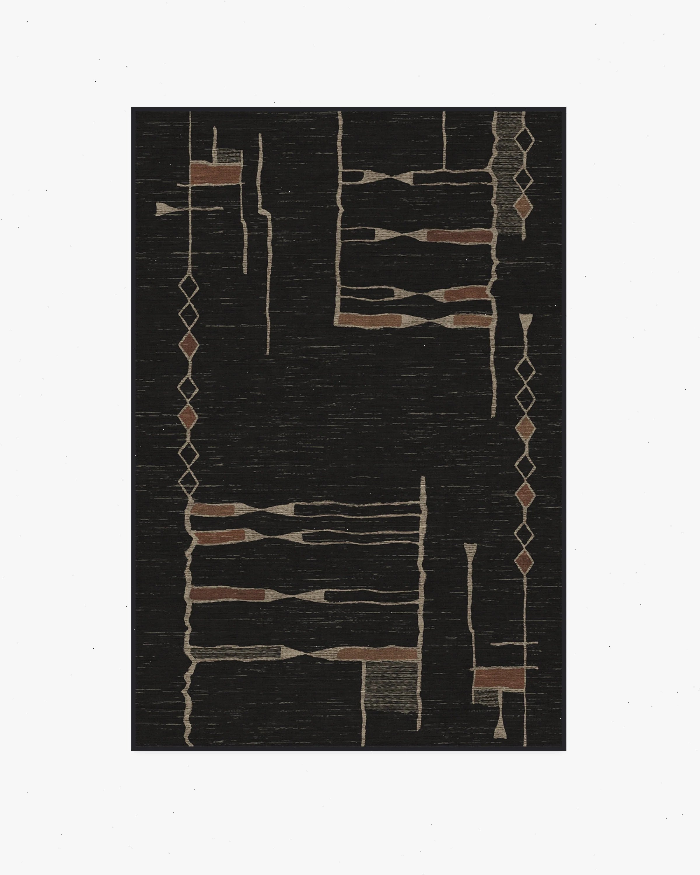 Discover the moody side of Moroccan design with our Architectural Digest Nisa Ink Black Rug, designed by Hema Persad. Rich, sexy, and cozy, this style draws inspiration from Beni Ourain Moroccan rugs, and features authentically organic line work and asymmetric patterns. Rustic earth tones against a dark charcoal background bring a touch of warmth to any room. Water-resistant, stain-resistant, and machine-washable. Rug colors may vary slightly according to your device and the lighting in your space.