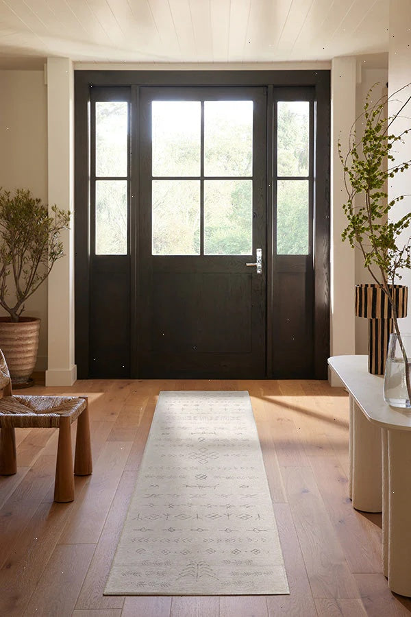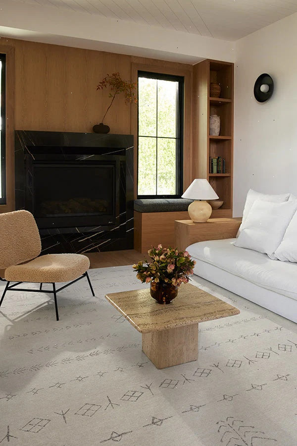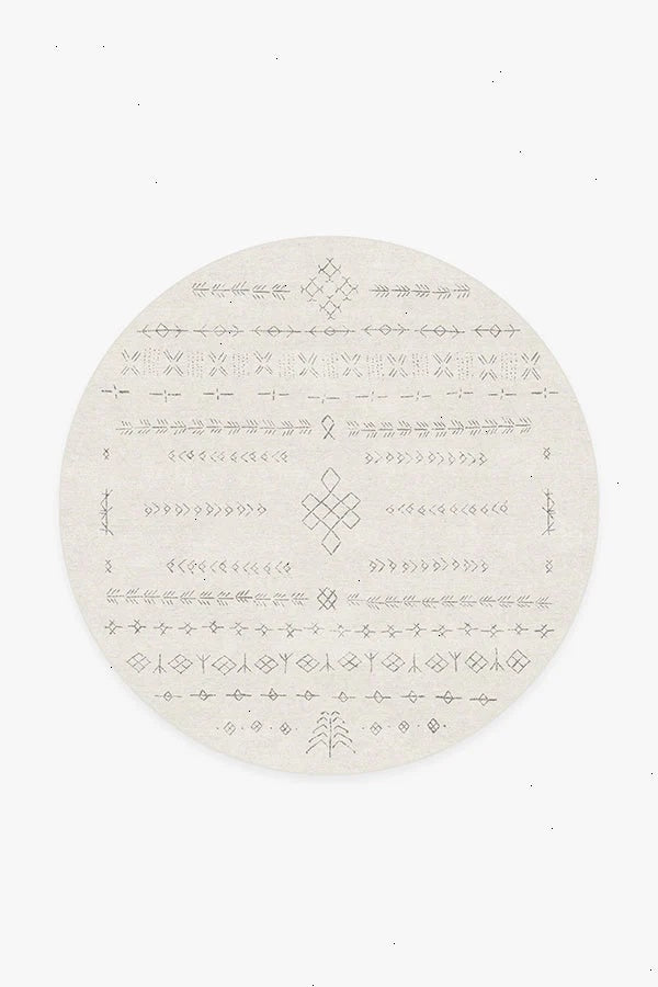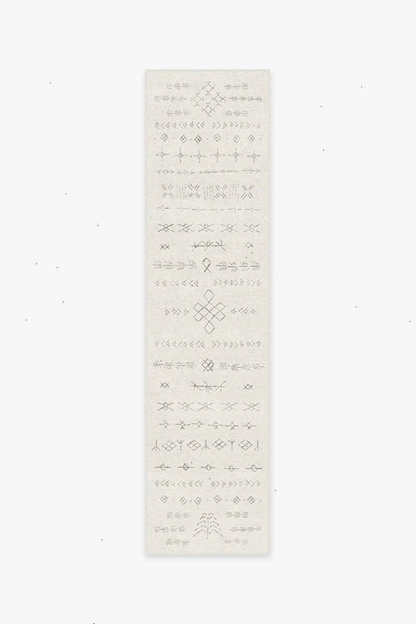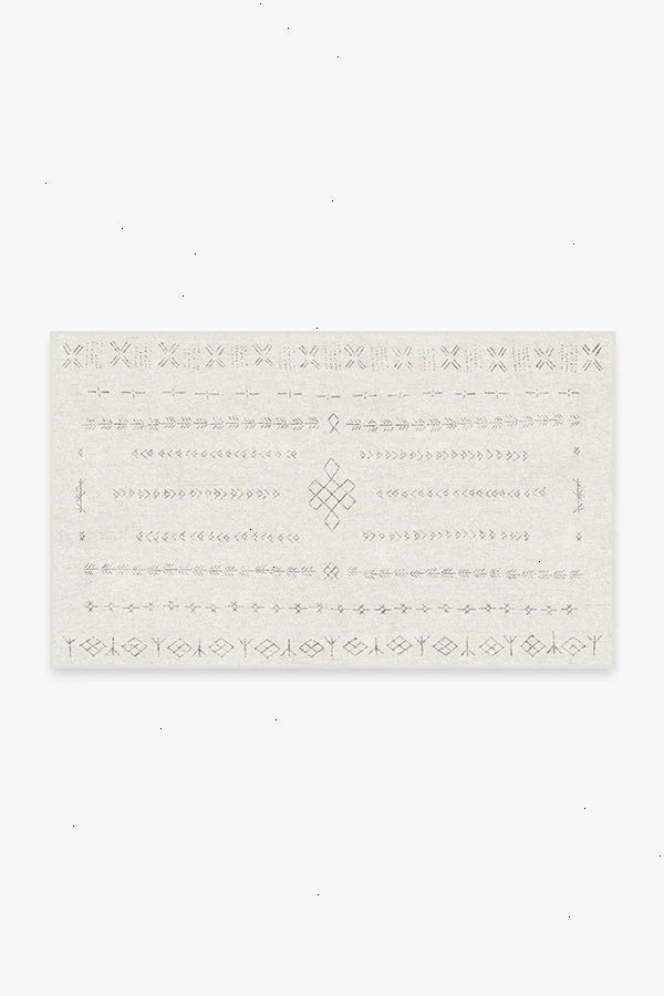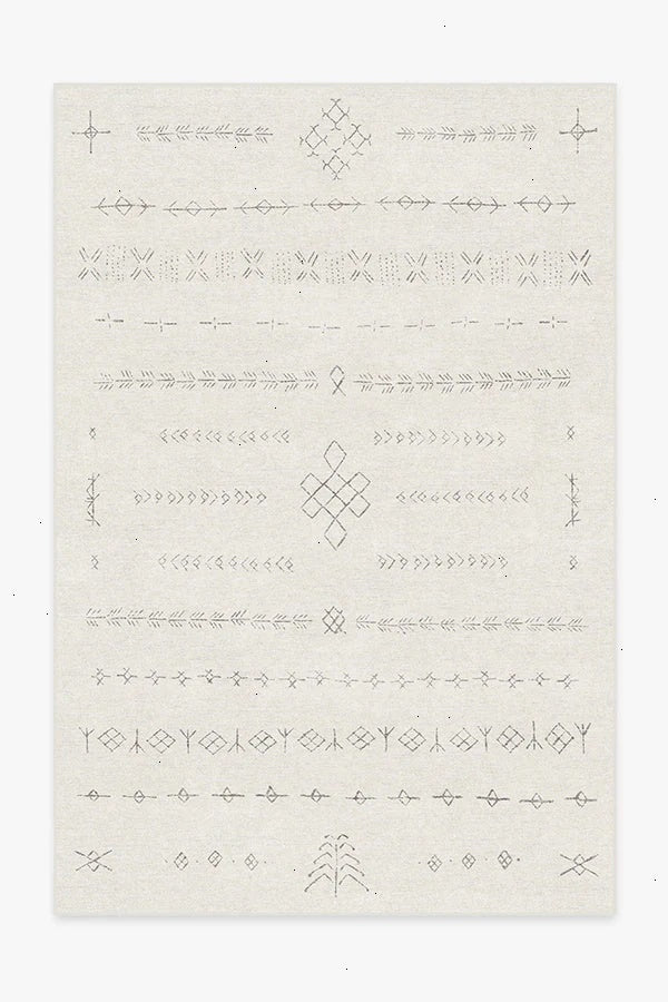 Create a modern oasis with our Astrid Off White Rug. Inspired by shapes reminiscent of the ancient Norse alphabet and knots found on Viking ships, this intricate design blends an off-white background with warm grey motifs. Water-resistant, stain-resistant, and machine-washable. Rug colors may vary slightly according to your device and the lighting in your space.