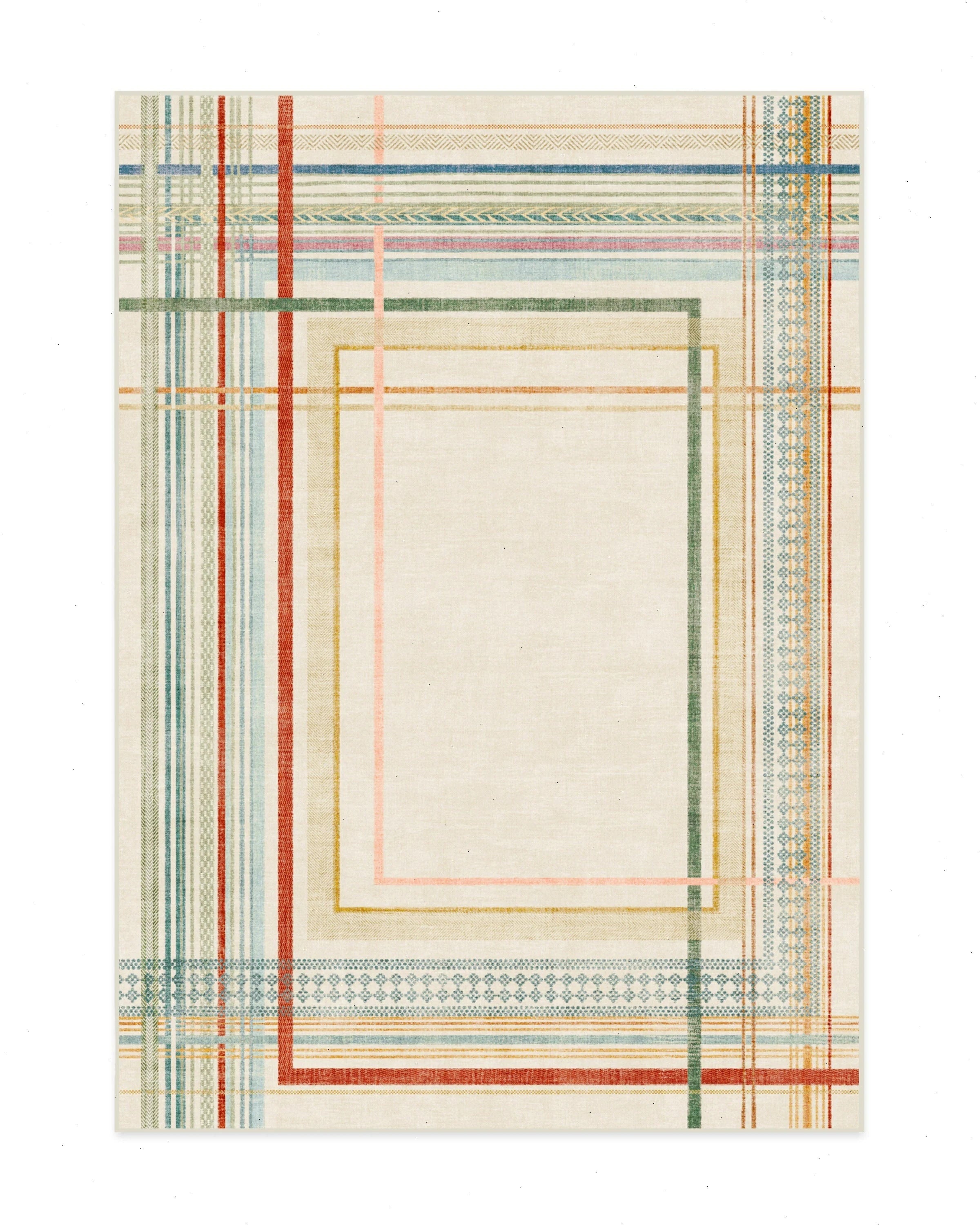 A celebration of color and craftsmanship, the Callie Cream Multicolor Rug blends vintage charm with contemporary vibrance. Multicolor patterns and stripes of red, blues, greens, pink, light coral, gold, mustard yellow, and vintage orange stand out against a warm ivory background, striking the perfect balance between bold and subtle. Water-resistant, stain-resistant, and machine-washable. Colors may vary slightly according to your device and the lighting in your space.