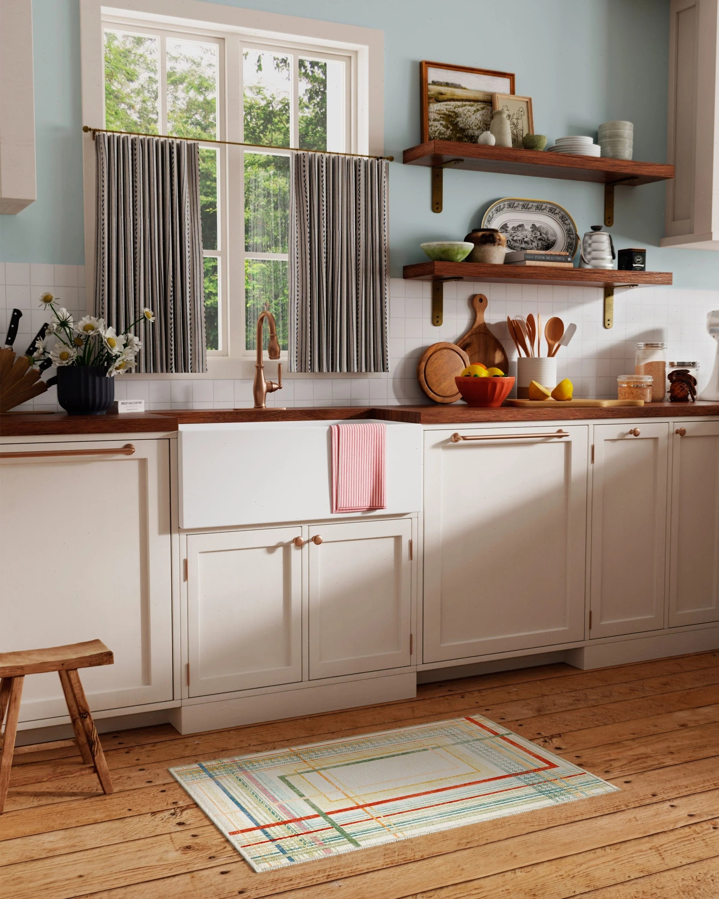 Practicality rules the kitchen. A runner near the sink adds comfort and peace of mind for spills.