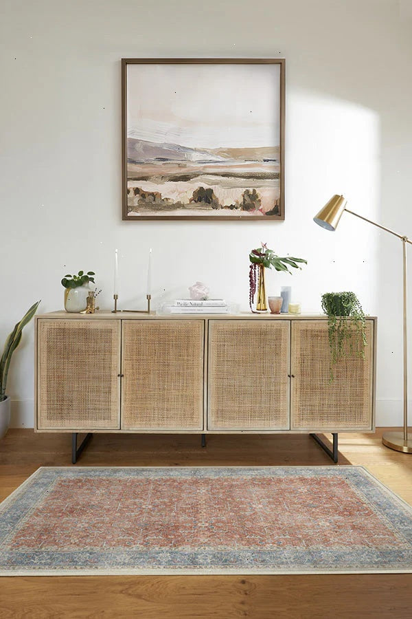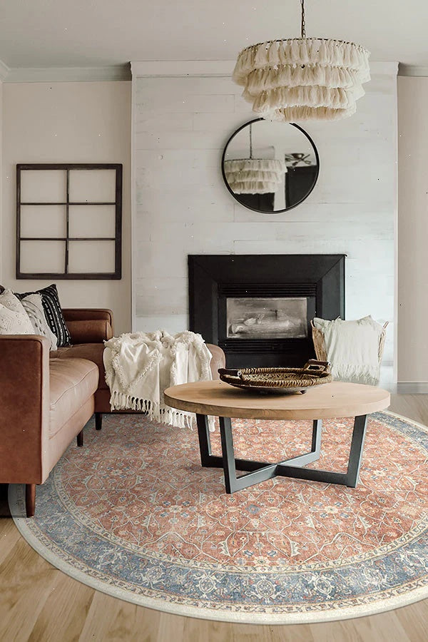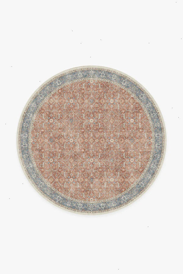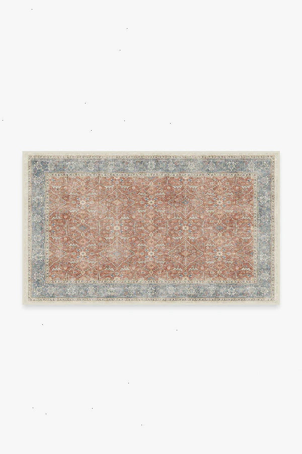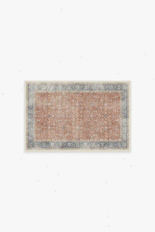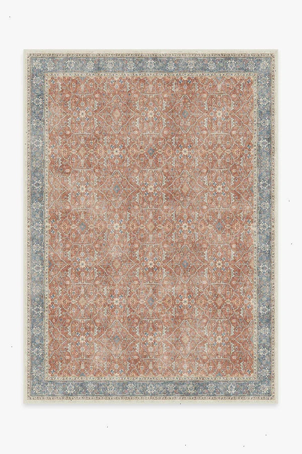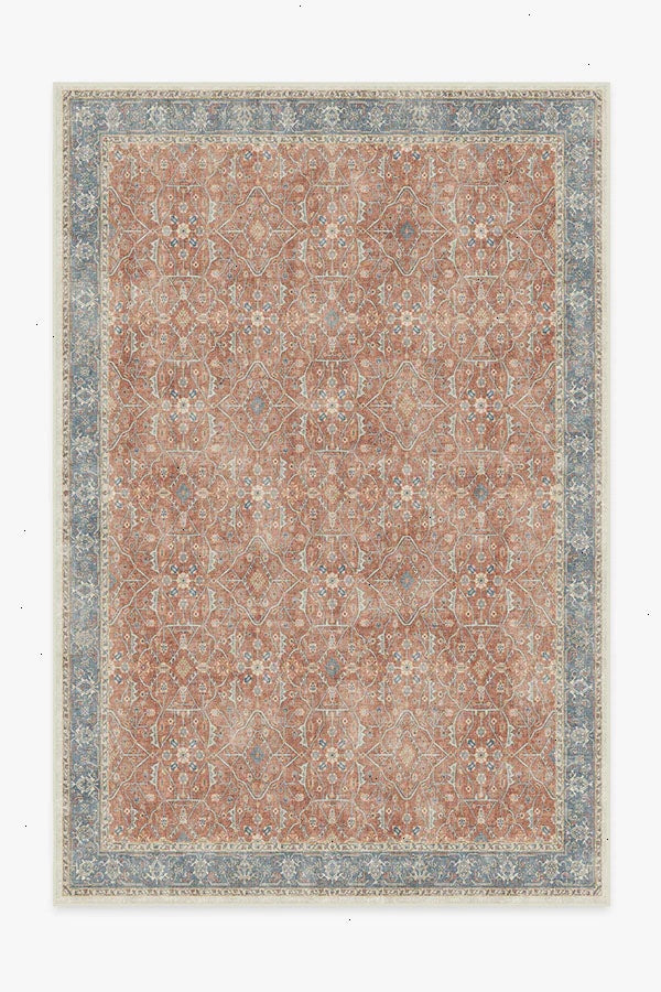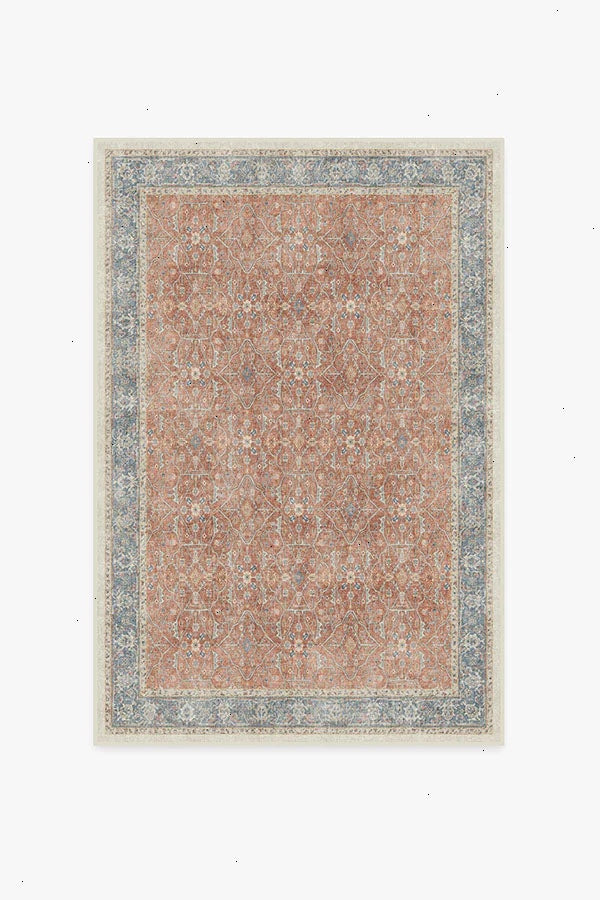 Celestine Coral Rug features a classic floral theme in playful coral and blue hues. Its vintage inspired design mimics an intricate floral vine lattice panel with a bordered grid-like pattern completed with a beautifully distressed texture. Water-resistant, stain-resistant, and machine-washable. Rug colors may vary slightly according to your device and the lighting in your space.