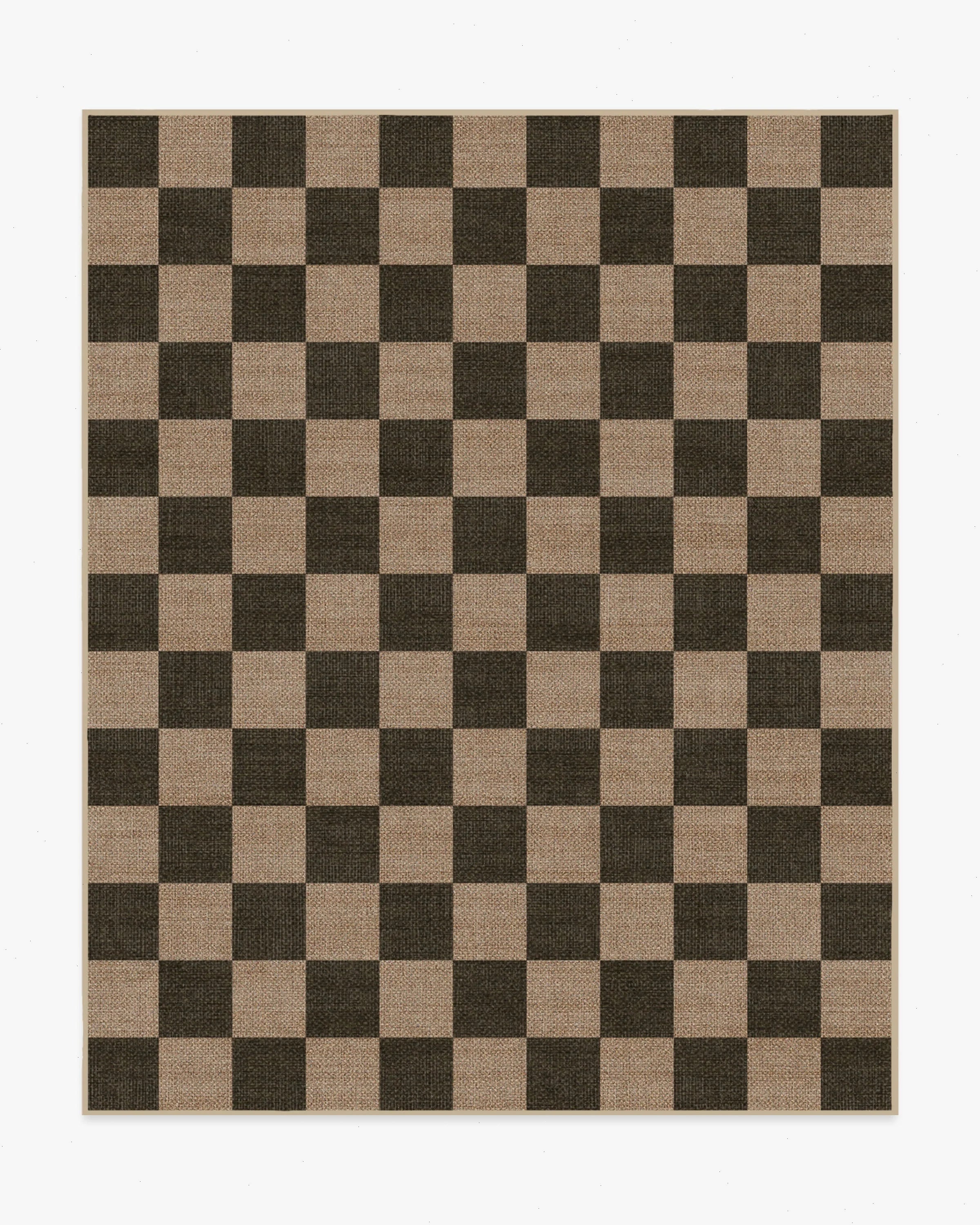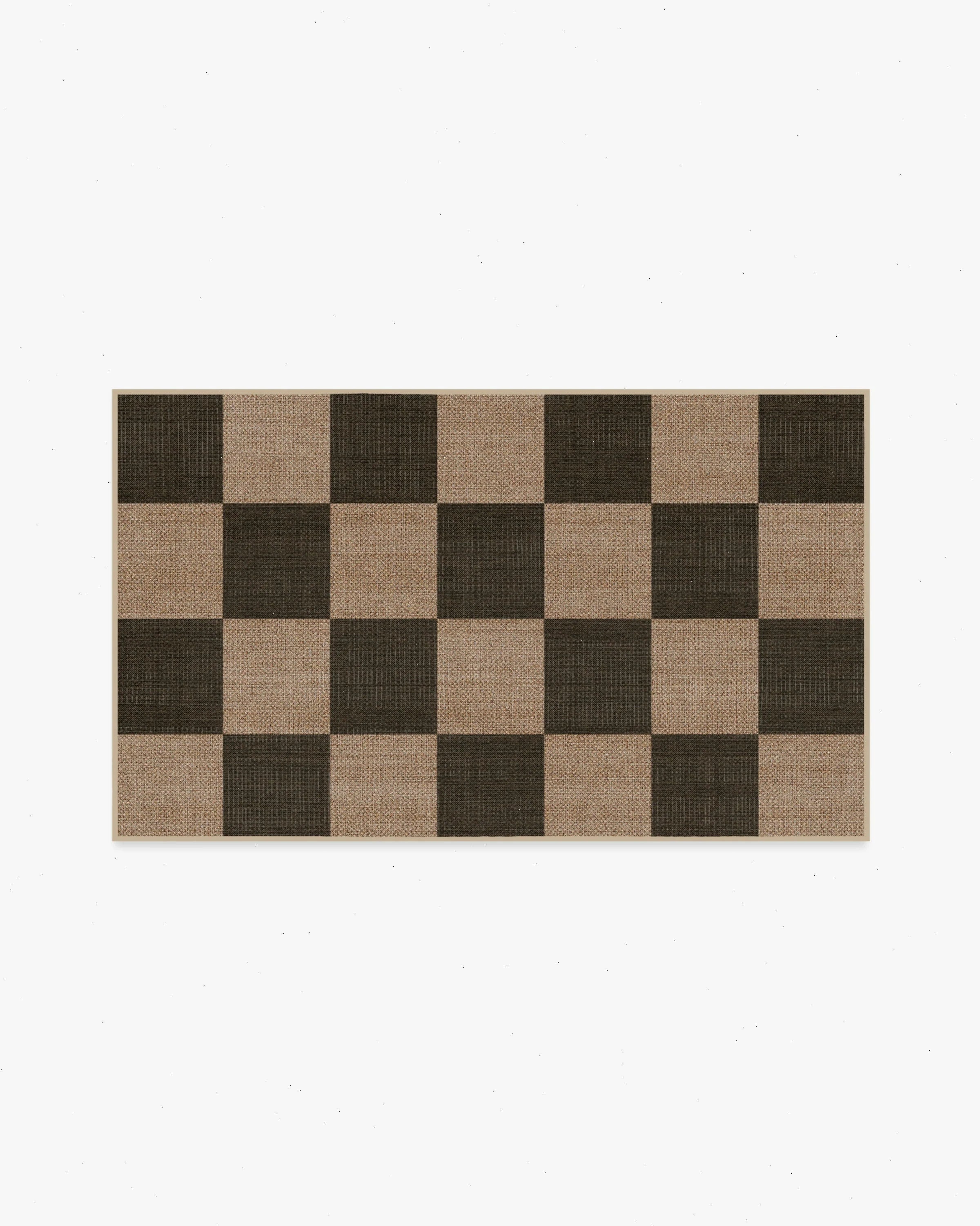 A classic pattern that's sure to turn heads every time. Our Checkerboard Soft Black Re-Jute Rug features a bold geometric pattern in weathered black on a warm beige background that gives off the regal ambience of vintage Italian flooring. The woven jute-like material is made from recycled and virgin polyester, and polyurethane that won't shed or fray. Water-resistant, stain-resistant, and machine-washable.