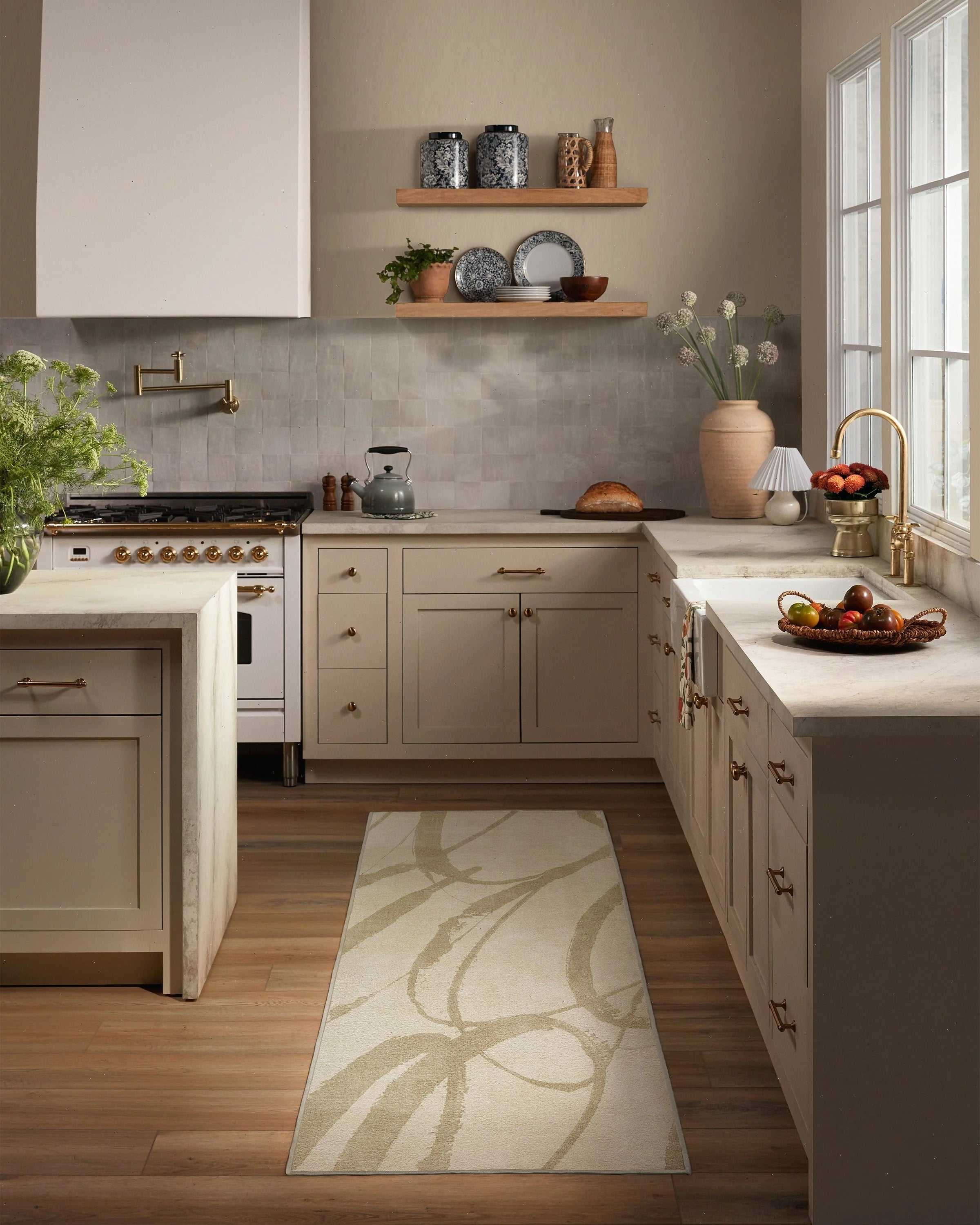 Practicality rules the kitchen. A runner near the sink adds comfort and peace of mind for spills.
