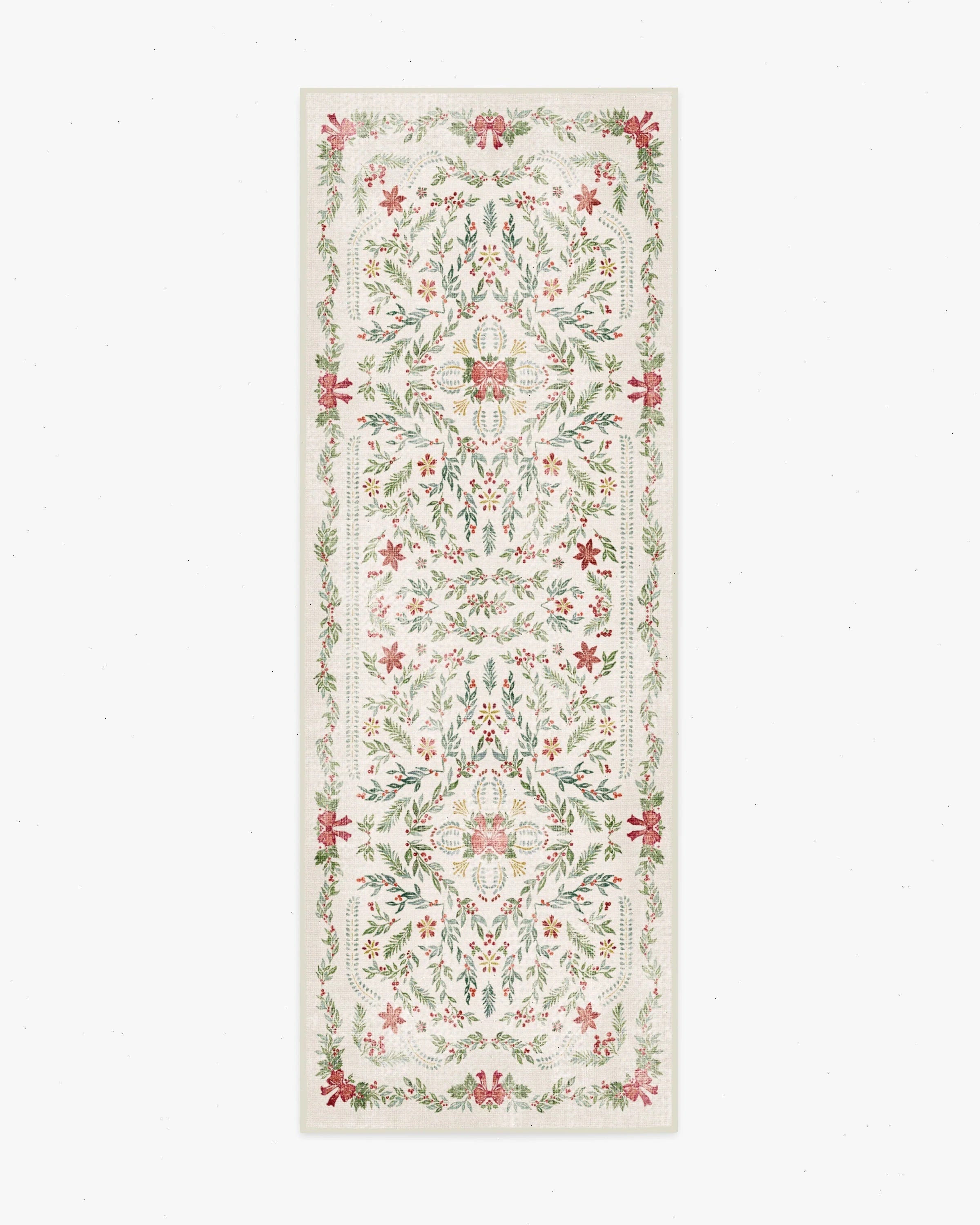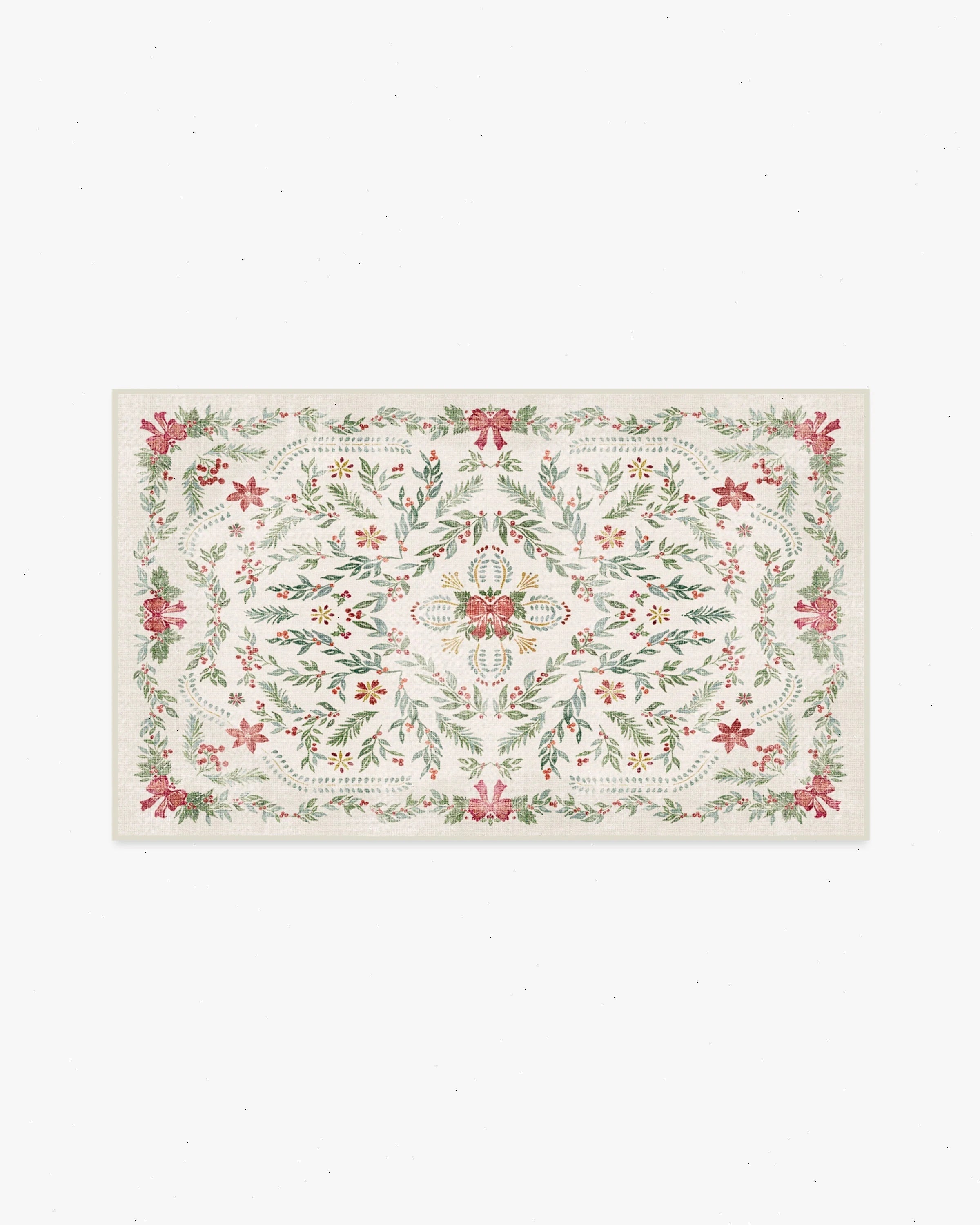 Bring the holiday cheer home. The Deck The Halls Cream Multicolor Rug wraps your space in classic seasonal vibes with a fresh twist. Starting with a creamy base that gently darkens at the edges, it’s decorated with sprigs of green and sage fir, holly berries, and bright red bows—plus little pops of golden yellow that catch the eye. Water-resistant, stain-resistant, and machine-washable. Colors may vary by device and lighting.