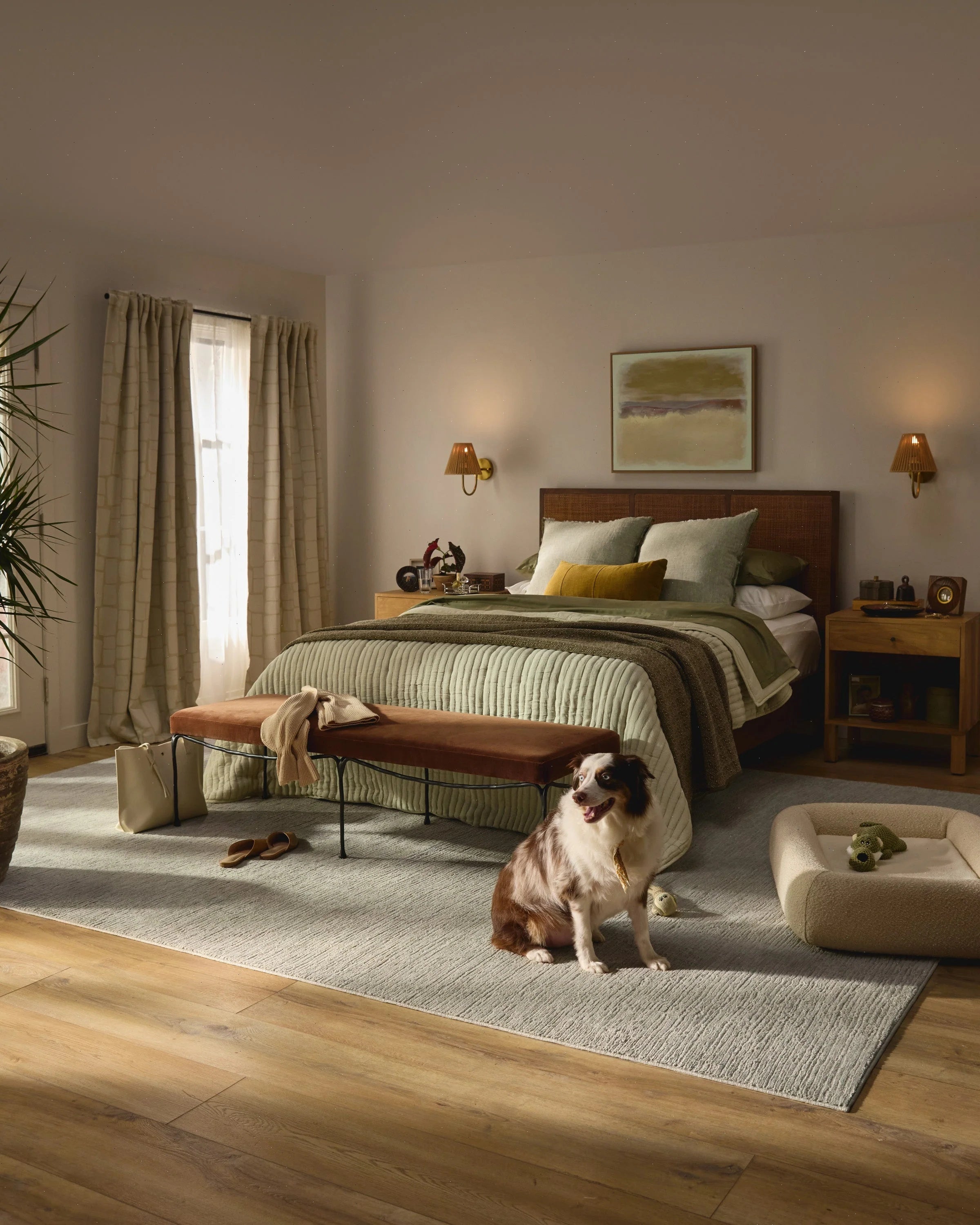 Let bed size kick-start the planning. Ground the room by placing a large area rug under the foot of the bed.