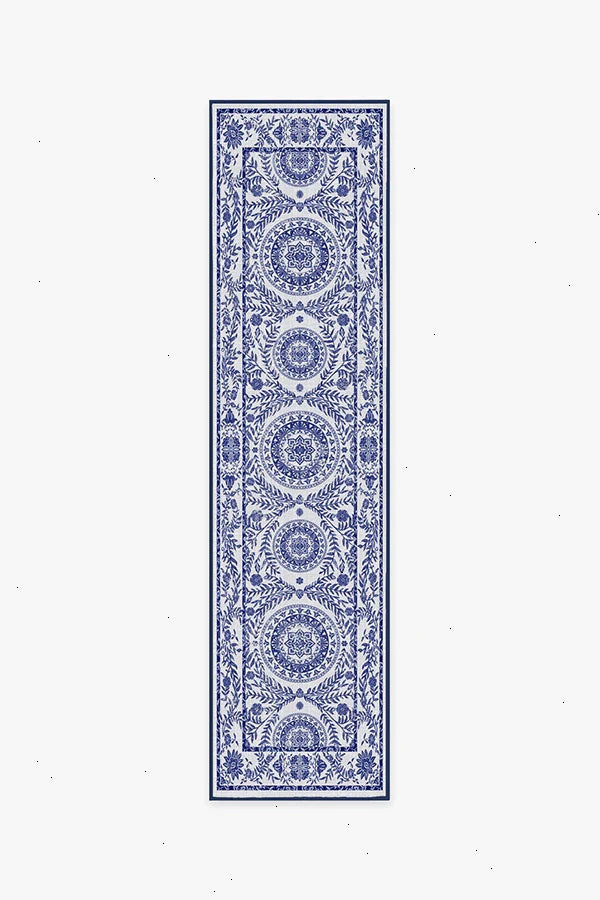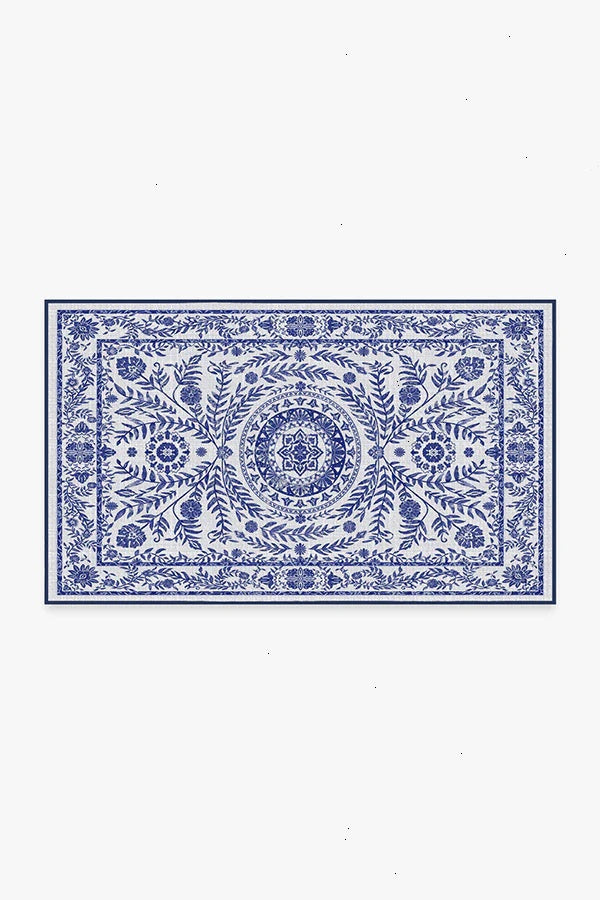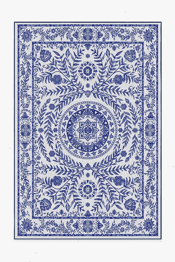 Floral finesse. Our Fontaine Delt Blue Outdoor Rug features intricate floral vines and decorative flowers inspired by traditional European woodblock prints in bright blue set atop a white background. Made from our extra-durable, machine-washable material that's perfect for both outdoor and indoor use, especially high-traffic areas and those exposed to the elements.