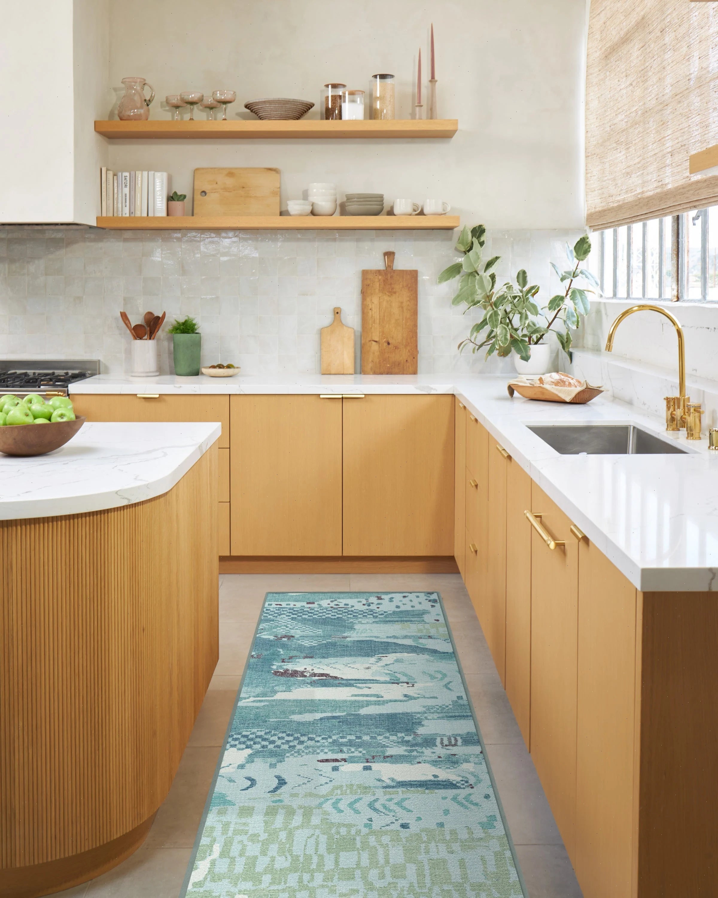 Practicality rules the kitchen. A runner near the sink adds comfort and peace of mind for spills.