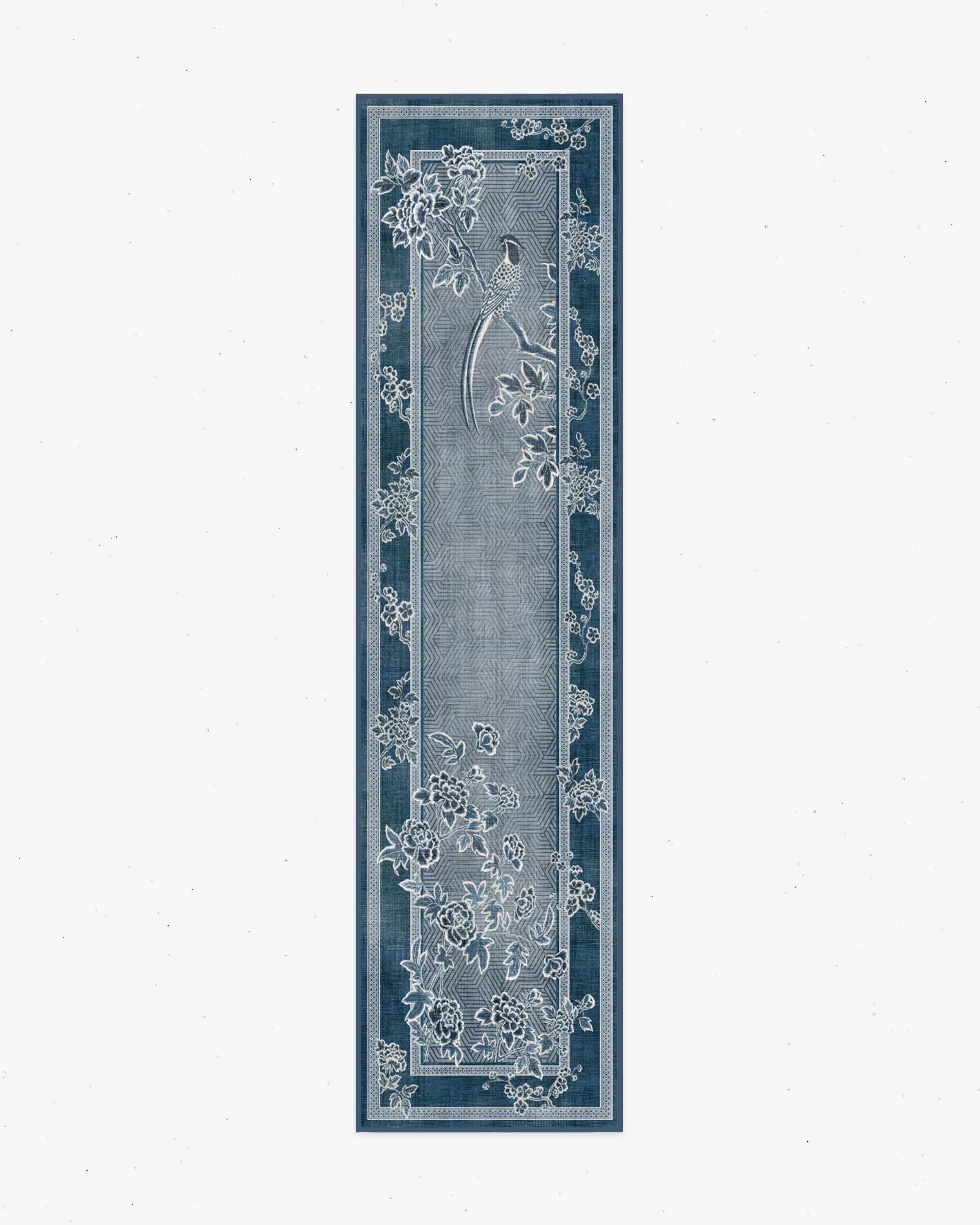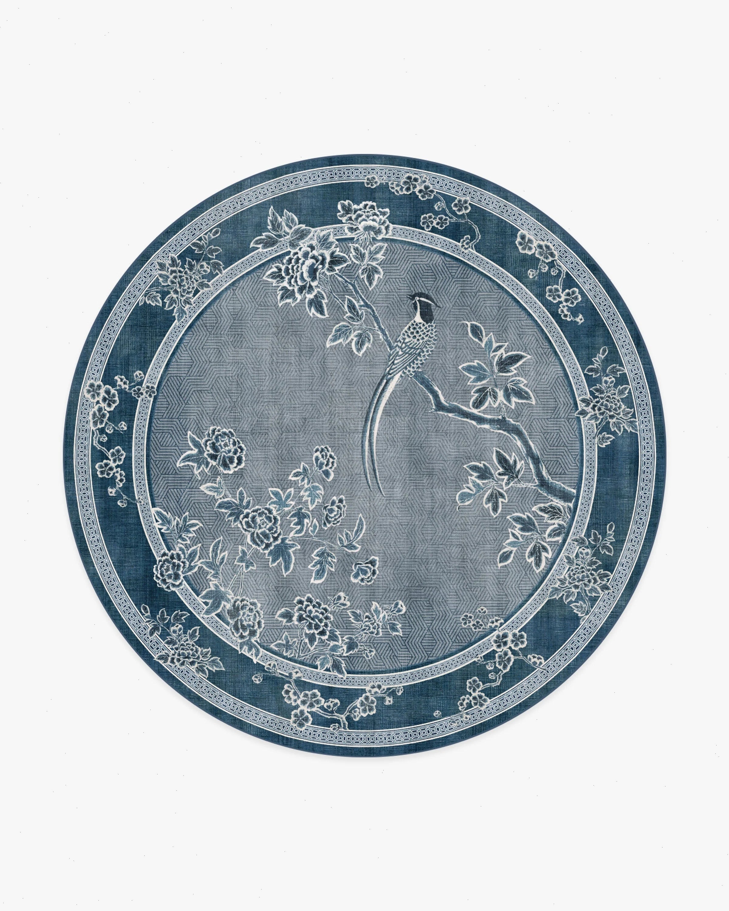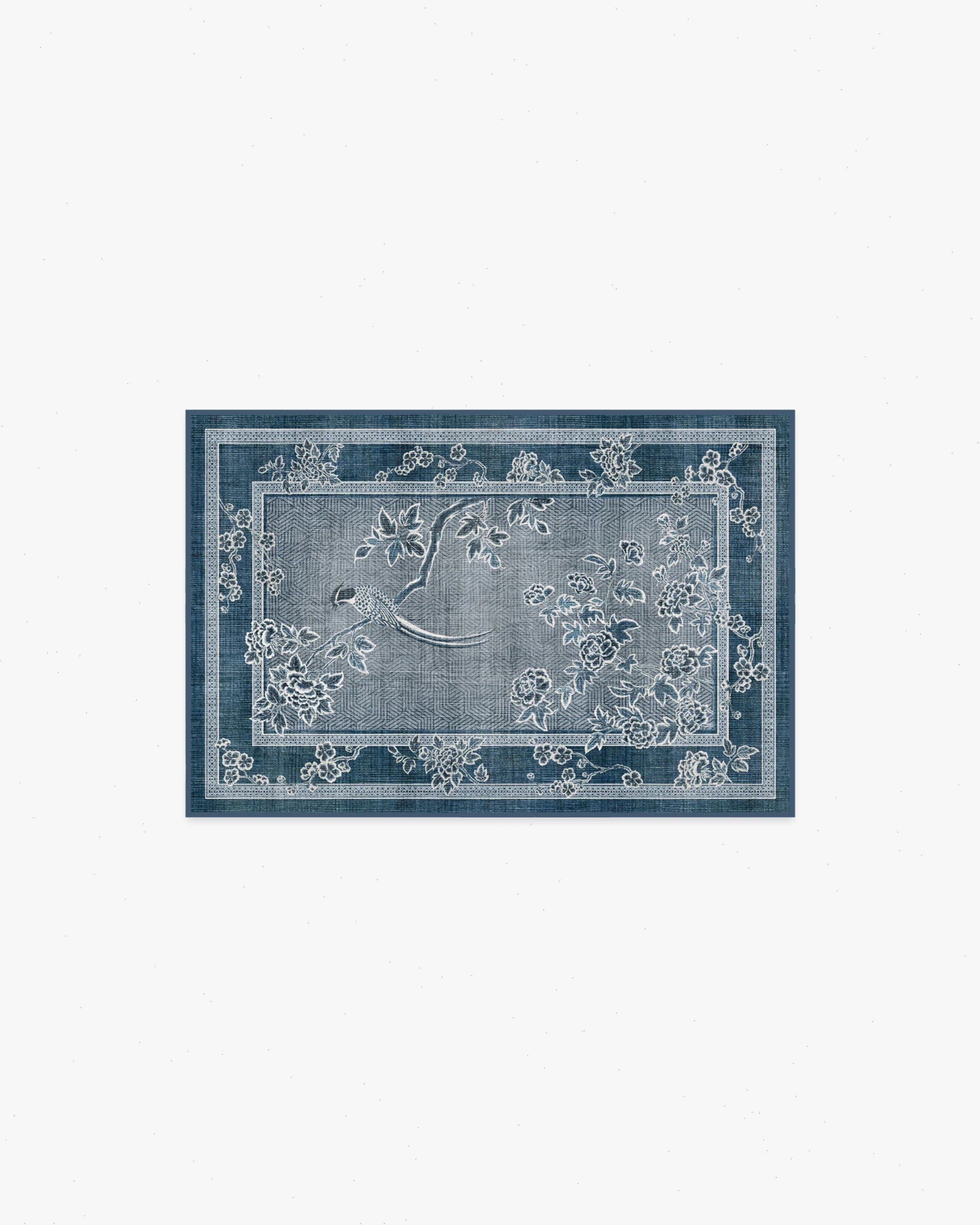 Inspired by handpainted Chinese landscape paintings, our Gracie Draper Blue Rug features bold floral and bird motifs with an antique feel. Subtle patterning appears in the border, enhancing the illusion of an infinite landscape. Its palette of deep lapis blues, silvery-slate blues, and creamy whites blend beautifully, giving the pattern a delicate quality. Water-resistant, stain-resistant, and machine-washable. Rug colors may vary slightly according to your device and the lighting in your space.