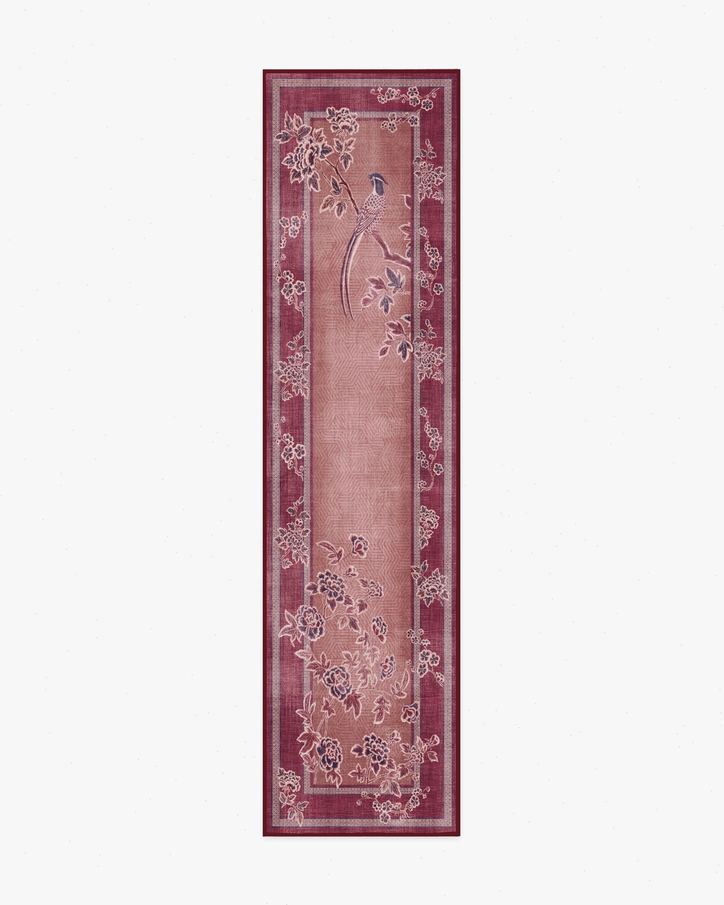 Inspired by handpainted Chinese landscape paintings, our Gracie Draper Burgundy Rug features bold floral and bird motifs with an antique feel. Subtle patterning appears in the border, enhancing the illusion of an infinite landscape. Its palette of rich berry, dark navy blue, palet dusty pinks, and alabaster whites blend beautifully, giving the pattern a delicate quality. Water-resistant, stain-resistant, and machine-washable. Rug colors may vary slightly according to your device and the lighting in your space.