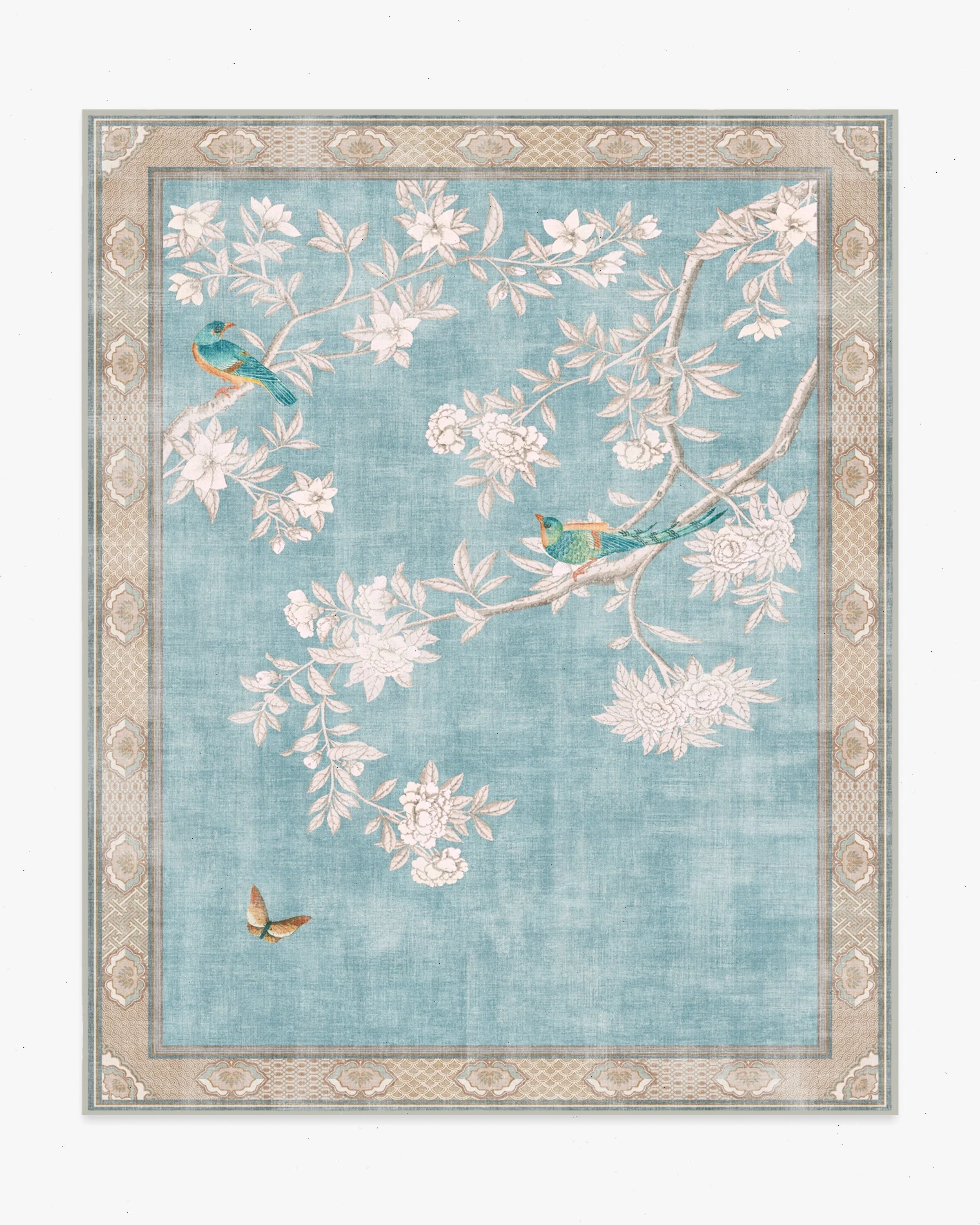 Inspired by handpainted Chinese artistry, Gracie Hampton Soft Blue Rug features richly-colored birds and butterflies, framed by subtle patterns. A soft palette of graphite-colored florals, blue-greens, dusty reds, soft oranges, and yellows pops beautifully against a soft robin's egg blue background. Water-resistant, stain-resistant, and machine-washable. Rug colors may vary slightly according to your device and the lighting in your space.