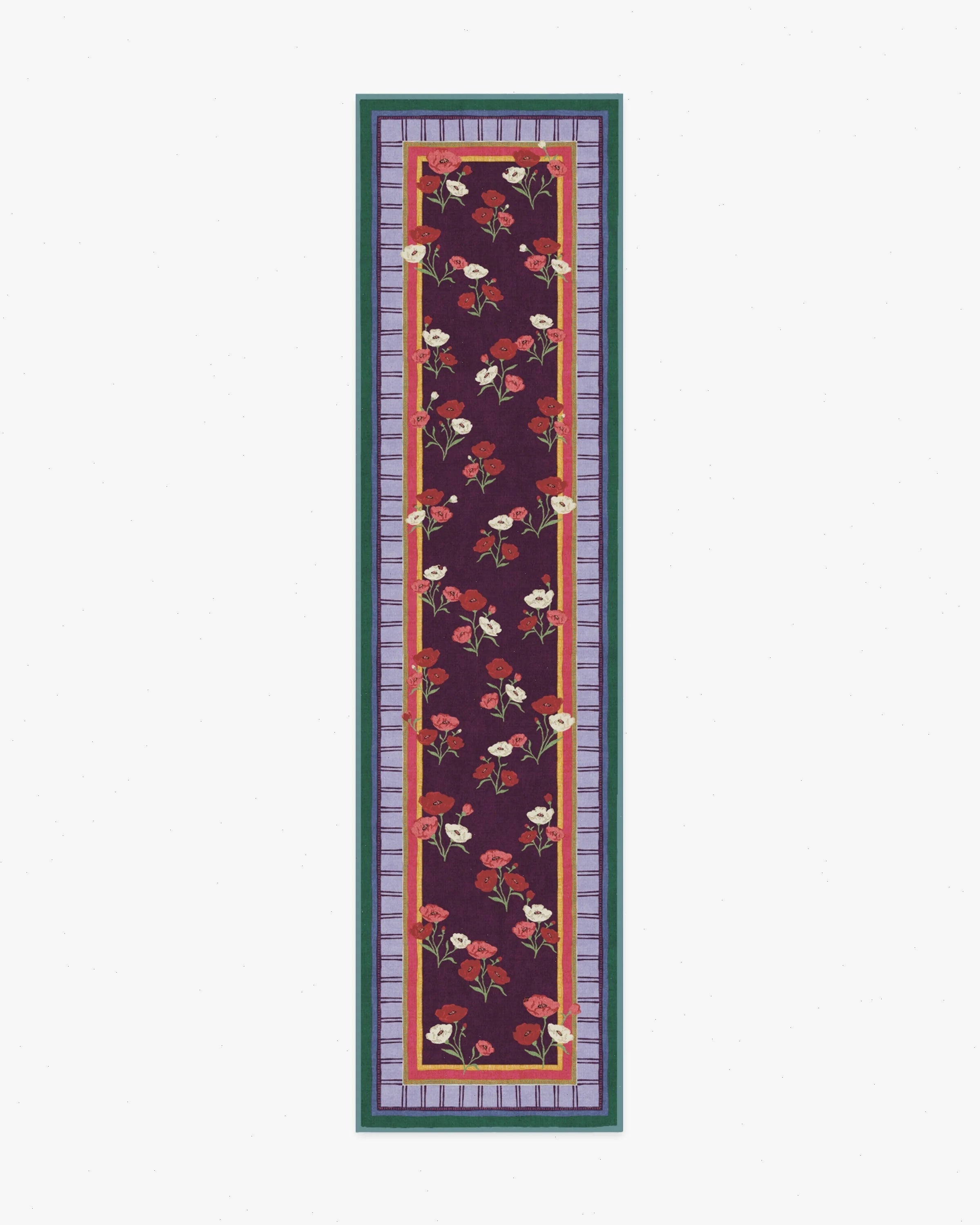 BACK BY POPULAR DEMAND: Step into a garden of creativity with our Limited Edition Iris Apfel Ambroeus Royal Plum Rug. Inspired by Iris' collection of vintage textiles and heirloom, hand-painted scarves, this blooming design features delicate floral motifs with ladybugs hidden among the petals. An intricate border with varied line widths complements the crimson, pink, and white poppies that stretch beautifully against a royal plum background. Bright marigold yellow, pink, light purple, and deep blue-green blend in the lively-colored border. Water-resistant, stain-resistant, and machine-washable. Rug colors may vary slightly according to your device and the lighting in your space.