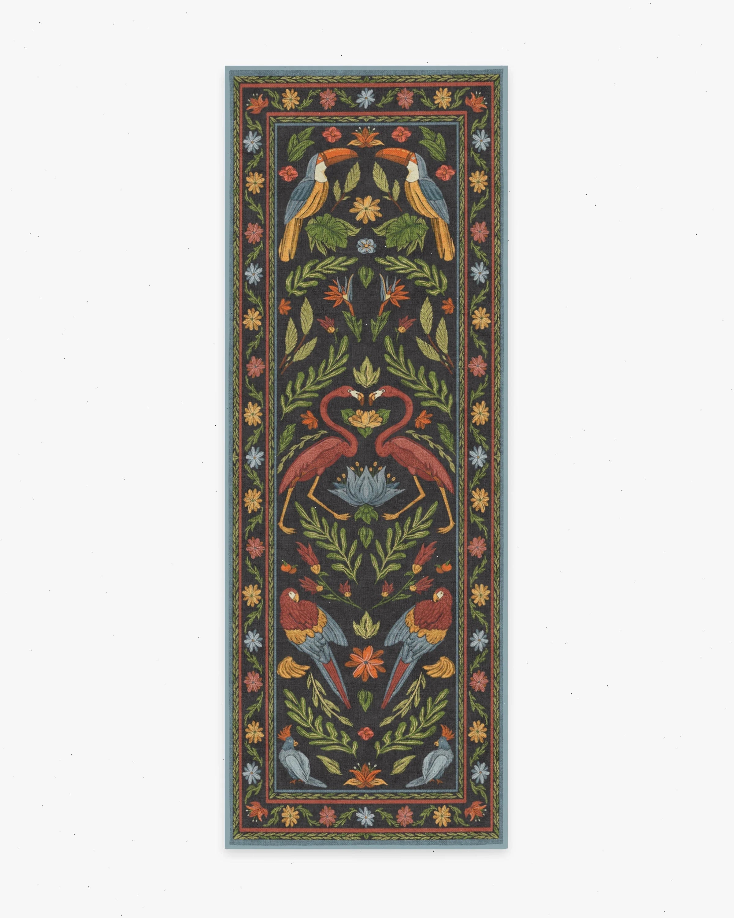 Im-peck-able. Our Birds of a Feather Rug is a bold and bright celebration of tropical birds - including toucans, parrots, and flamingos. This mirrored design boasts a warm-toned color palette of pink, orange, yellow, and blue. Set against a charcoal background, the bold contrast evokes lively, playful energy, similar to that of the exotic birds depicted. Water-resistant, stain-resistant, and machine-washable.