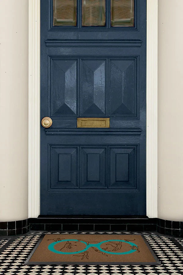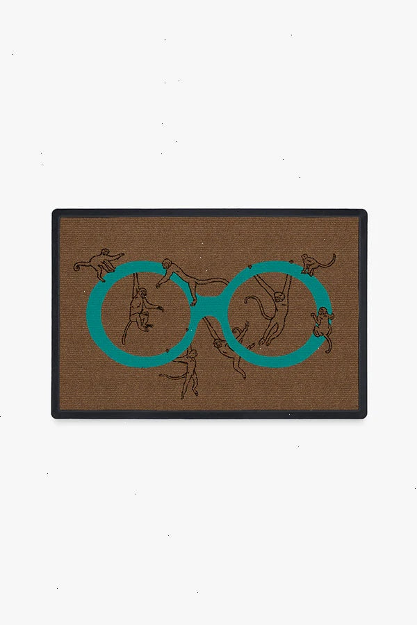 Go bananas! Our Iris Apfel Monkey See Monkey Do Turquoise Doormat features Iris's iconic bold-framed spectacles in turquoise, with her favorite animal - monkeys - playfully swinging and climbing on them. The quirky graphic is set against a dark coir-colored background. Made from our durable, machine-washable material that is mold and fade-resistant, making it perfect for any indoor or outdoor space.