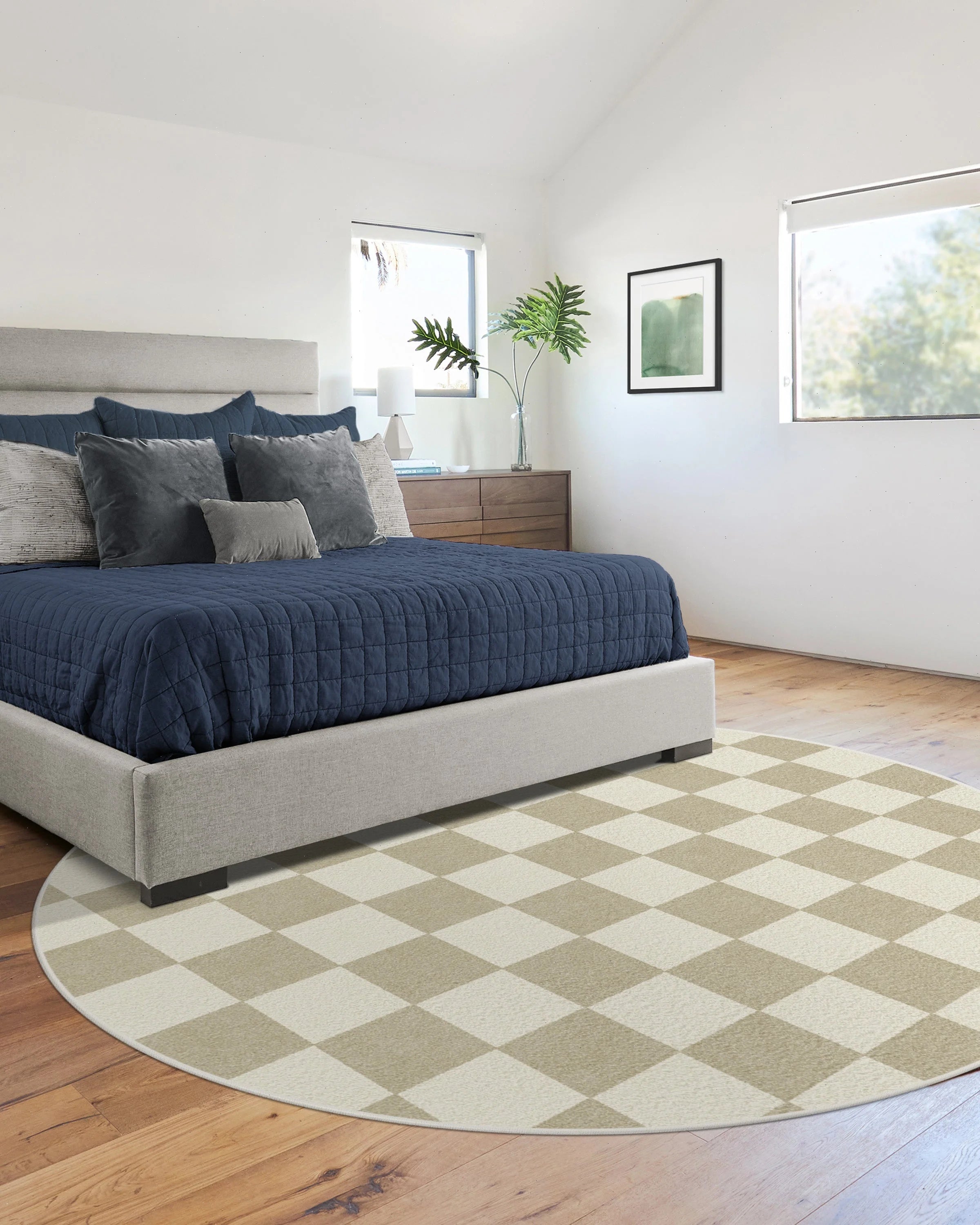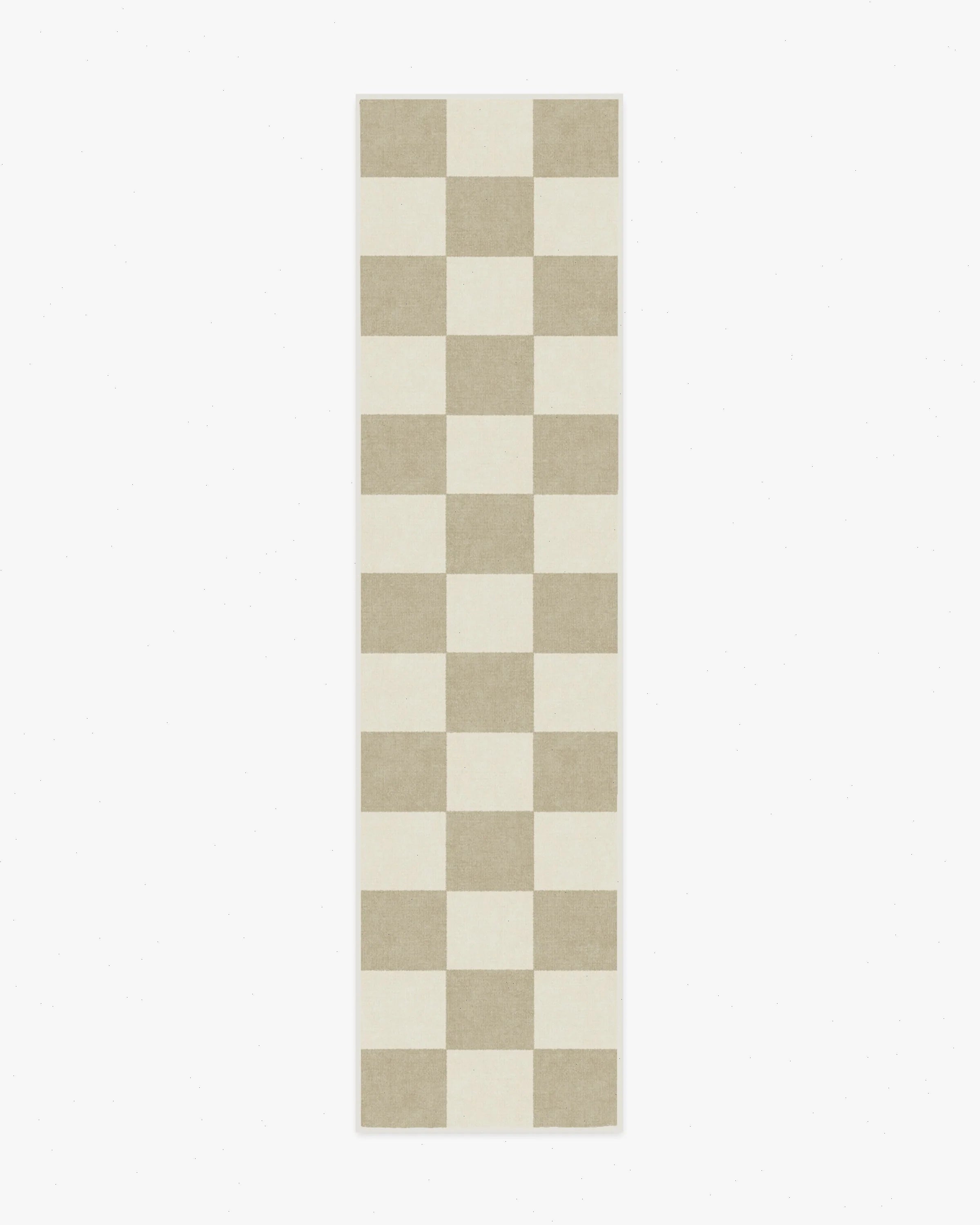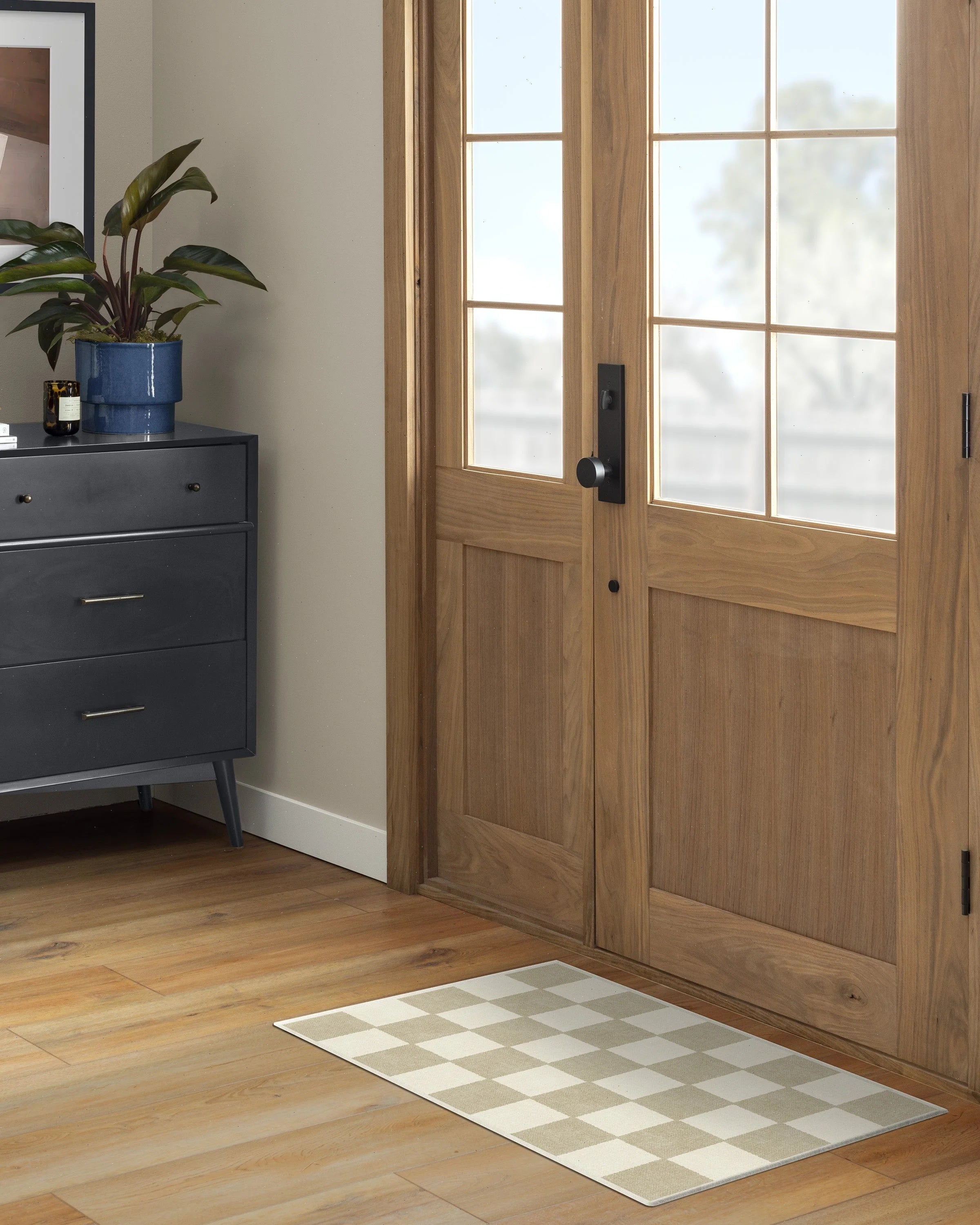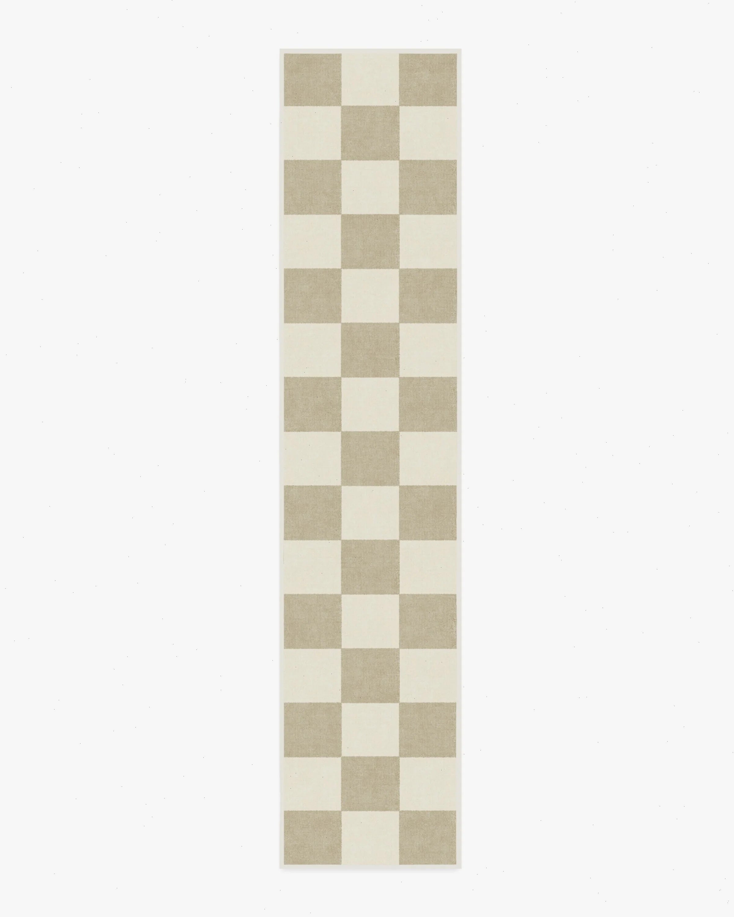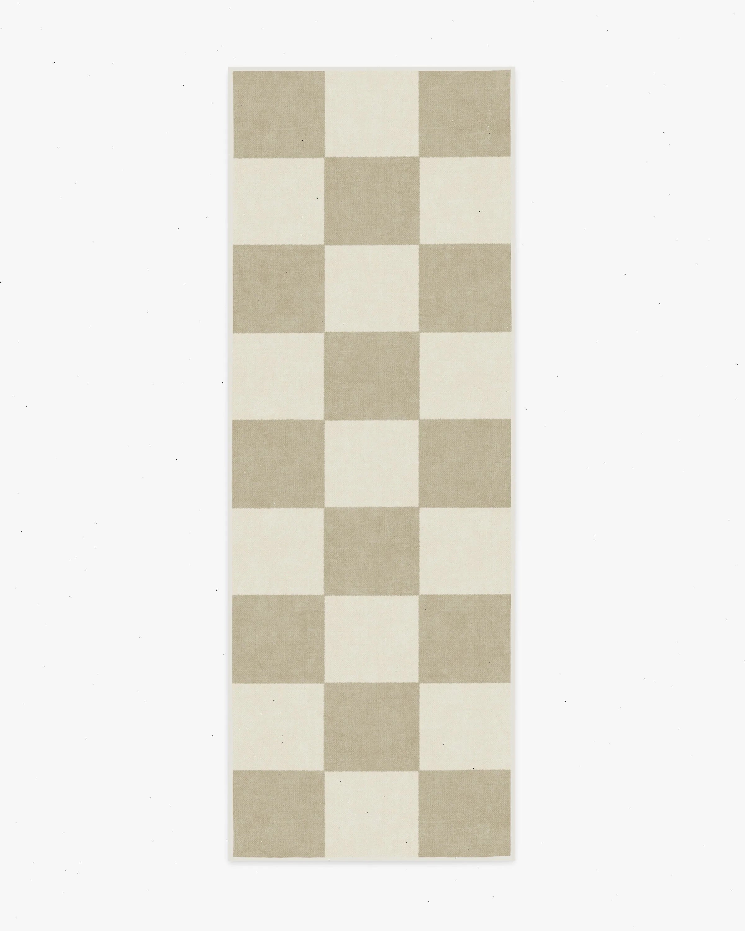 Let's play. Our Jaque Checkered Stone Rug brings washability to a classic checkerboard design, mixing warm, soft cappuccino squares against a soft pearl background. Water-resistant, stain-resistant, and machine-washable.
