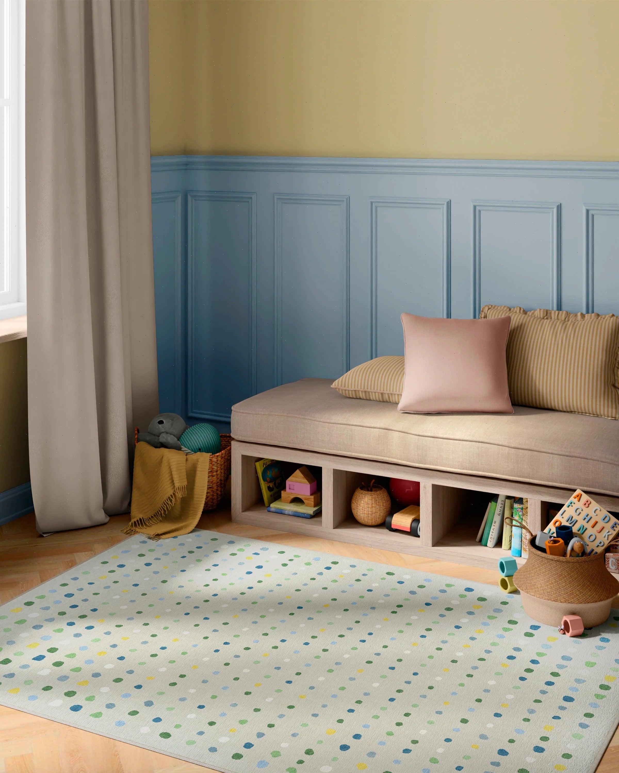 We’re connecting all the dots. The Jelly Dot Neutral Rug splashes painterly dots across a soft beige backdrop for a playful, energetic look. Tonal shades of green and blue with pops of yellow add a subtle yet cheerful touch to any room. Water-resistant, stain-resistant, and fully machine-washable. Colors may vary by device and lighting.