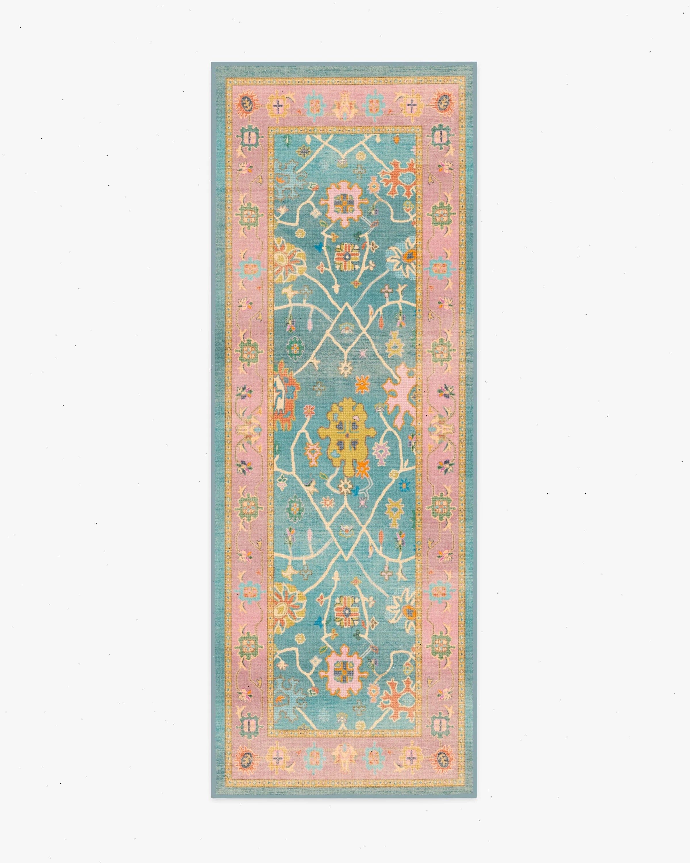 Bring the romance, without the drama, with our Regency-era Jemima Multicolor Rug. Inspired by timeless Oushak rugs, this pink-bordered, opulent design has a playful blend of bright chartreuses, reds, and oranges placed atop a warm blue background. Water-resistant, stain-resistant, and machine-washable. Rug colors may vary slightly according to your device and the lighting in your space.