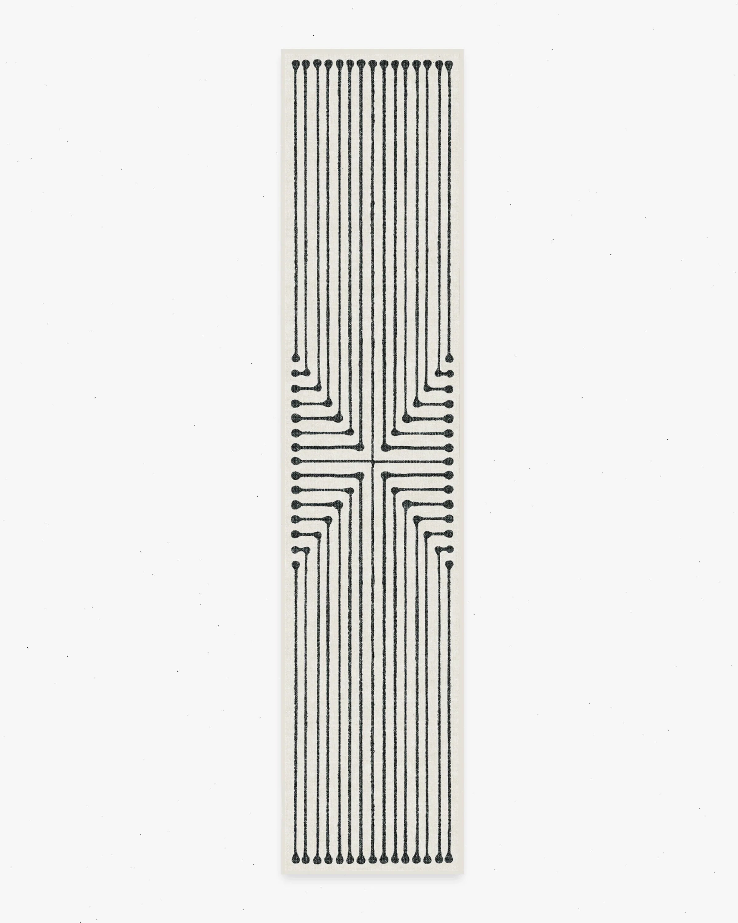 Stripes get a chic makeover. Ink-inspired lines form a striped, geometric pattern on this black and ivory rug. Water-resistant, stain-resistant, and machine-washable.