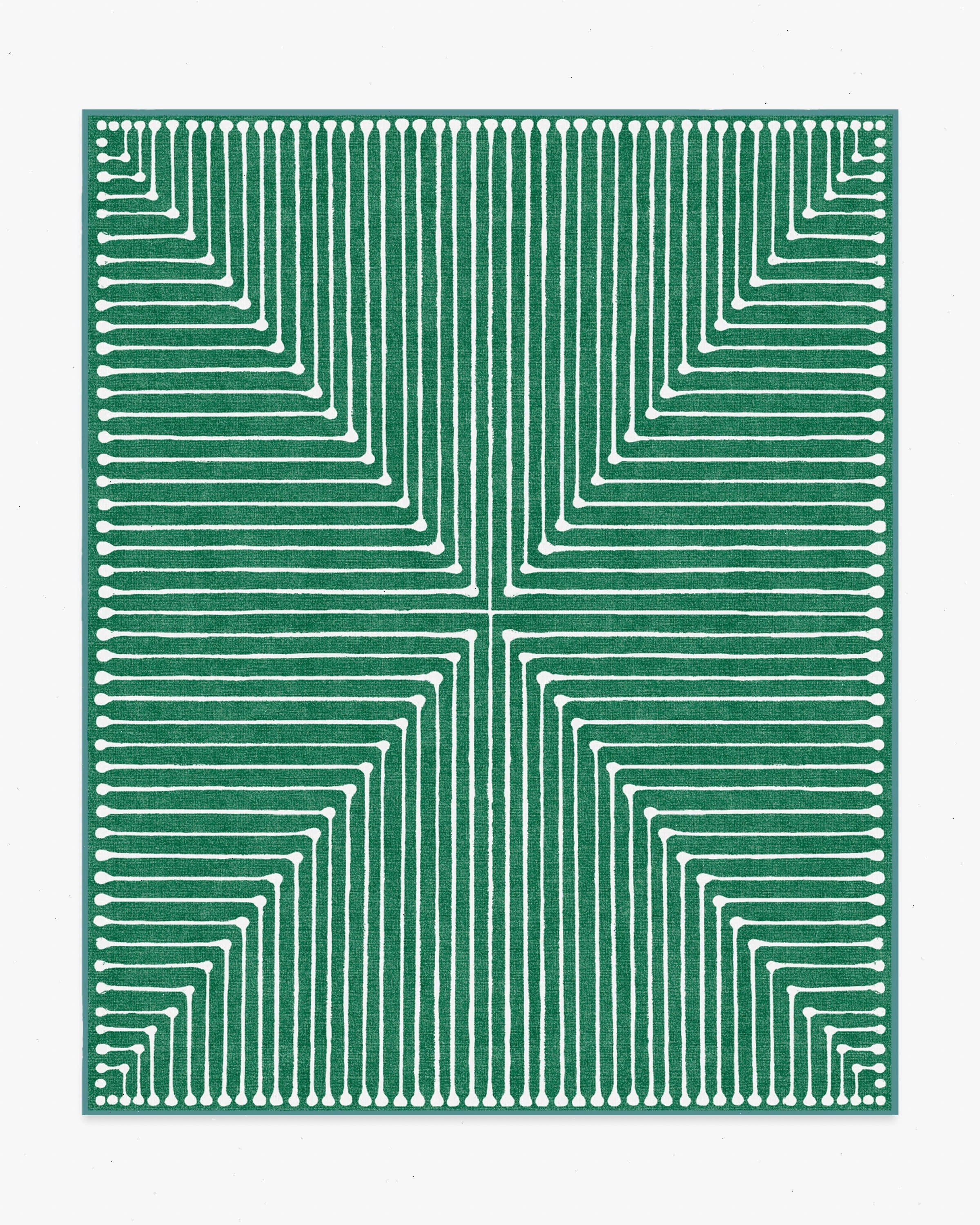 Effortlessly glam. Ink-inspired lines make up a striking triangular design on this geometric rug, beautifully done in ivory on a green background. Water-resistant, stain-resistant, and machine-washable. Rug colors may vary slightly according to your device and the lighting in your space.