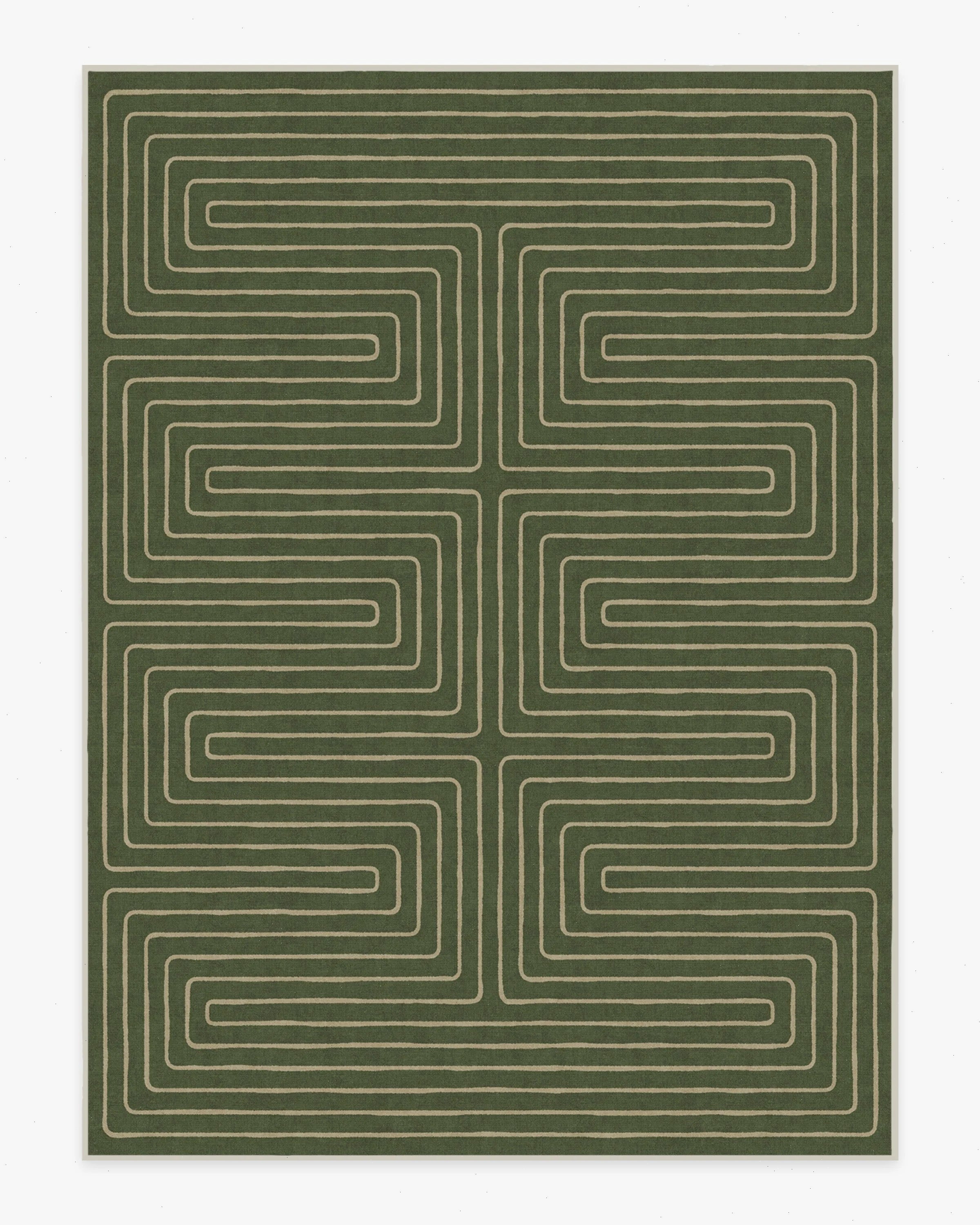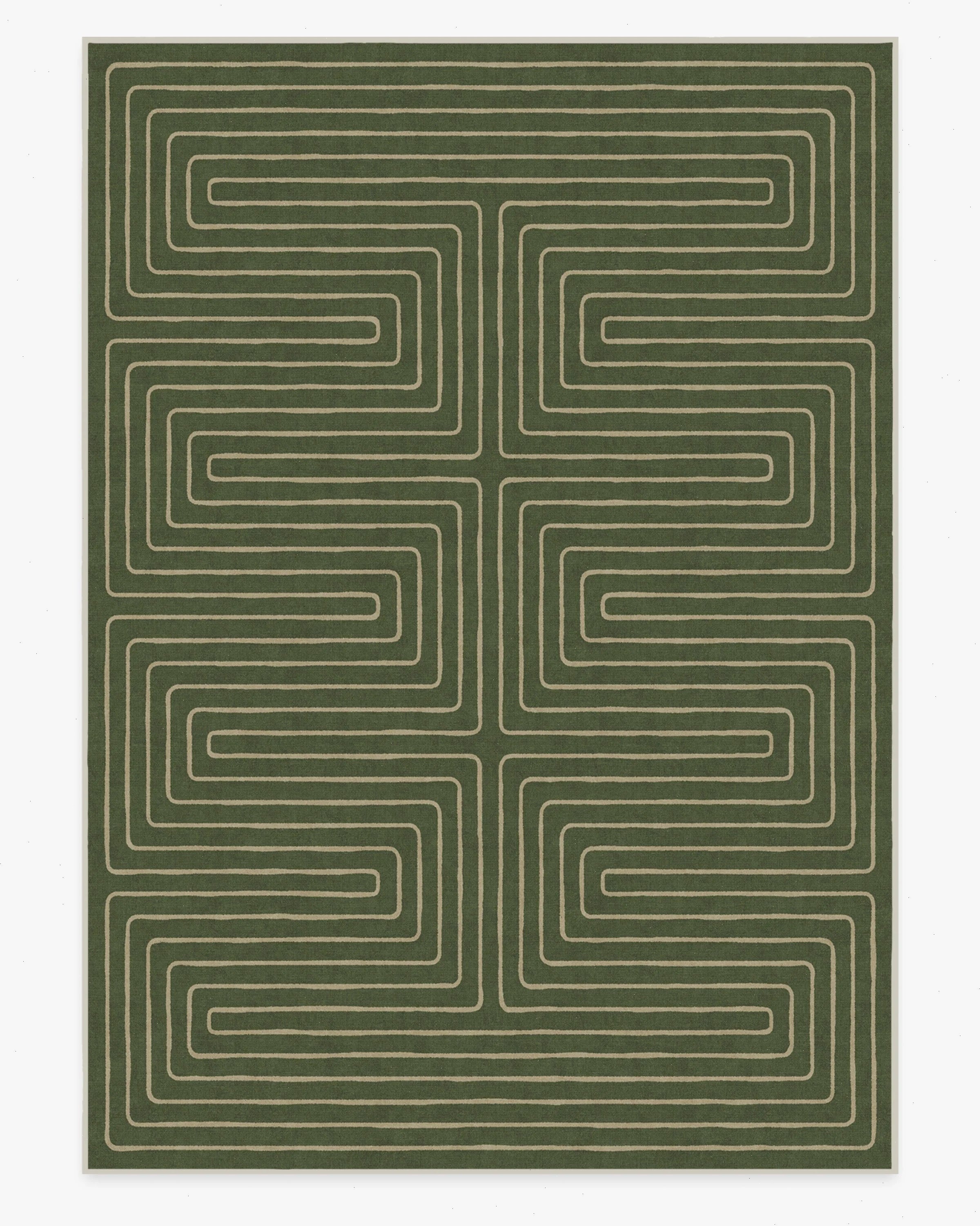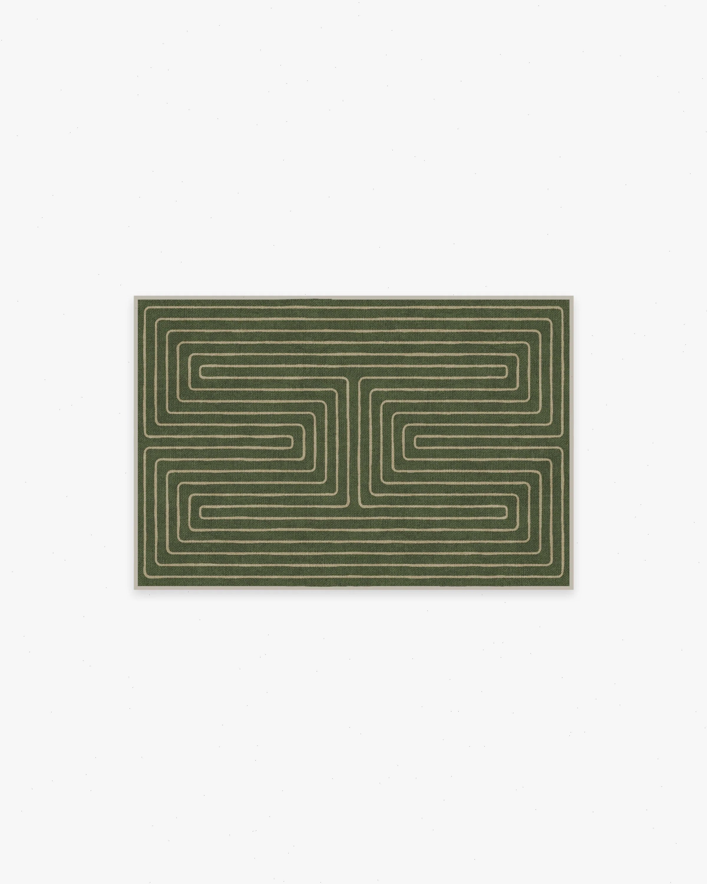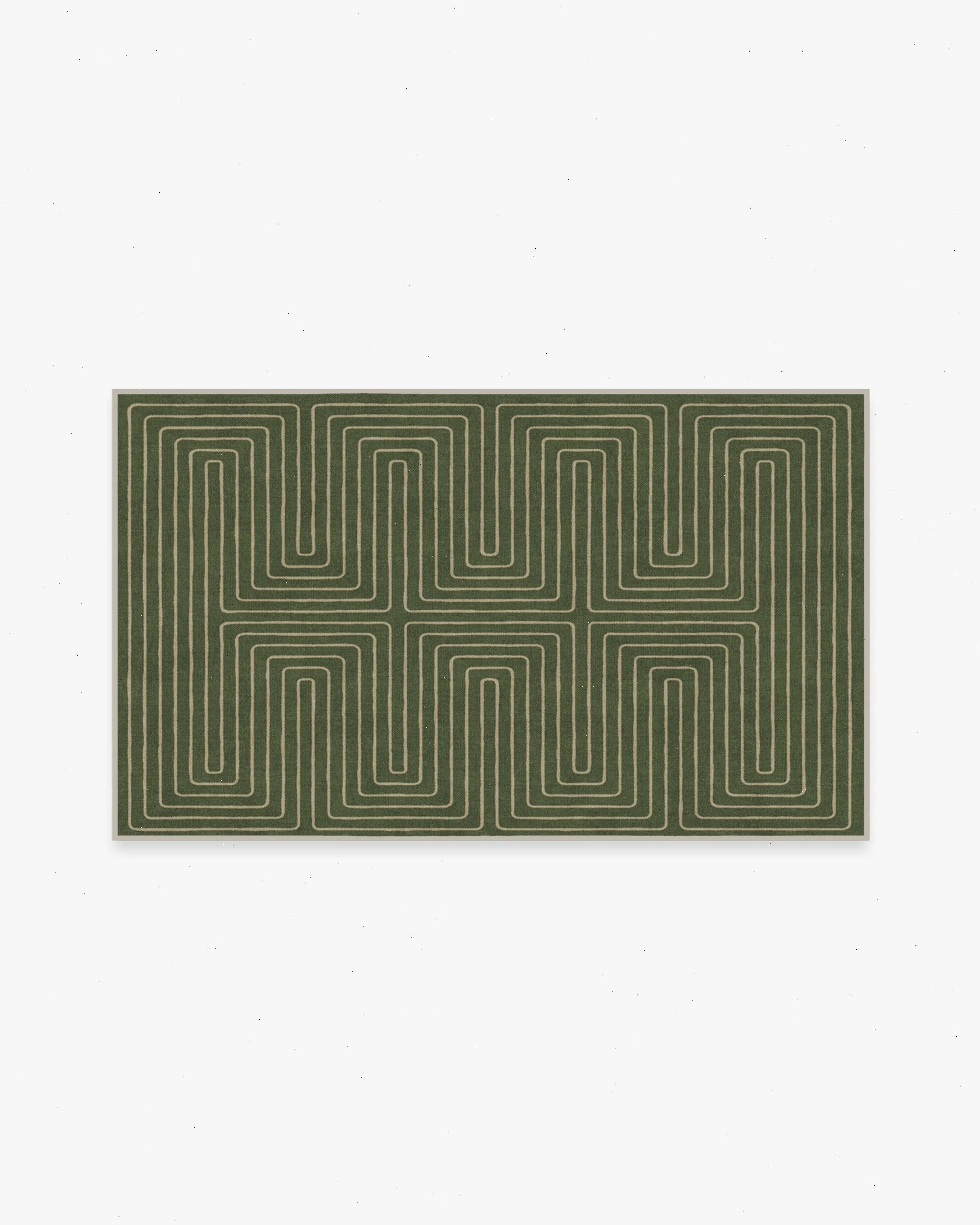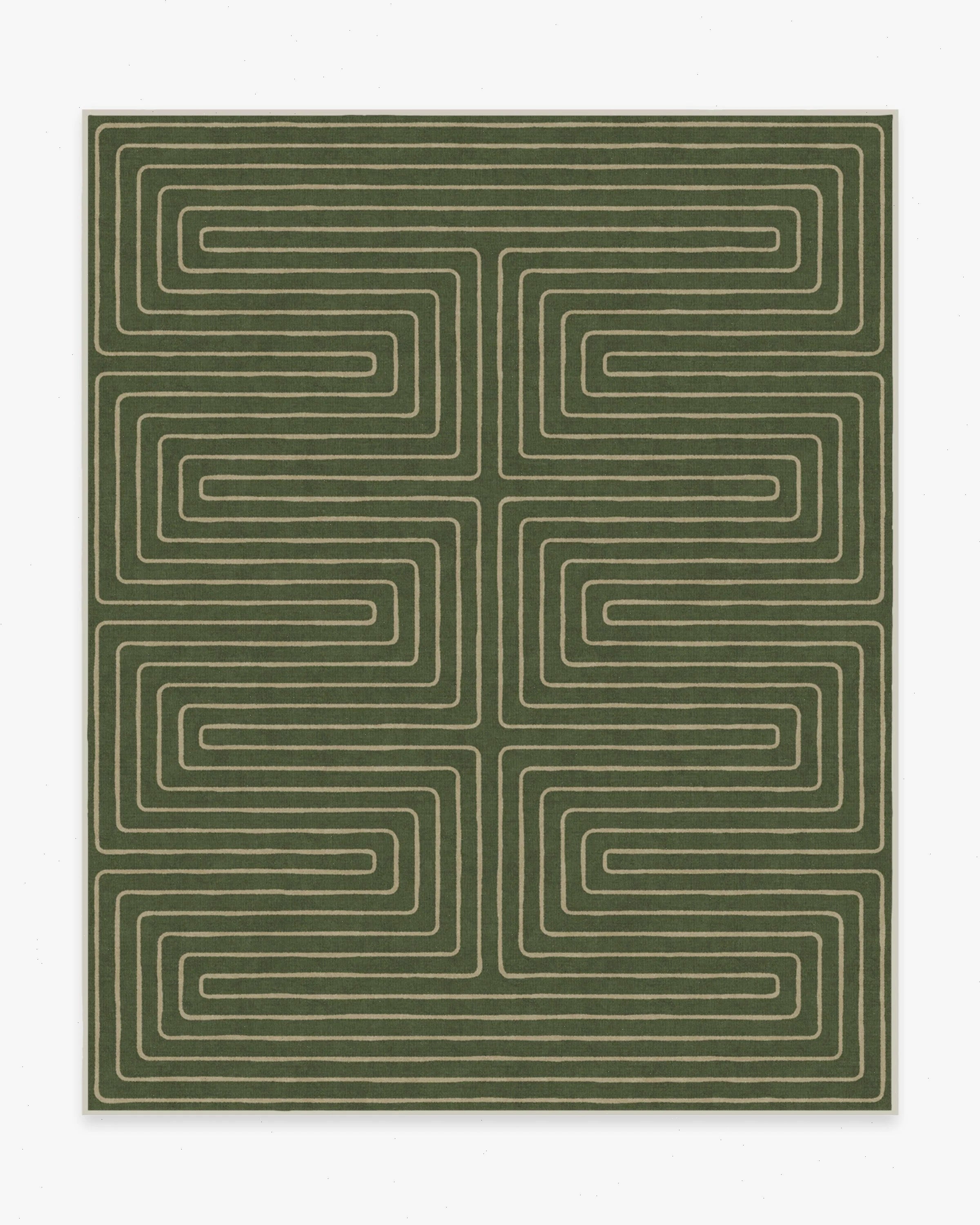 Irregular linework inspired by hand-cut paper softens a large scale maze pattern. Our Jonathan Adler Labyrinth Fern Green Rug features a continuous neutral line with a hand-drawn feel on a rich green background. Water-resistant, stain-resistant, and machine-washable. Rug colors may vary slightly according to your device and the lighting in your space.