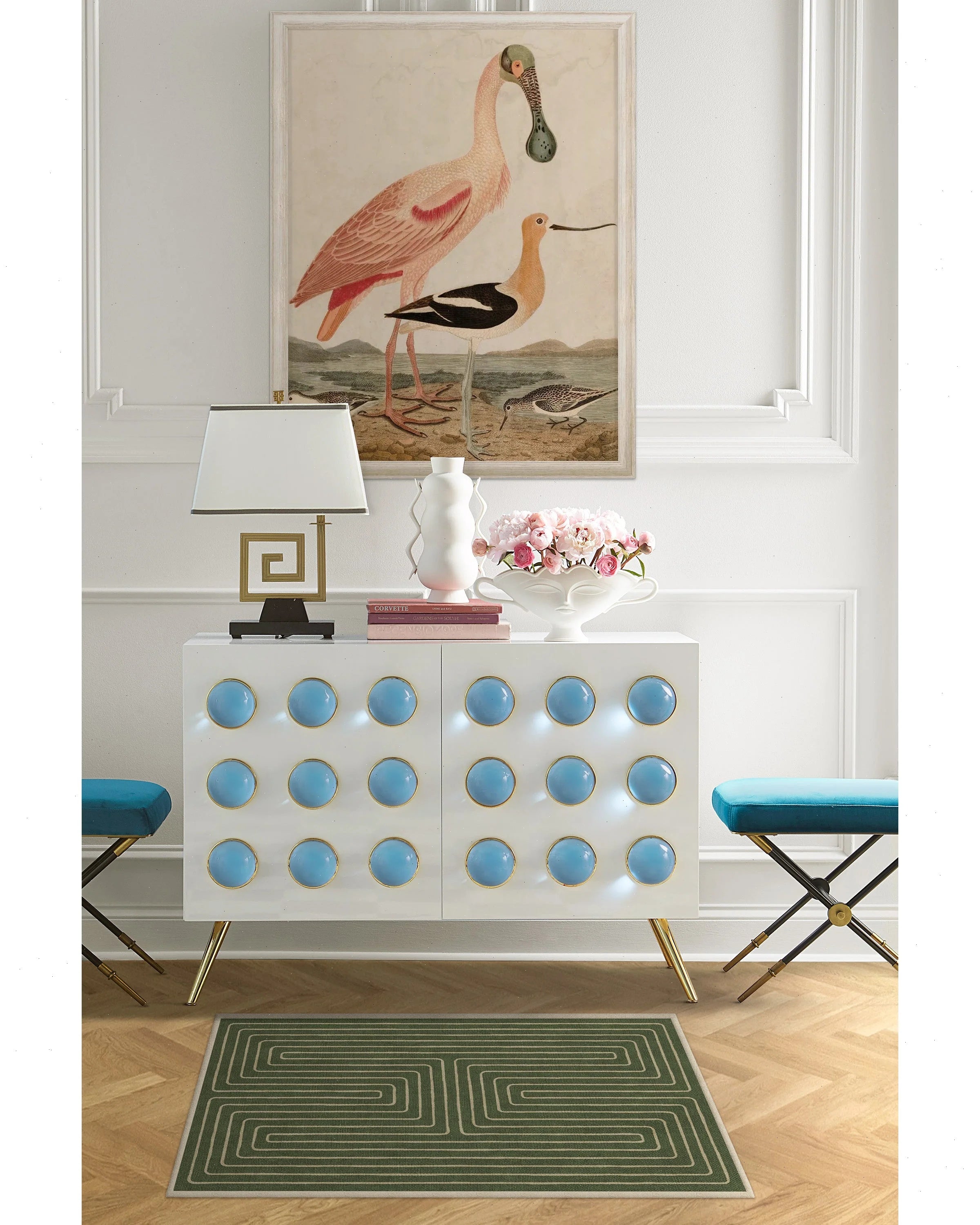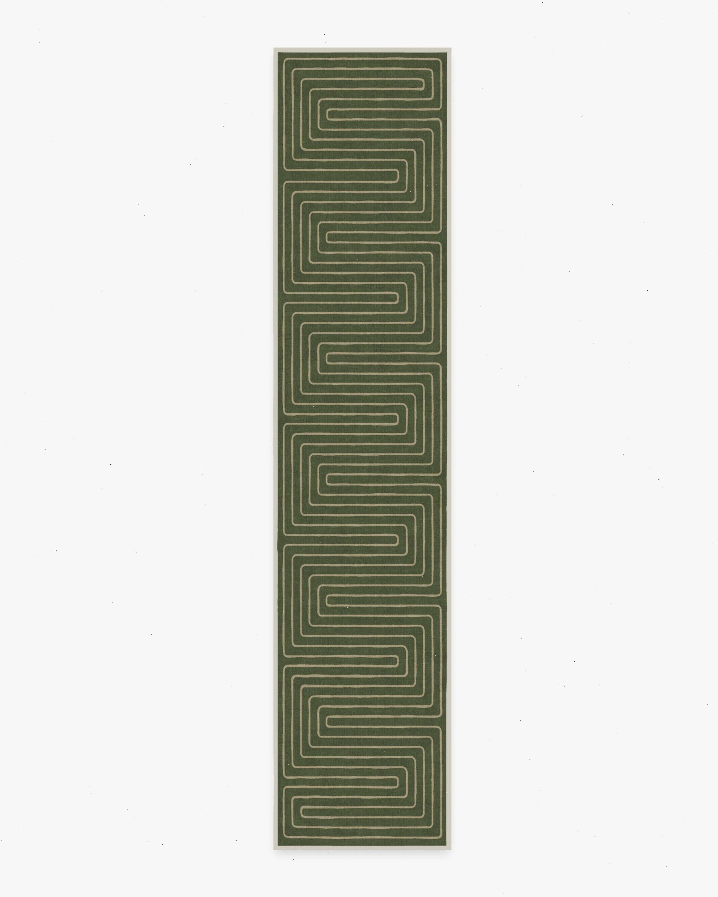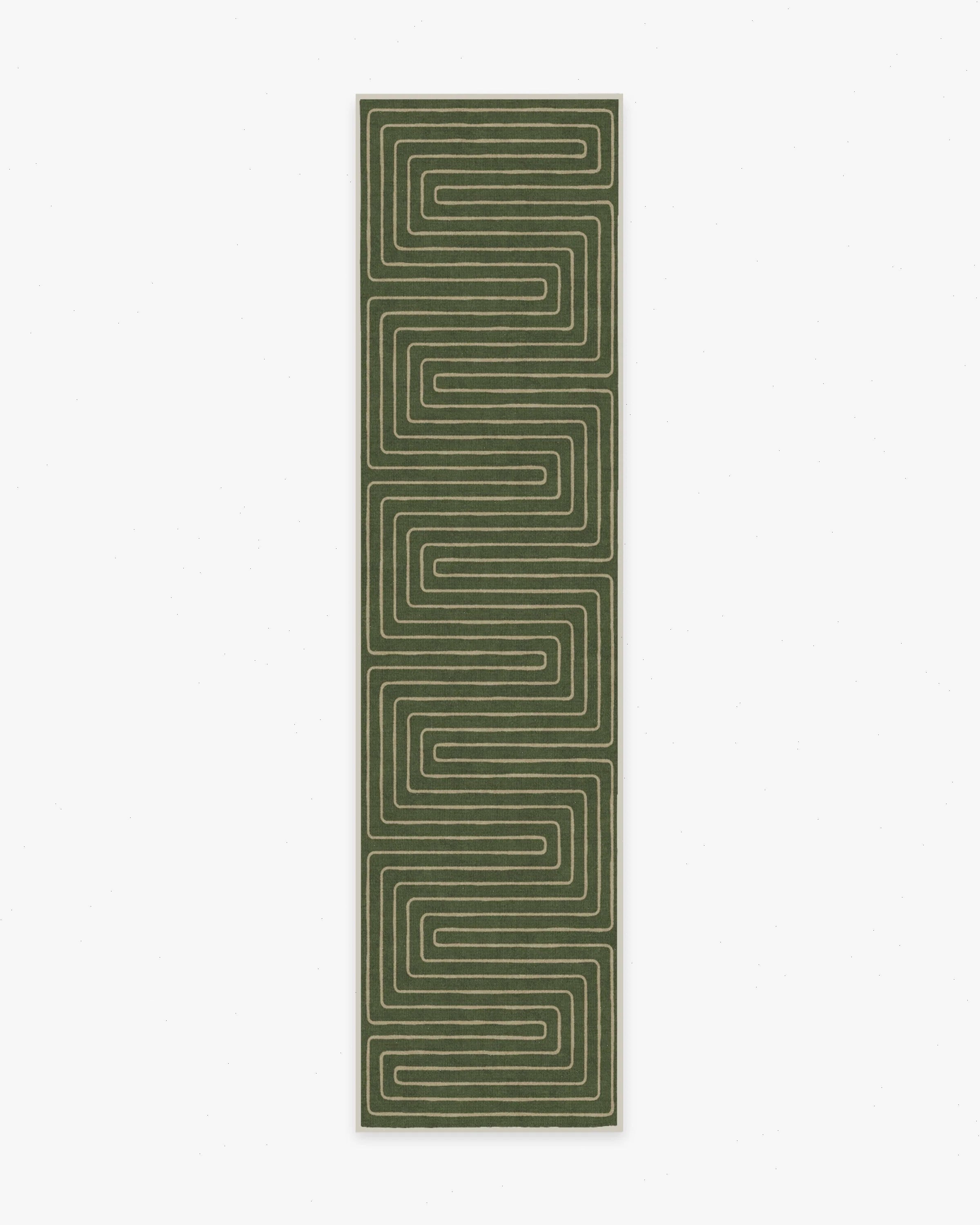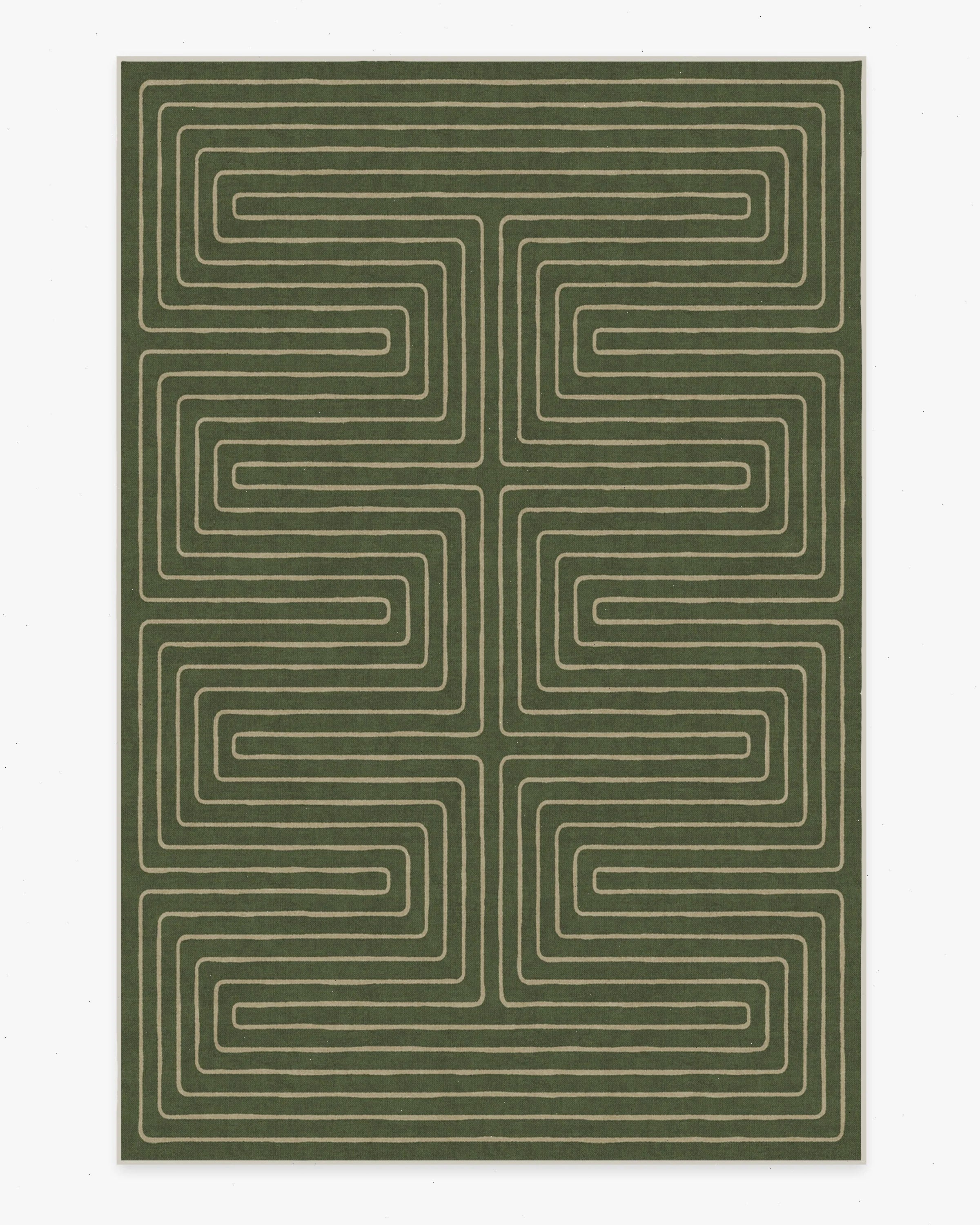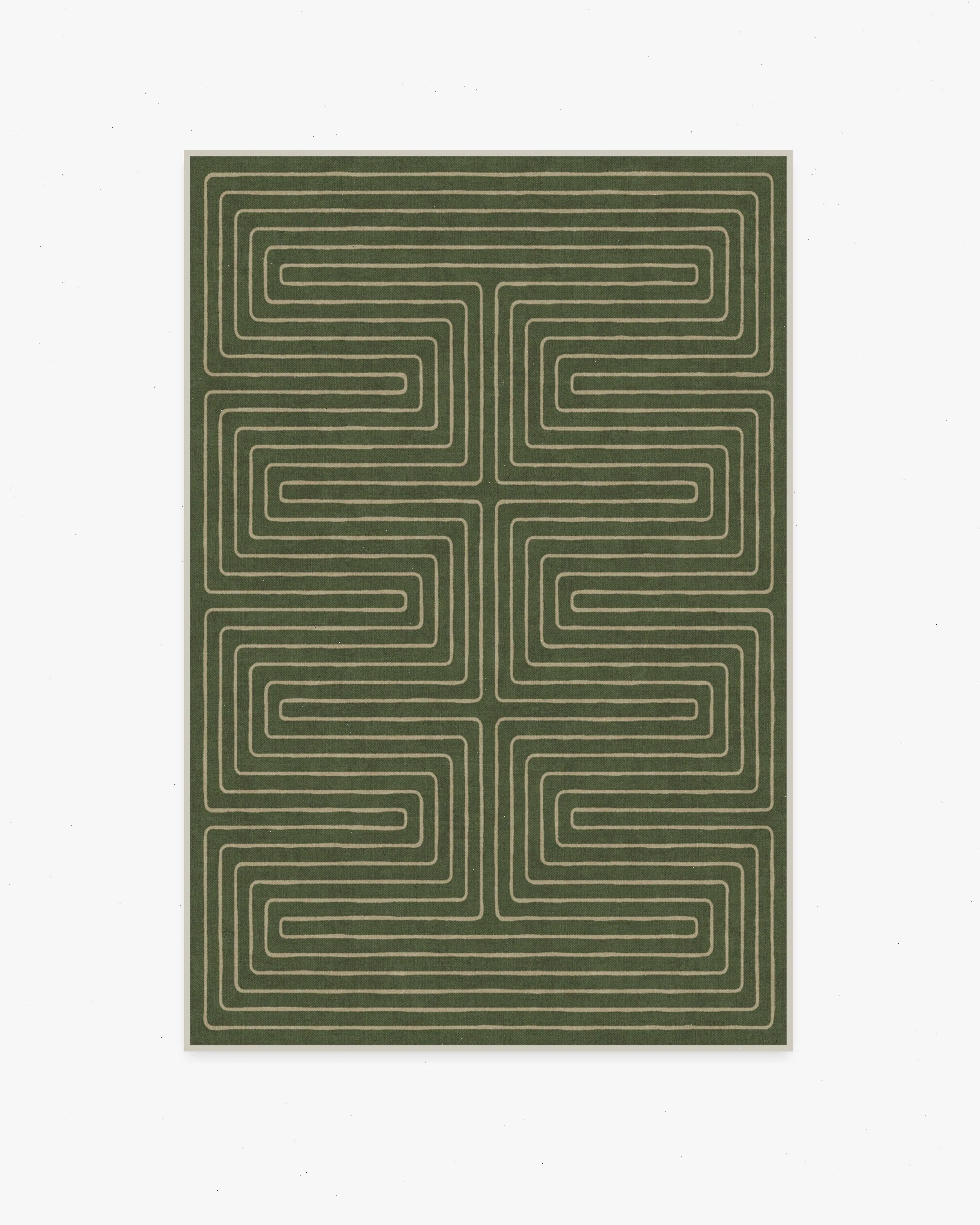 Irregular linework inspired by hand-cut paper softens a large scale maze pattern. Our Jonathan Adler Labyrinth Fern Green Rug features a continuous neutral line with a hand-drawn feel on a rich green background. Water-resistant, stain-resistant, and machine-washable. Rug colors may vary slightly according to your device and the lighting in your space.