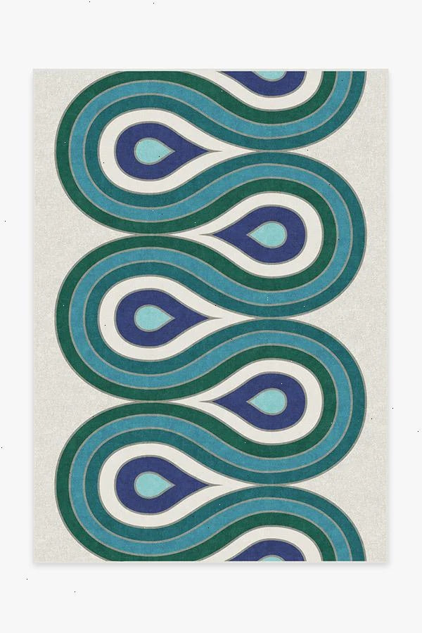 As posh as a peacock. This rug features a whimsical wave pattern in a peacock-inspired palette of emerald green, turquoise blue, royal blue, and mint green on an off-white background. Water-resistant, stain-resistant, and machine-washable.