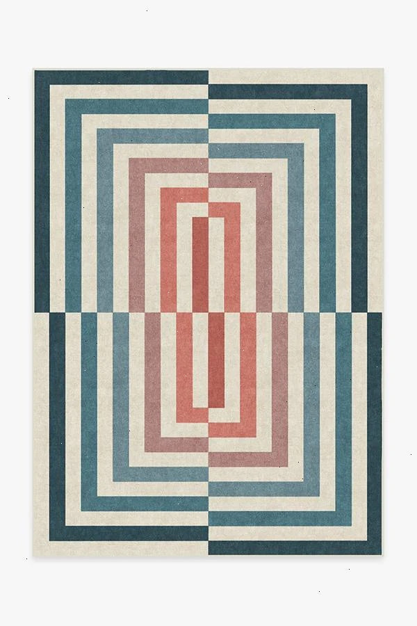 A stunning piece that commands attention. This graphic rug features a mid-century modern-inspired linear pattern in eye-catching shades of teal, mauve, coral, and terracotta. Water-resistant, stain-resistant, and machine-washable.