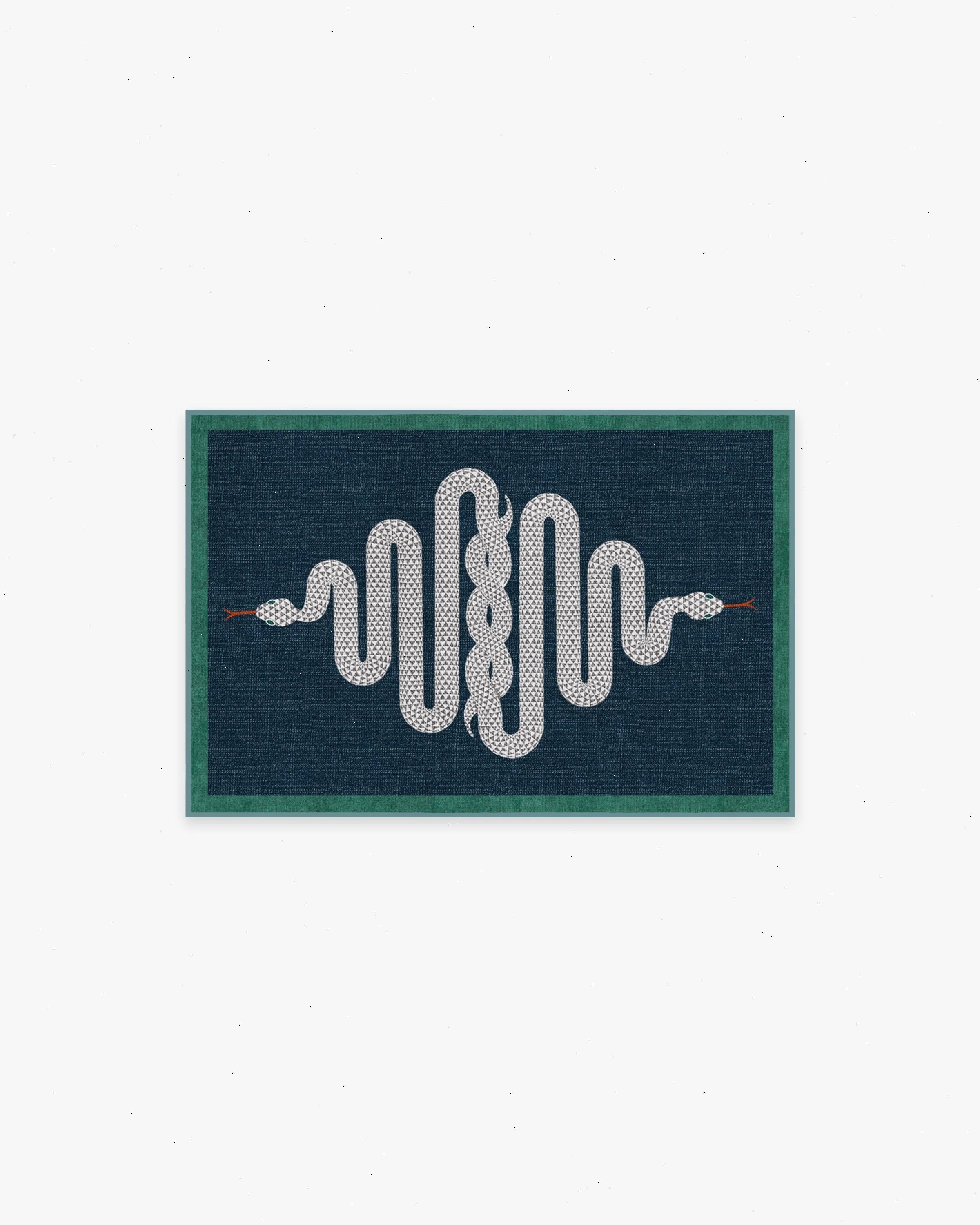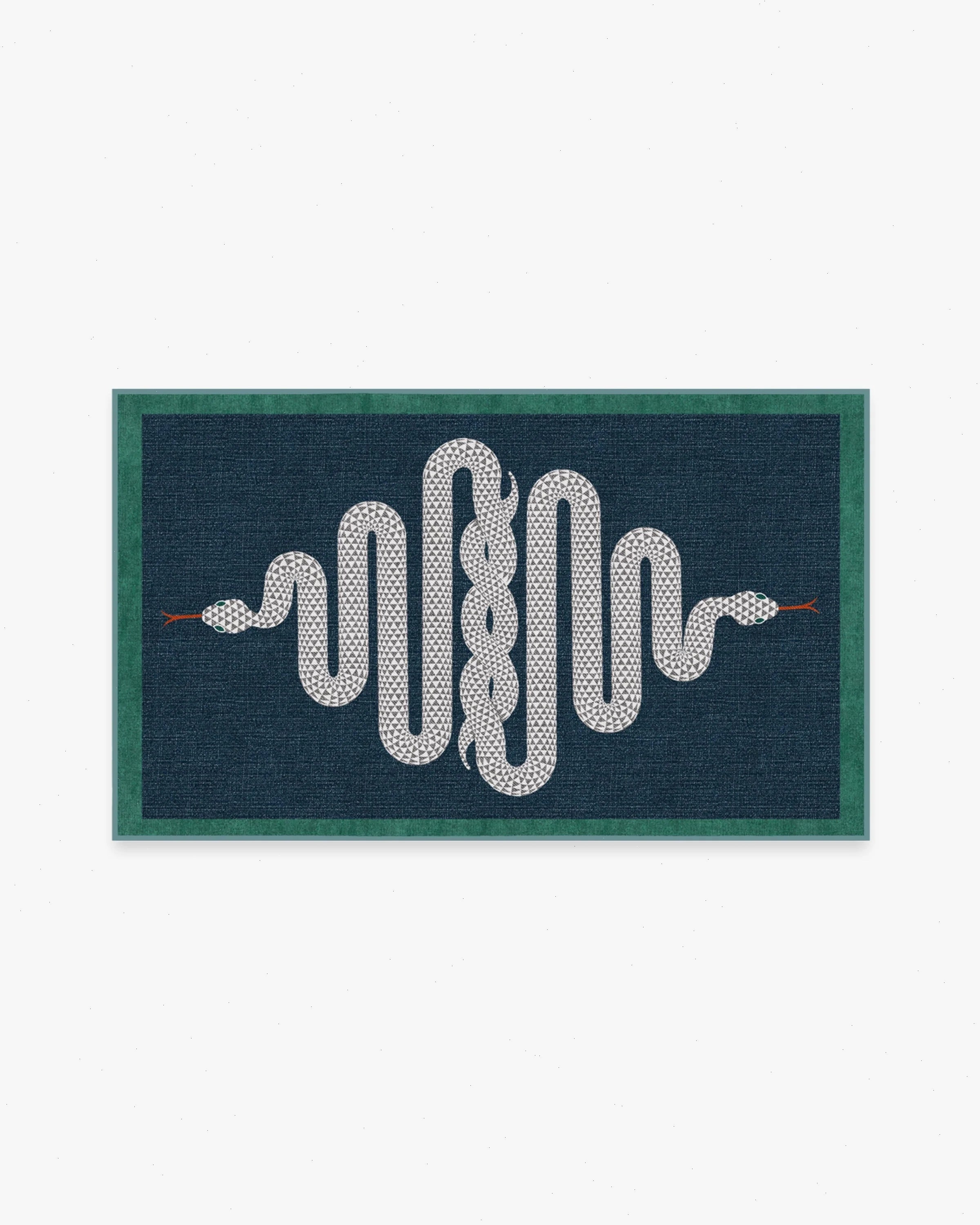 Chic and serpentine showstopper. This head-turning accent rug features two slithering serpents, intertwined on a sapphire blue background with a bottle-green border. Water-resistant, stain-resistant, and machine-washable.