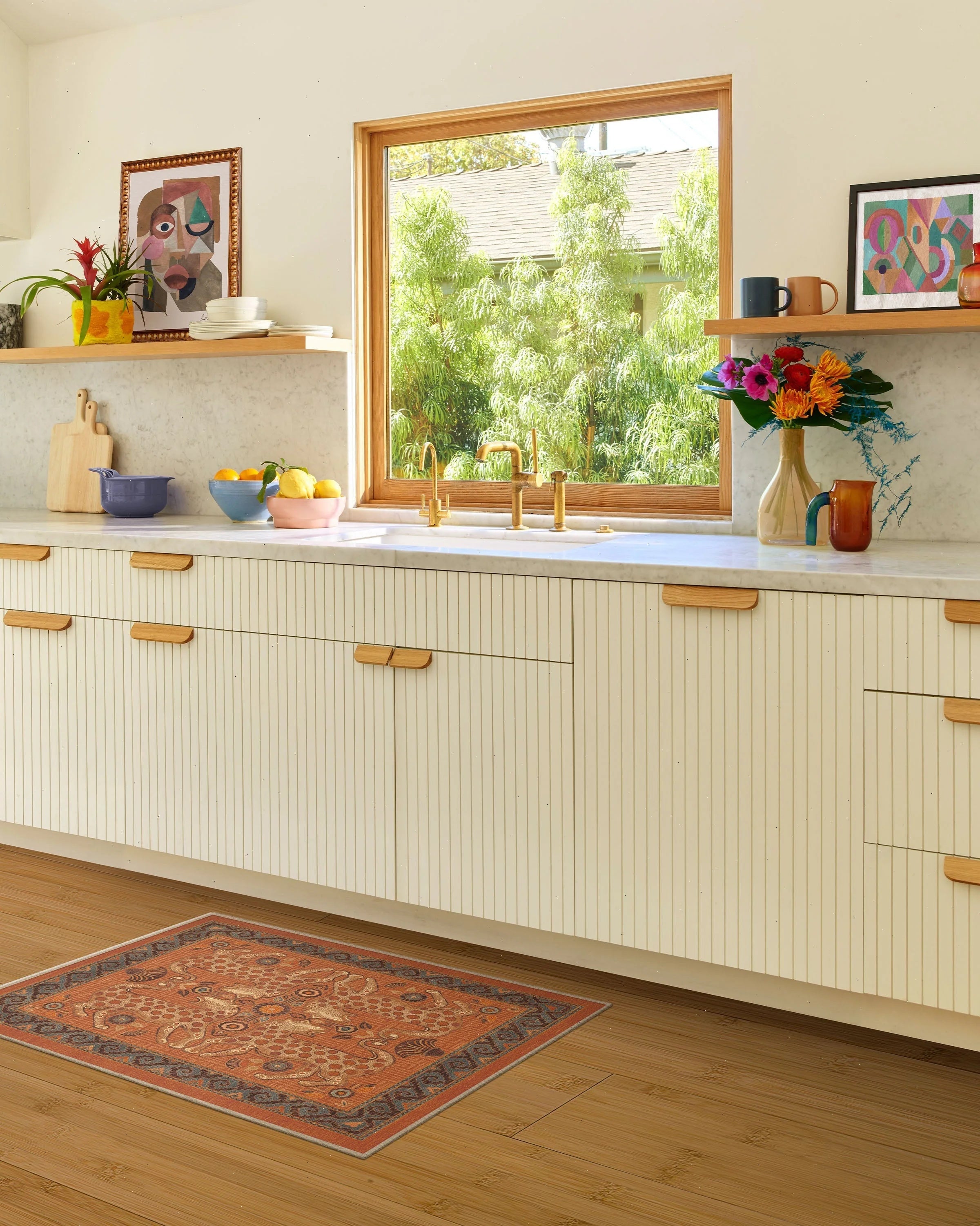 Practicality rules the kitchen. A runner near the sink adds comfort and peace of mind for spills.