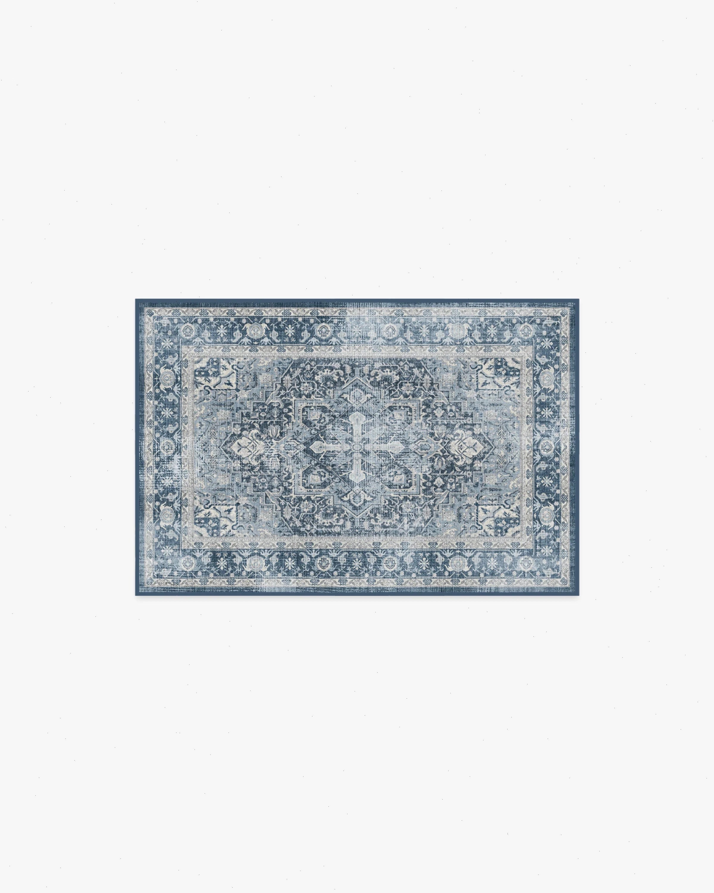 Cool and refreshing, our Kamran Admiral Blue Rug brings a distressed sophistication to a classic, Persian-inspired design. Based on traditional Heriz styles, this rug features a bold geometric pattern with a large medallion and ornate border. With a striking bold navy design that combines chambrays and soft grey tones, it's purposefully distressed for that weathered, rustic look. Water-resistant, stain-resistant, and machine-washable.