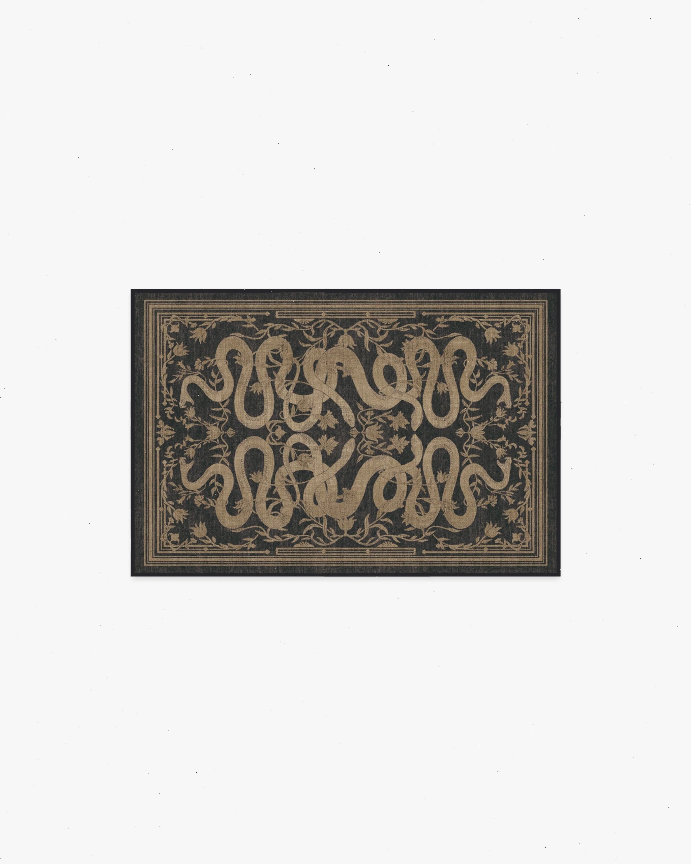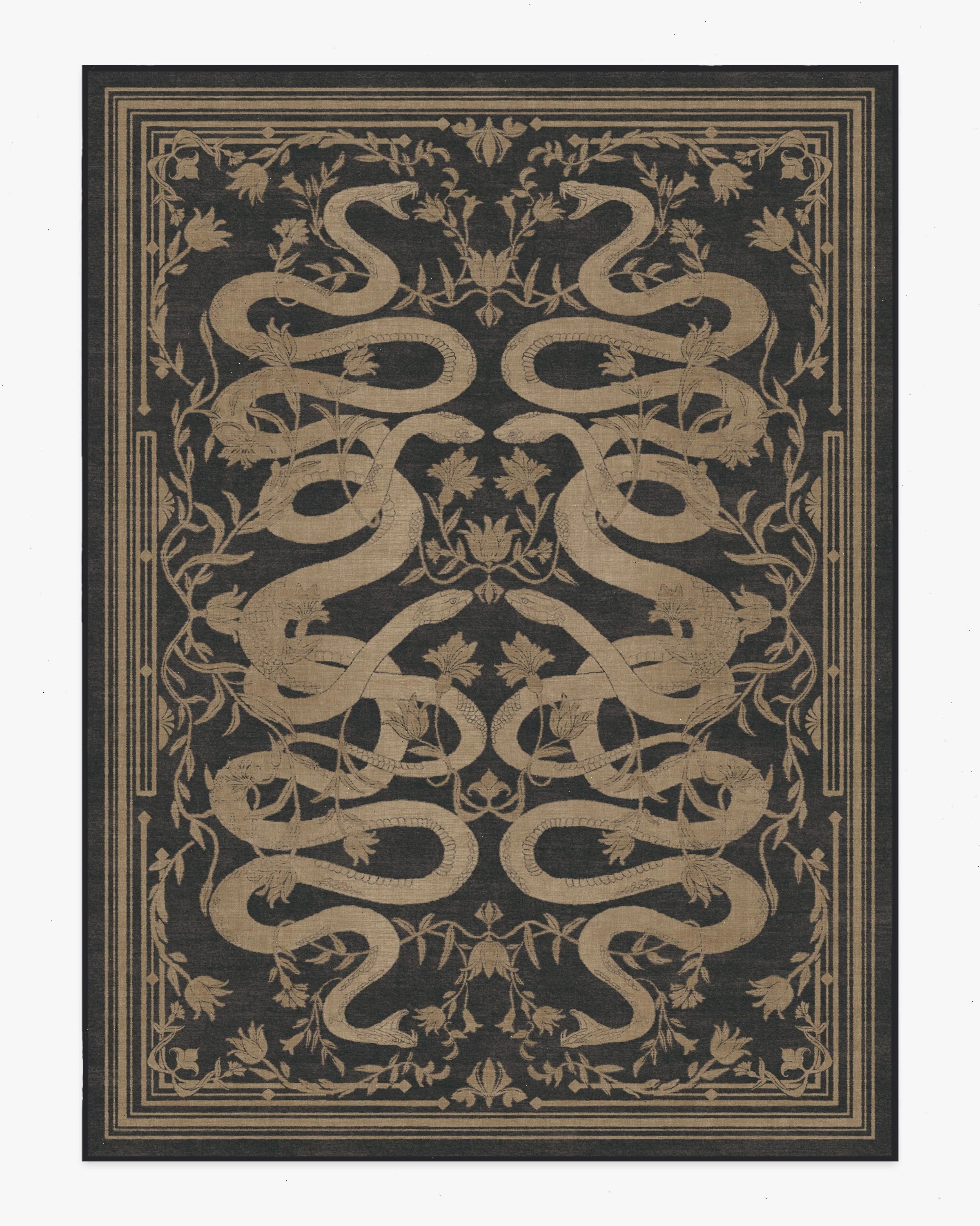 Watch stains slither away with our Martyn Lawrence Bullard Sumaya Soft Black Rug. Featuring bold and stylized mirrored snakes intertwining with intricate floral elements, this symmetrical design is complemented by a simple yet elegant decorative border. Variants of beiges and golds stand out beautifully against a deep black charcoal ground, creating a striking contrast. Water-resistant, stain-resistant, and machine-washable. Rug colors may vary slightly according to your device and the lighting in your space.