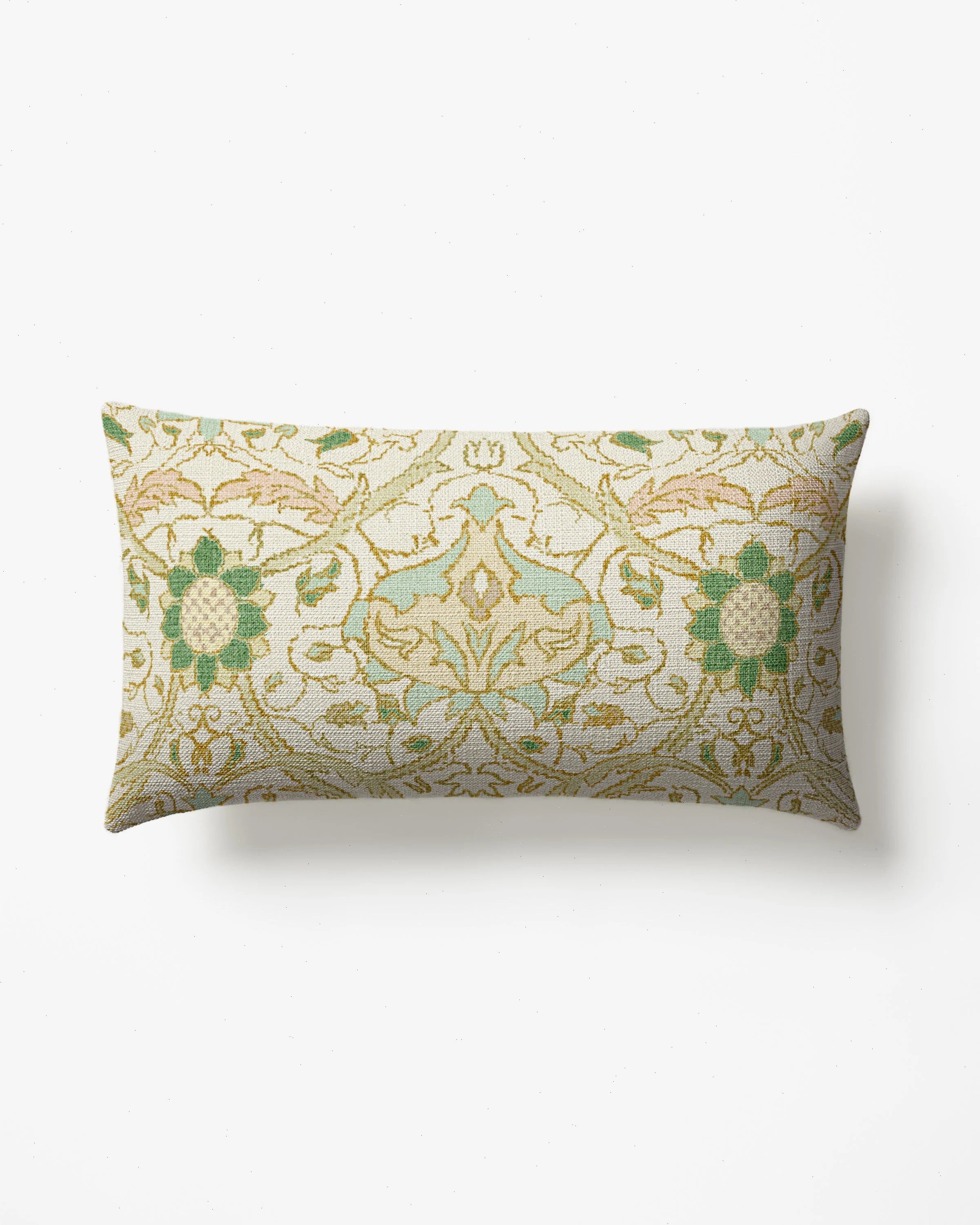 The Montreal pillow features large-scale florals surrounded by climbing vines on a soft cream backdrop. The botanicals are colored in sage greens, silvers, and pinks, and every gold-lined blossom is centered in calming negative space. Pillow covers are water-resistant, stain-resistant, and fully machine-washable. Colors may vary by device and lighting.
