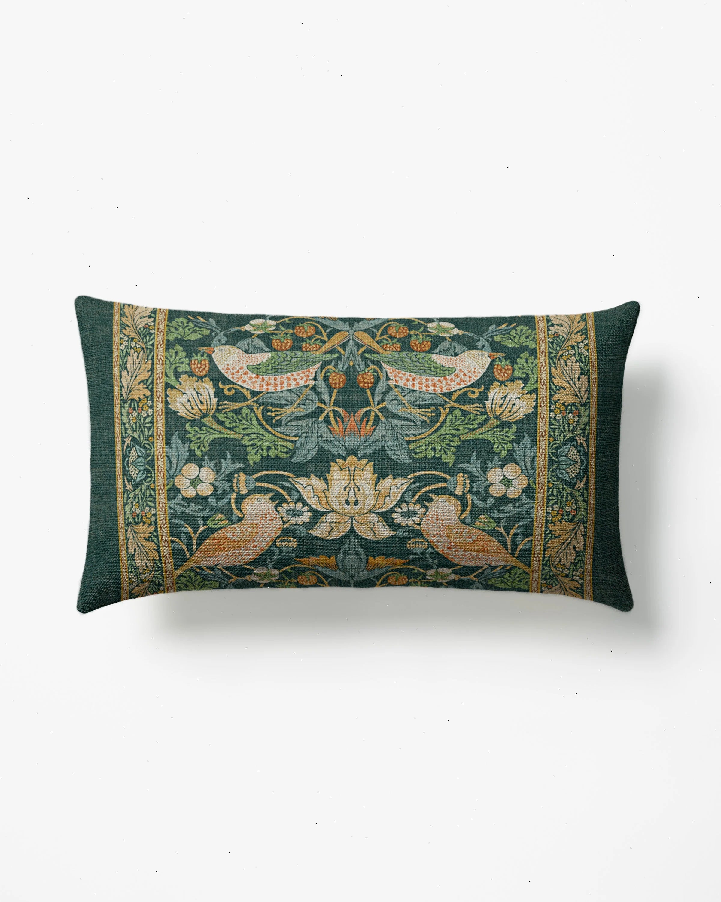 Set on a striking indigo backdrop, the iconic Strawberry Thief motif by William Morris has a mirrored design that brings a modern twist to this classic composition. A mix of fresh slate blues and moss greens are highlighted in ivory and gold, complemented by an organic edge finish. Pillow covers are water-resistant, stain-resistant, and fully machine-washable. Colors may vary by device and lighting.