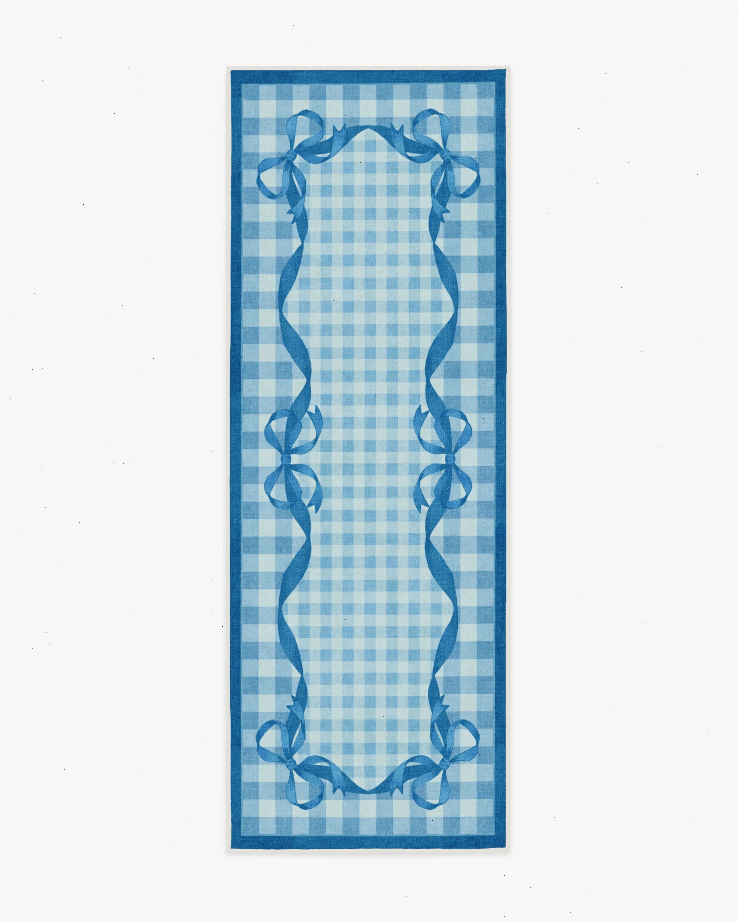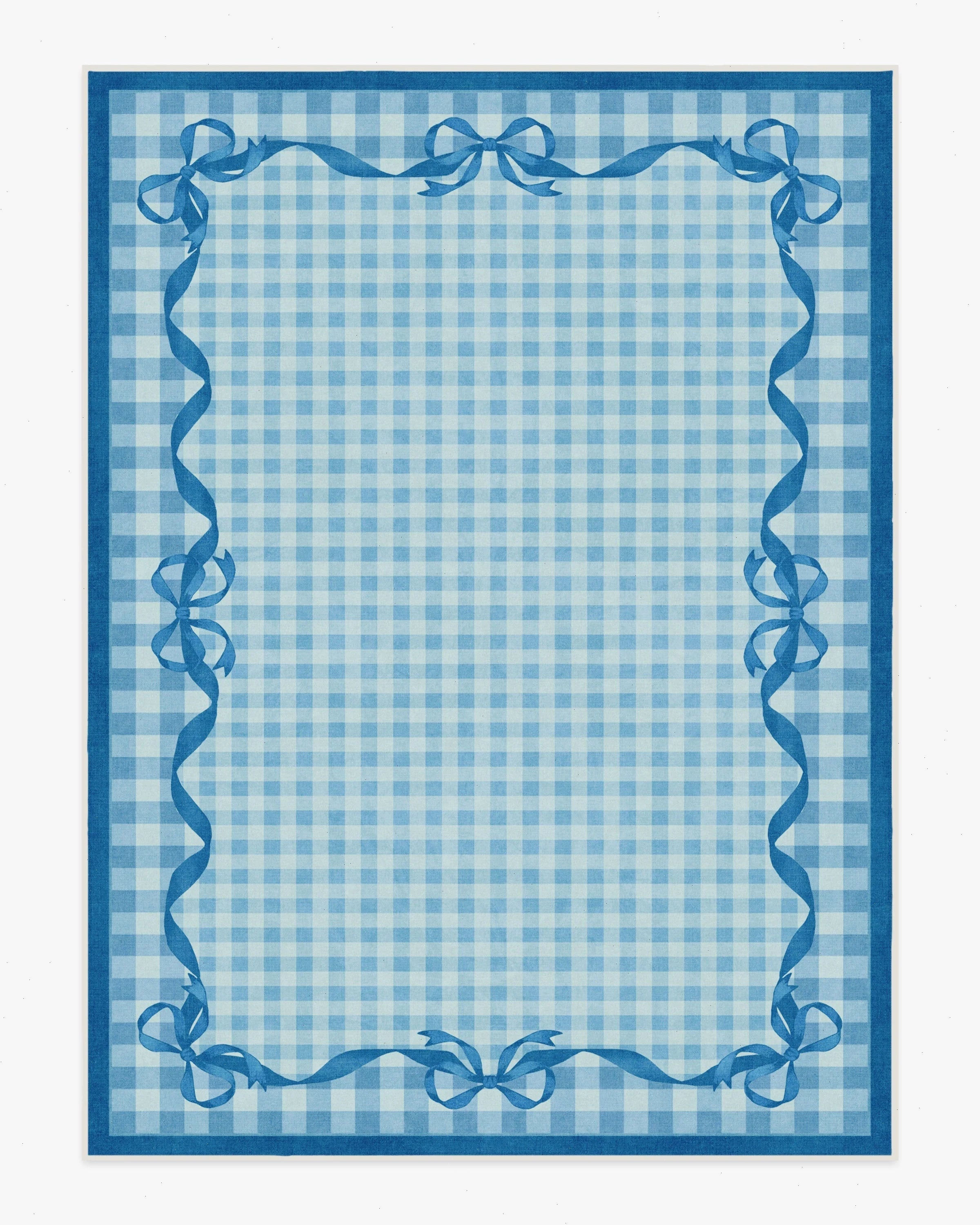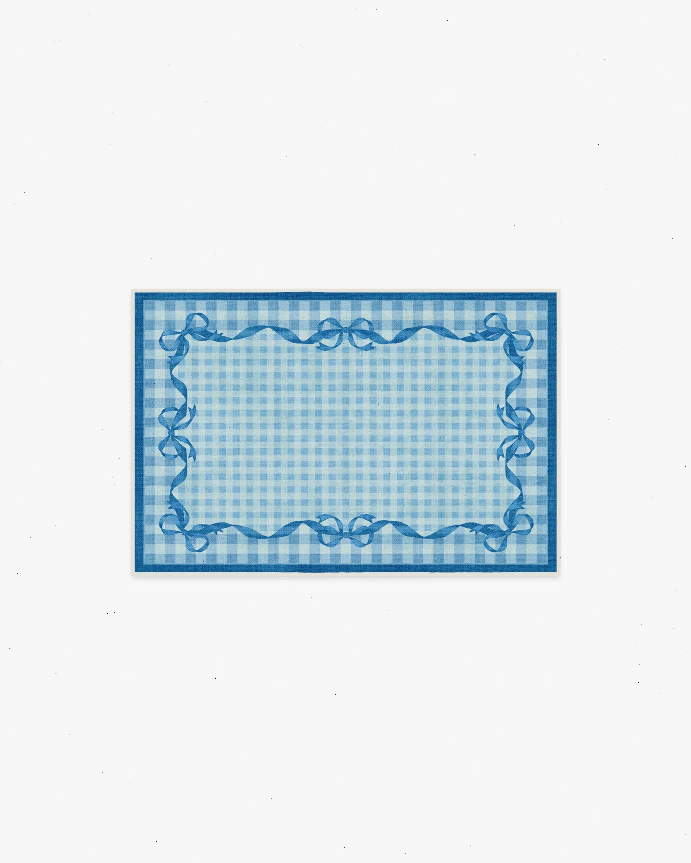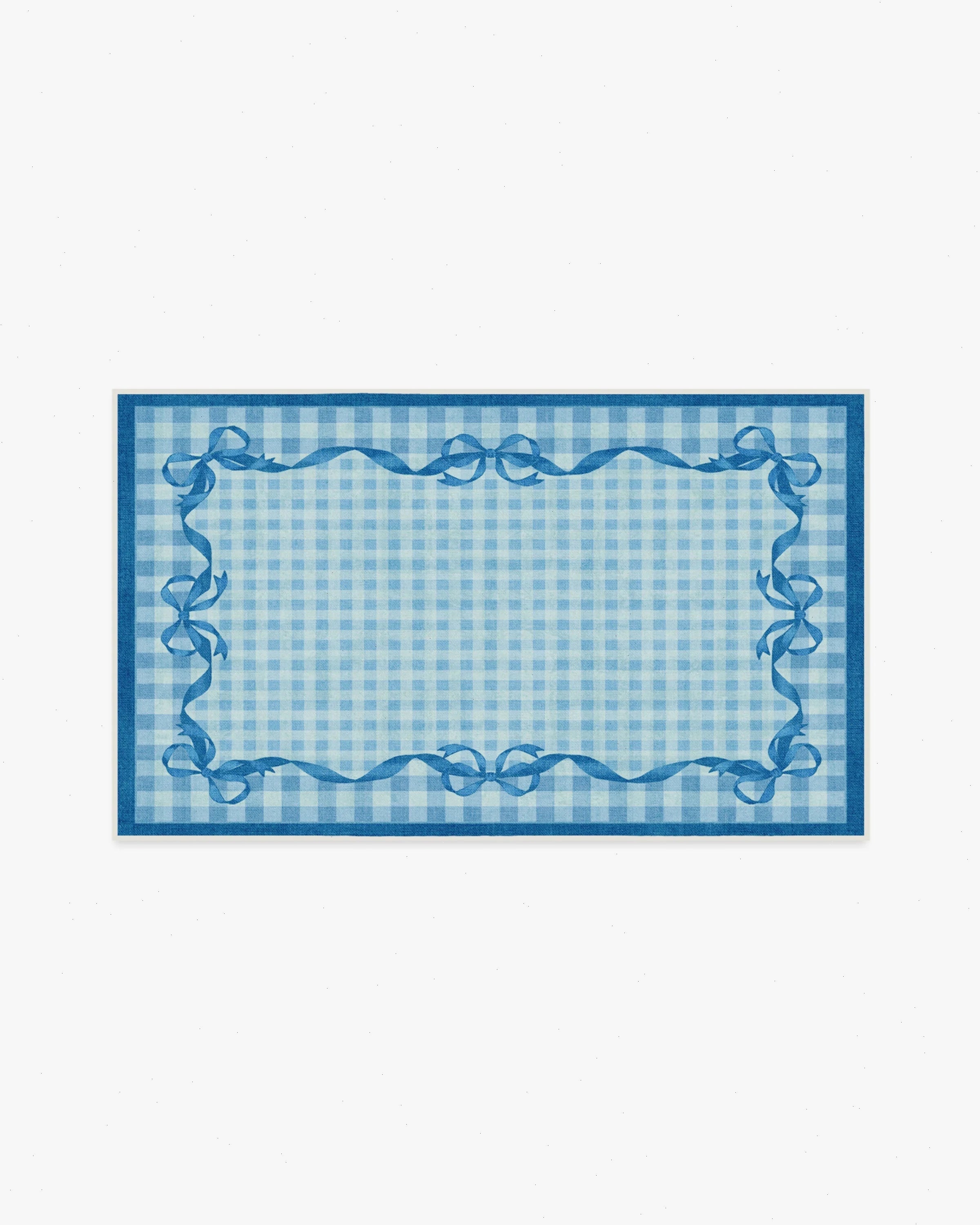 Evoke the charm of a picnic setting with a playful gingham pattern and a blue ribbon adorned with bows. This rug’s combination of cobalt blues on a neutral cream ground captures the essence of Mrs. Alice’s refined yet whimsical aesthetic. Water-resistant, stain-resistant, and machine-washable. Rug colors may vary slightly according to your device and the lighting in your space.