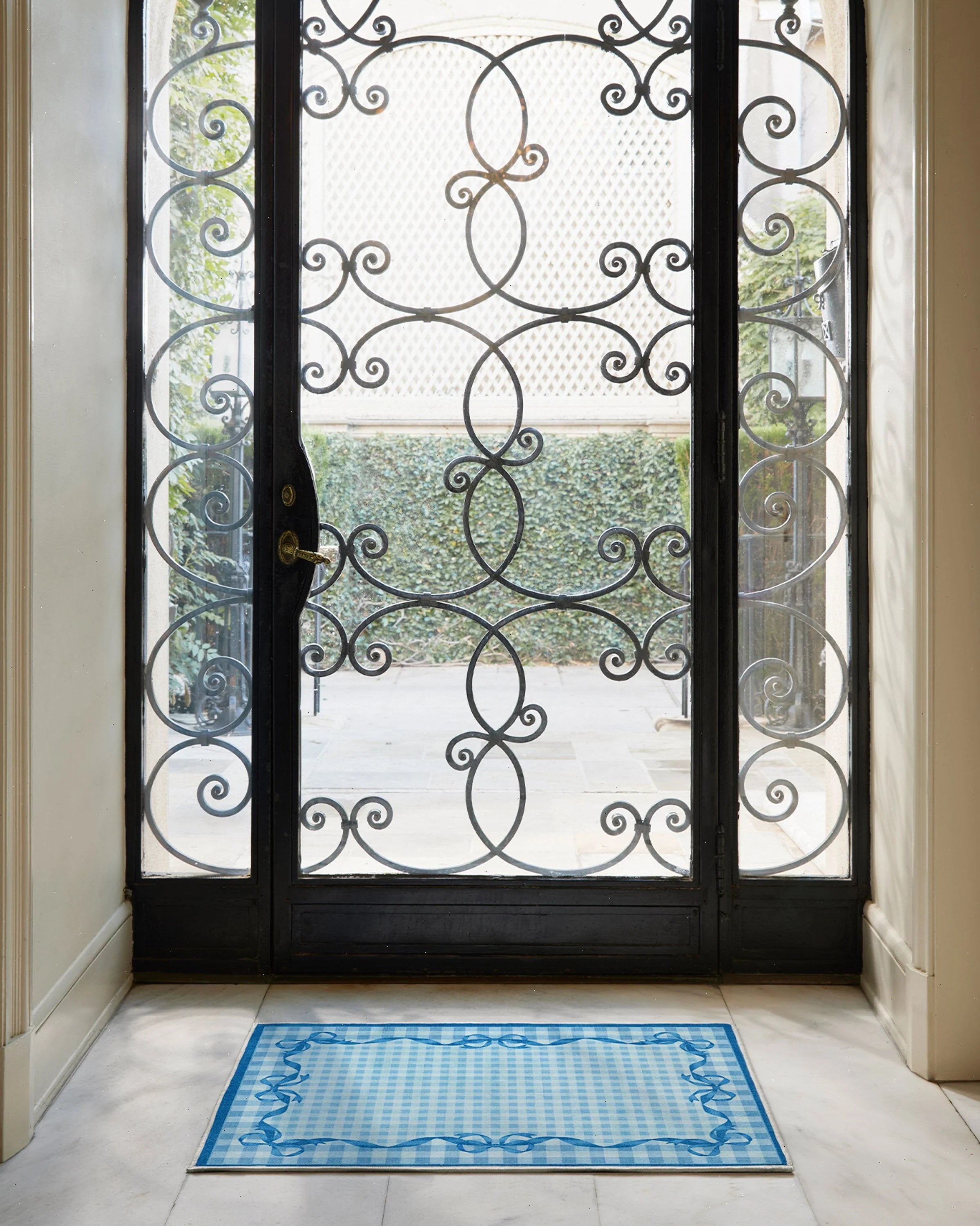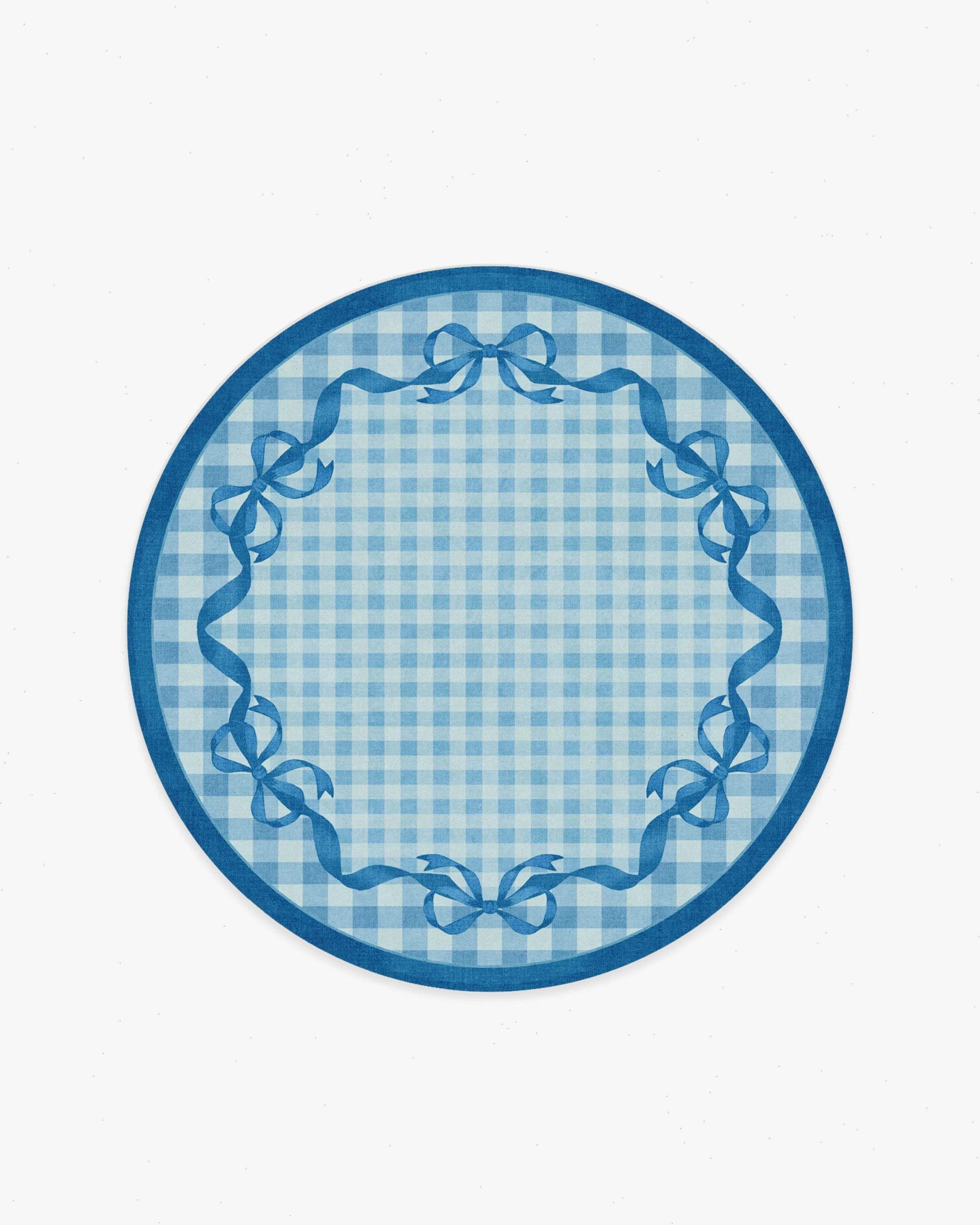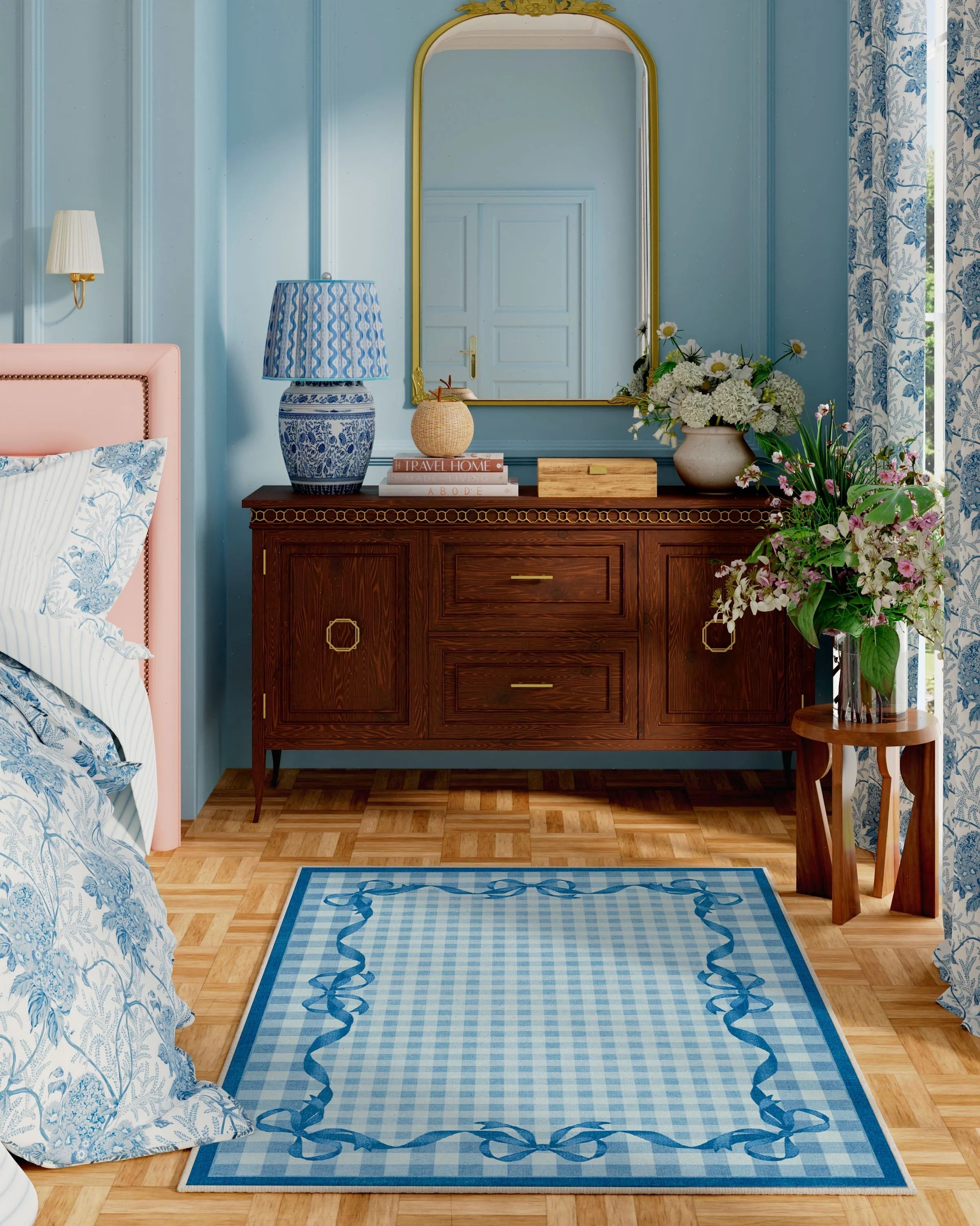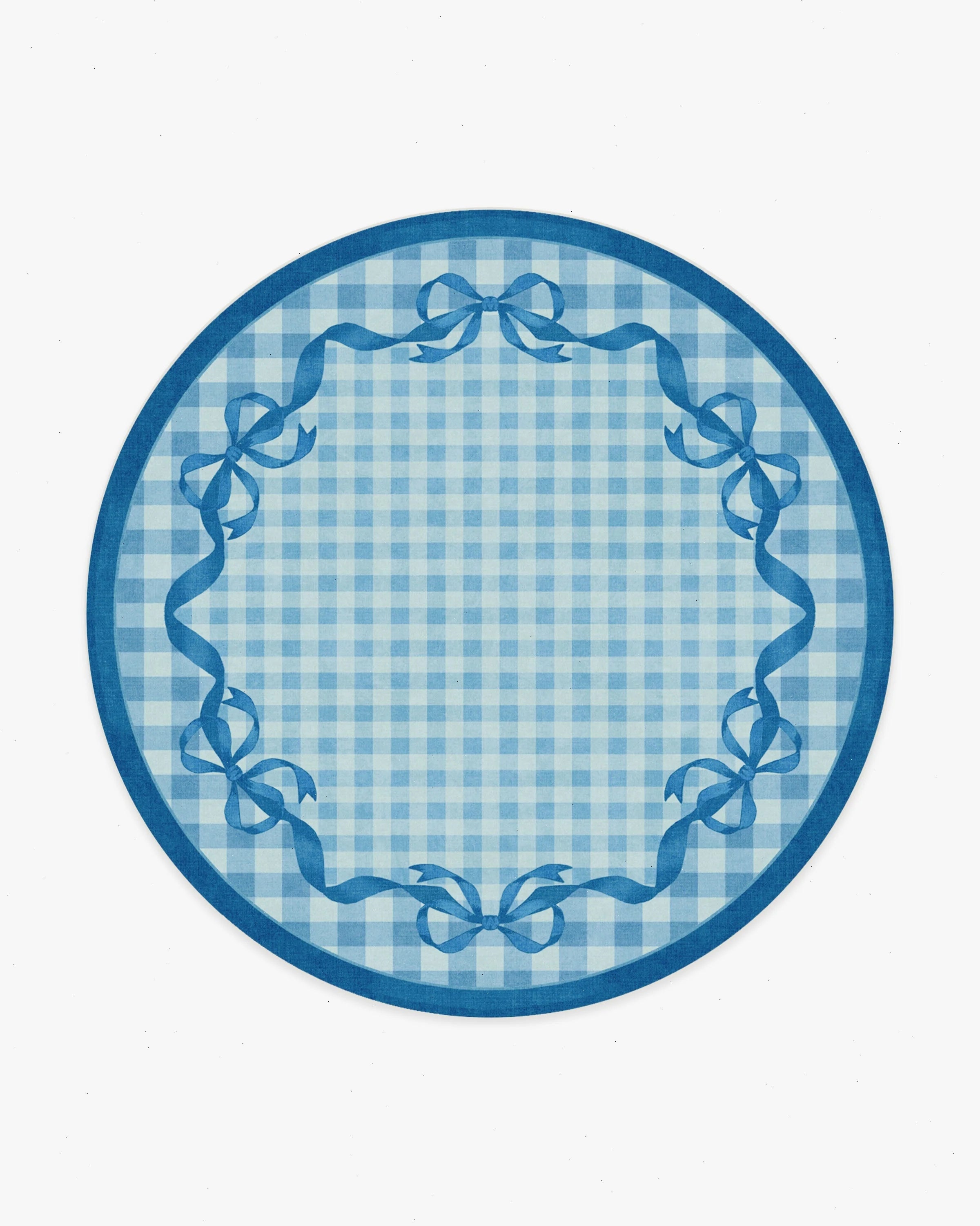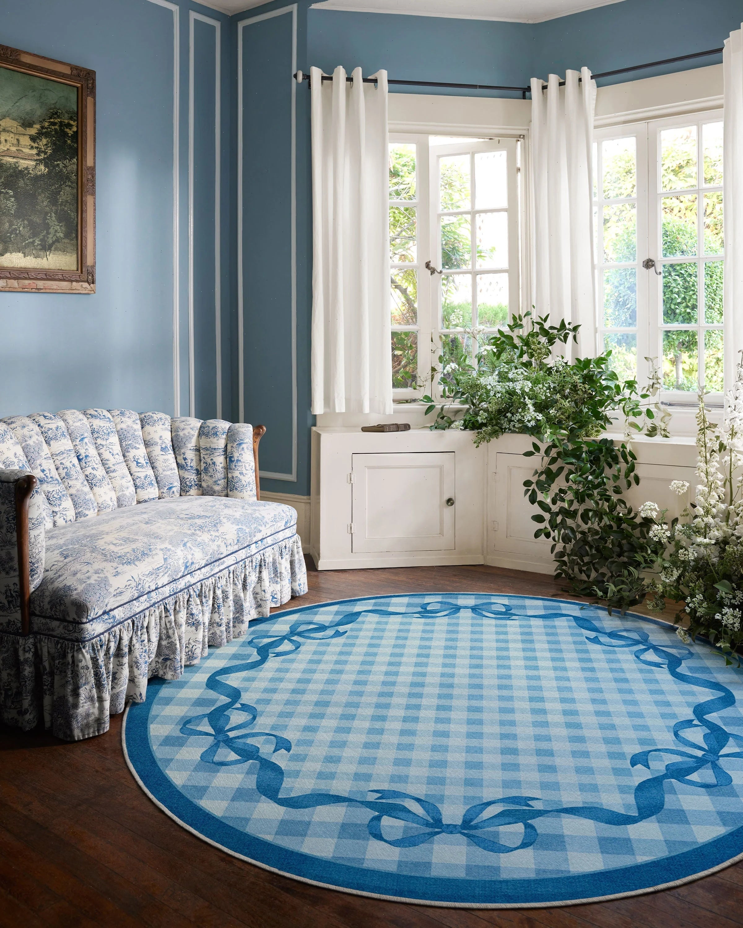 Evoke the charm of a picnic setting with a playful gingham pattern and a blue ribbon adorned with bows. This rug’s combination of cobalt blues on a neutral cream ground captures the essence of Mrs. Alice’s refined yet whimsical aesthetic. Water-resistant, stain-resistant, and machine-washable. Rug colors may vary slightly according to your device and the lighting in your space.