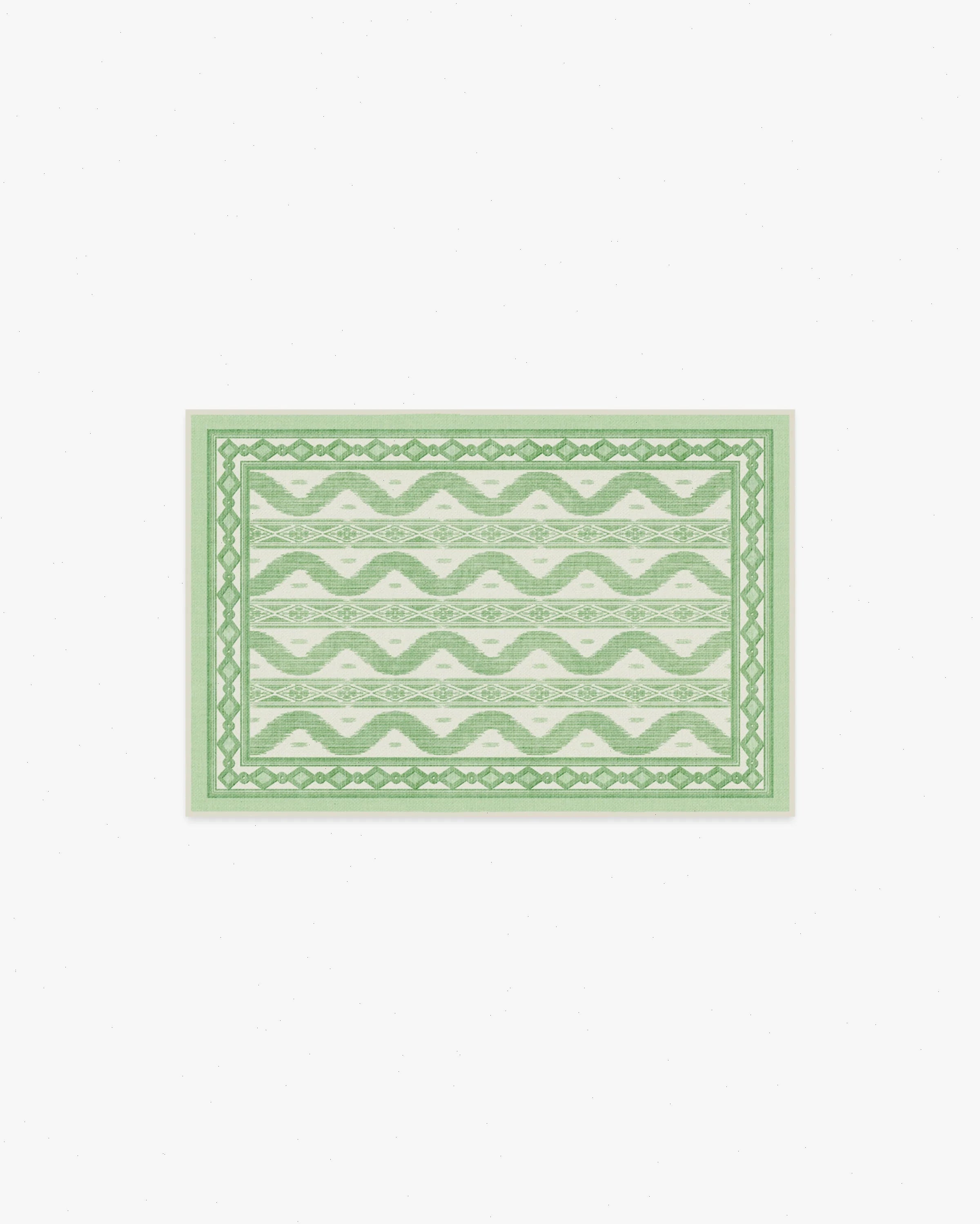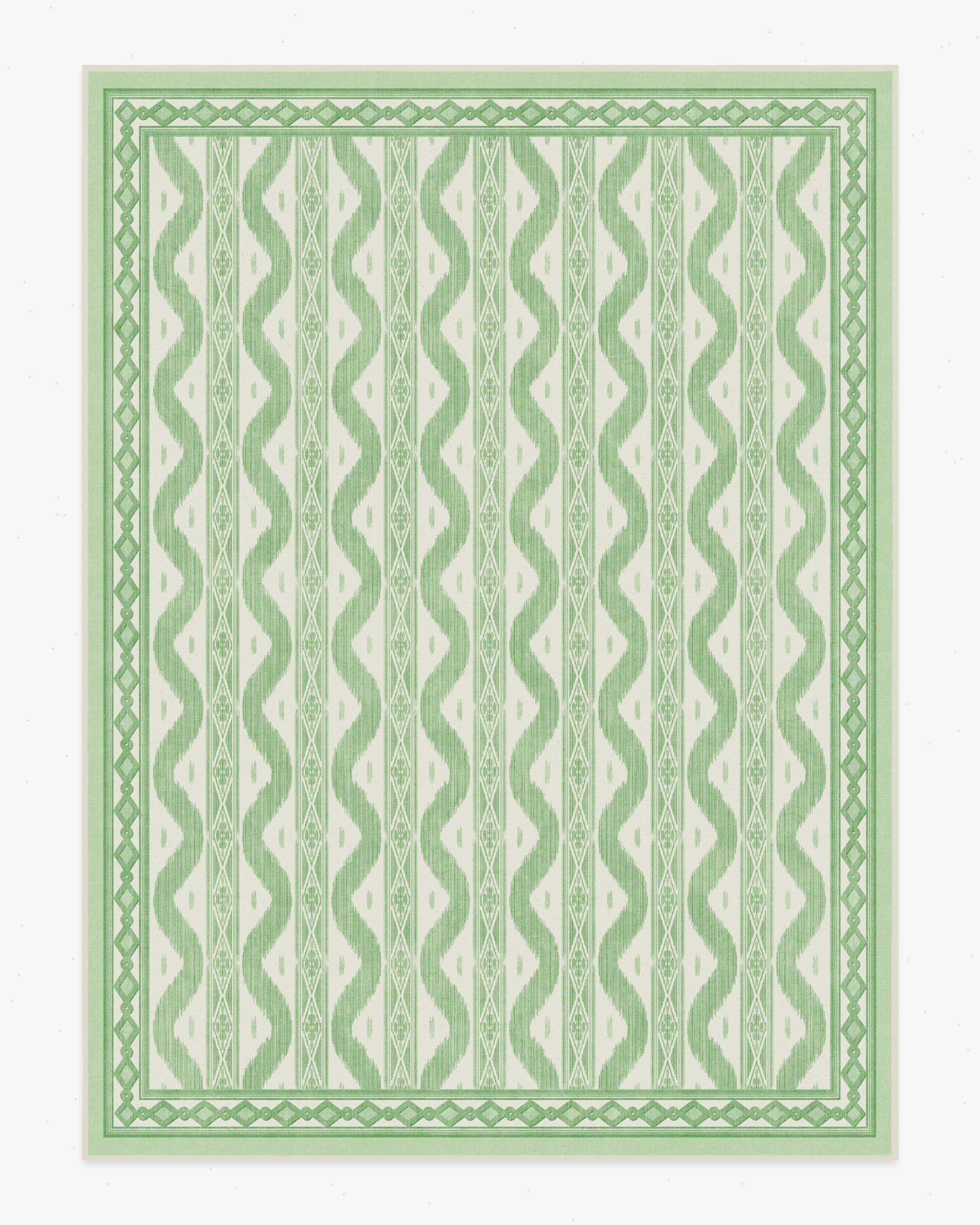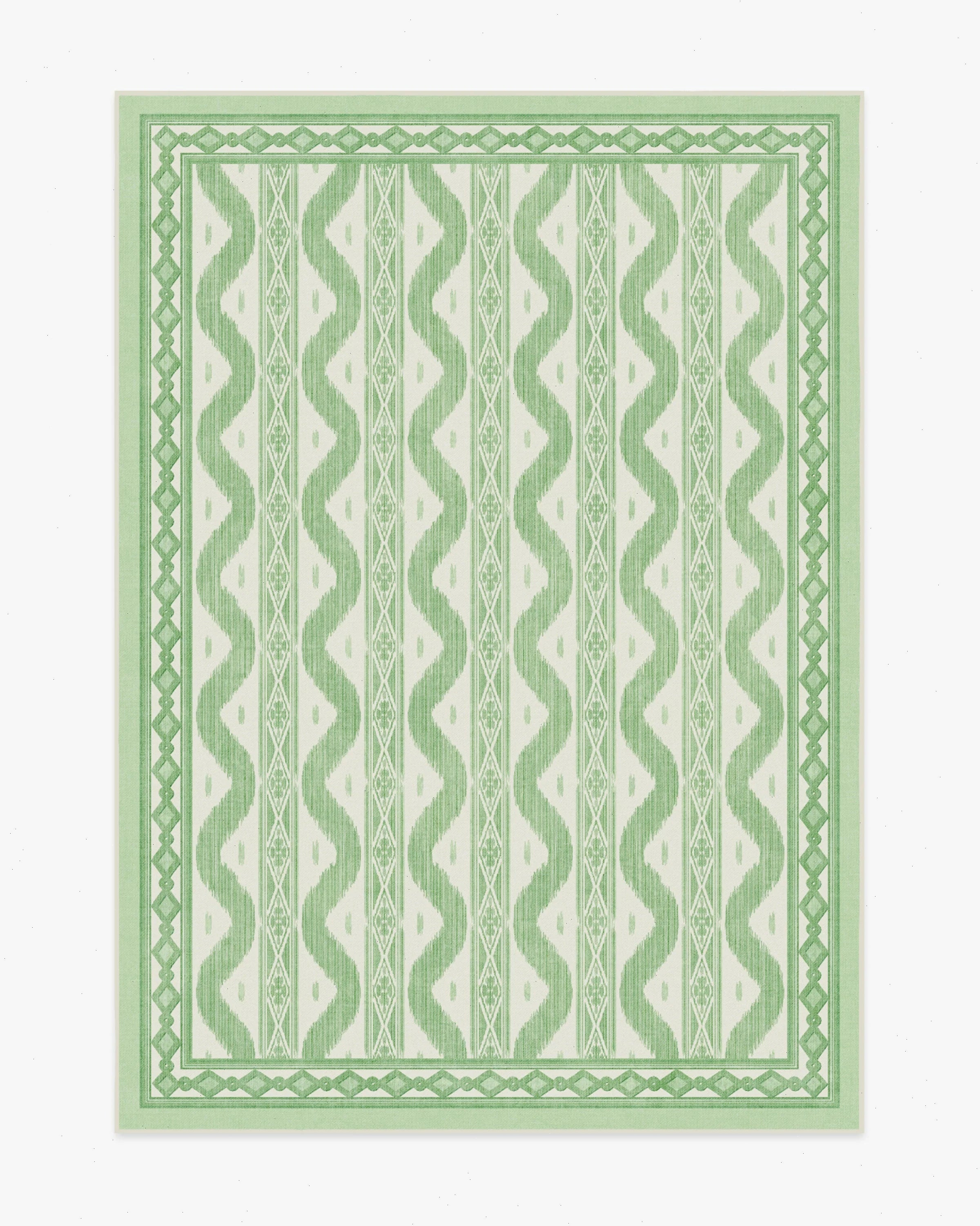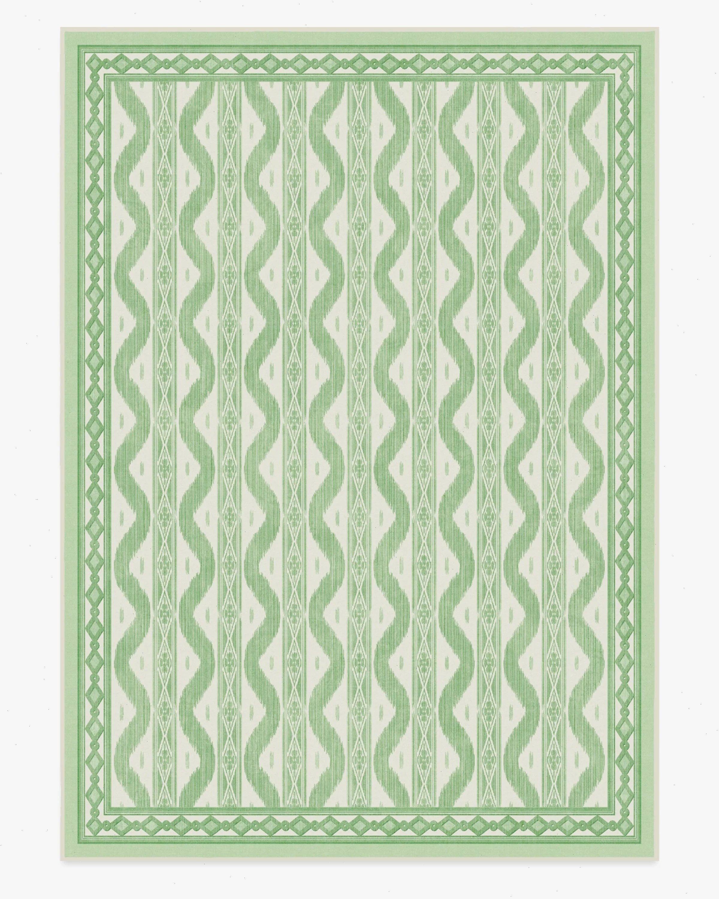 Modern elegance with a touch of fun, this design showcases Mrs. Alice’s signature Ikat patterns with a playful pop of green. Intricate patterning and a monochromatic palette of greens, from light to dark with subtle hints of yellowish-green, add depth and texture, all set against a neutral cream ground. Water-resistant, stain-resistant, and machine-washable. Rug colors may vary slightly according to your device and the lighting in your space.