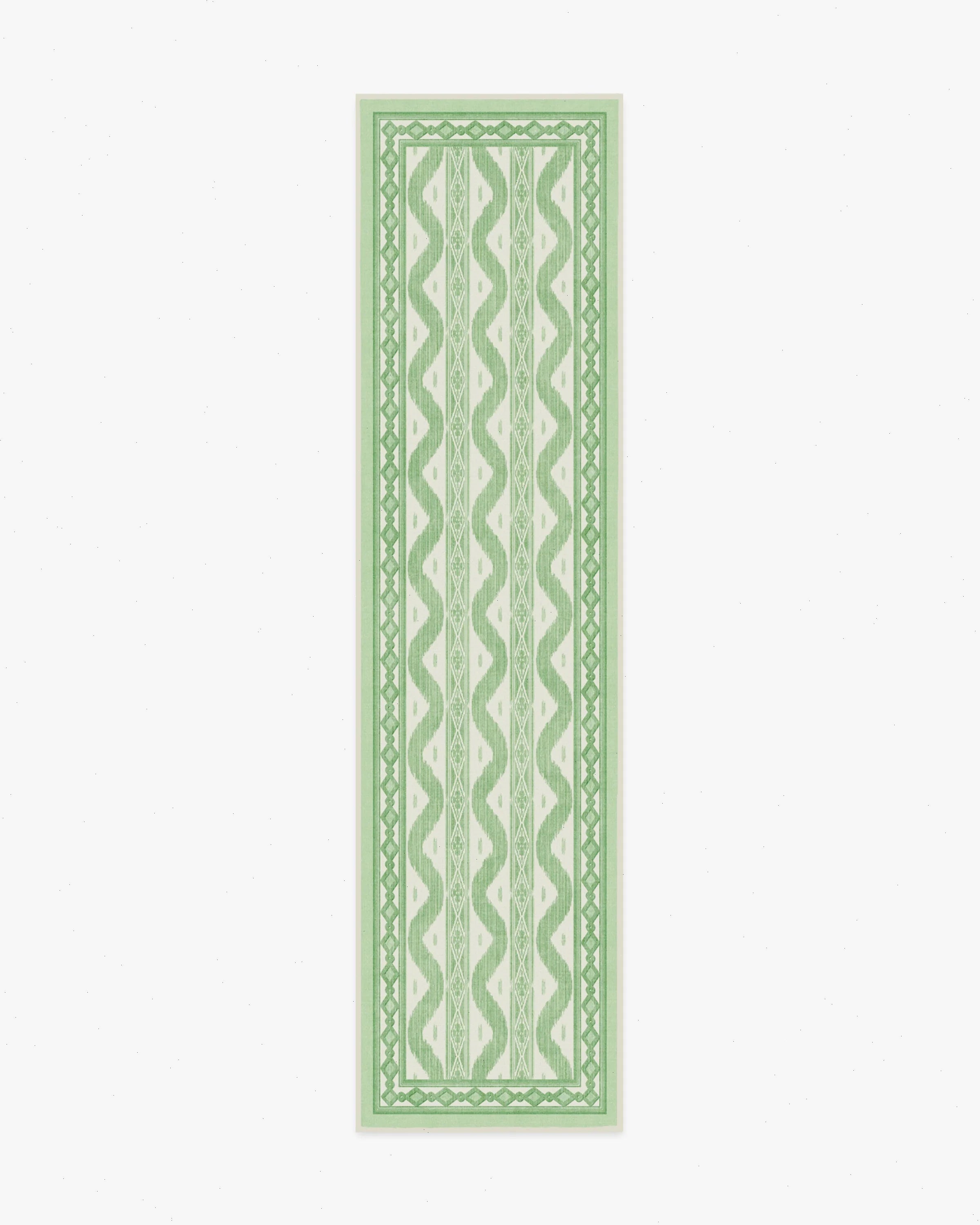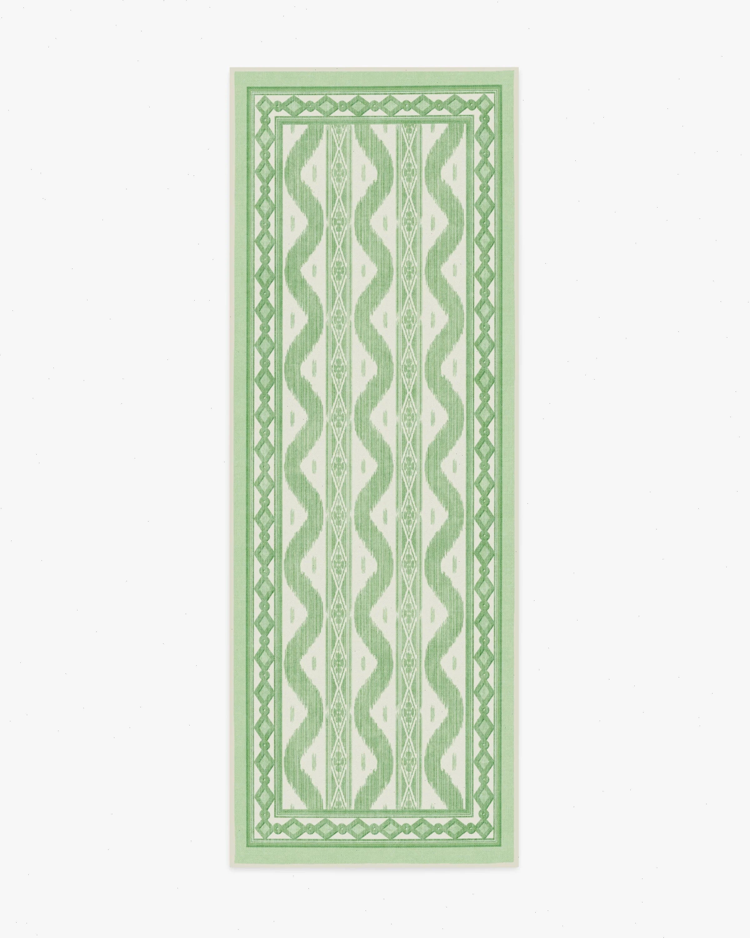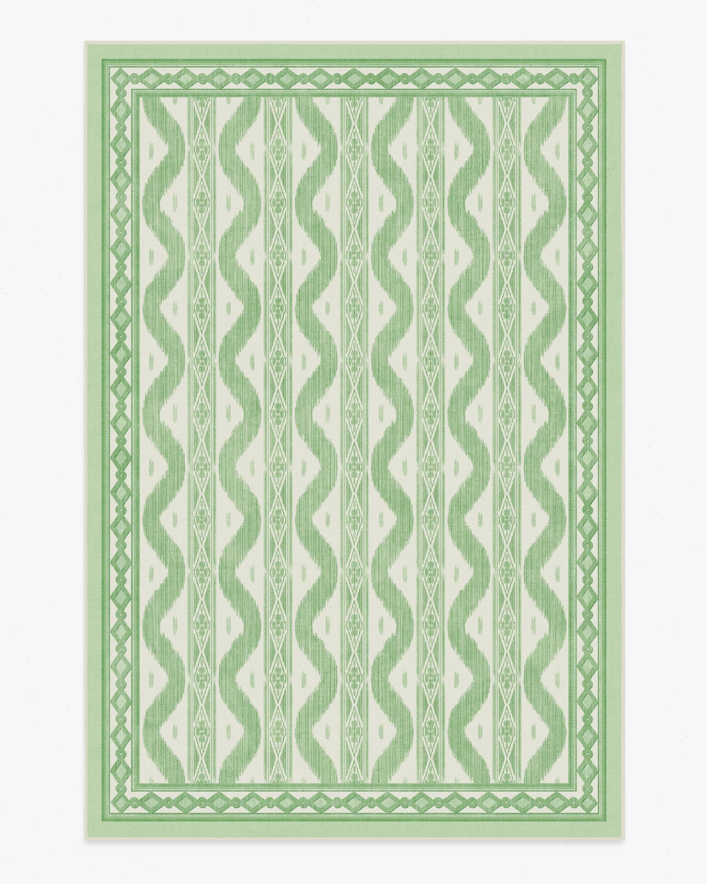 Modern elegance with a touch of fun, this design showcases Mrs. Alice’s signature Ikat patterns with a playful pop of green. Intricate patterning and a monochromatic palette of greens, from light to dark with subtle hints of yellowish-green, add depth and texture, all set against a neutral cream ground. Water-resistant, stain-resistant, and machine-washable. Rug colors may vary slightly according to your device and the lighting in your space.