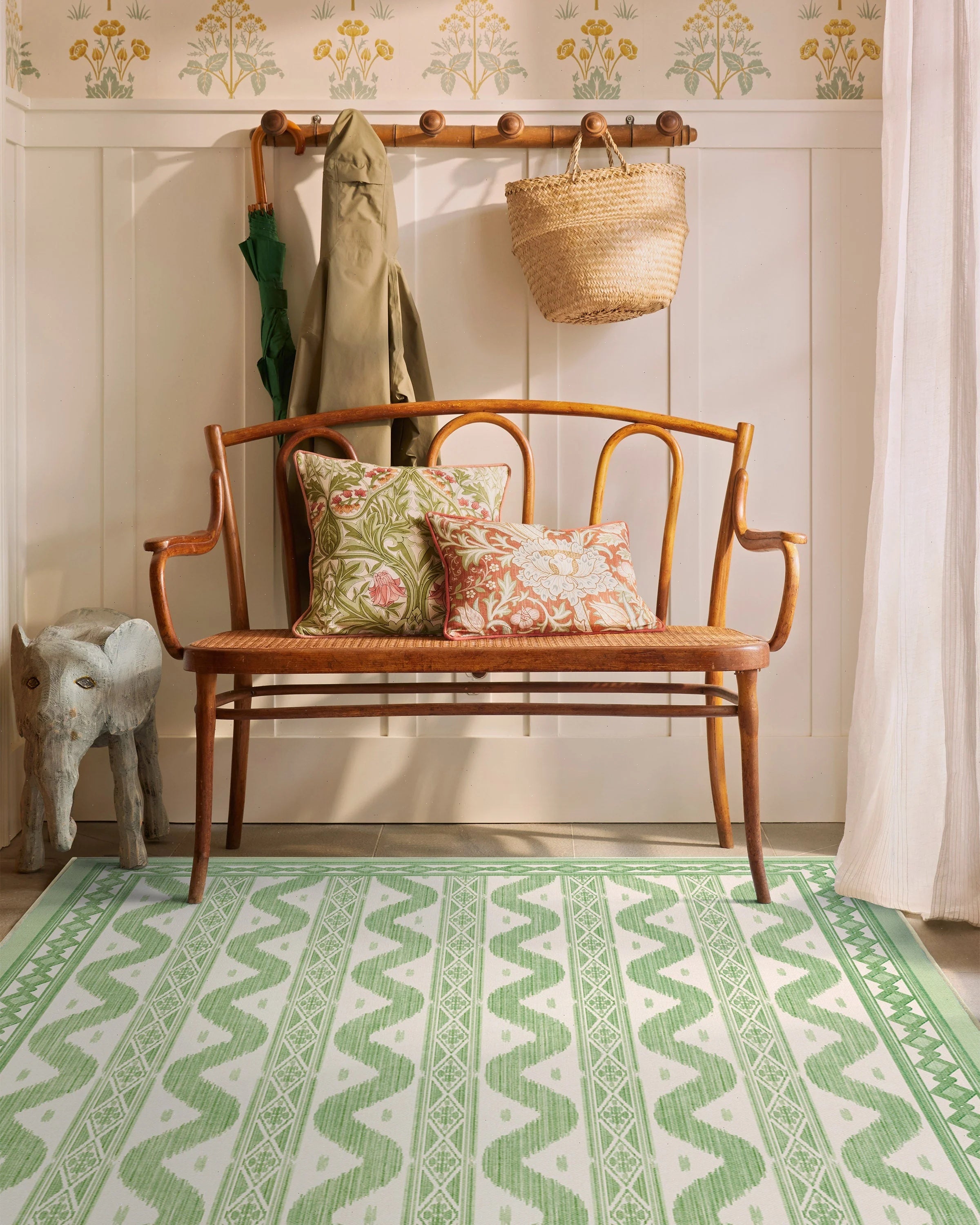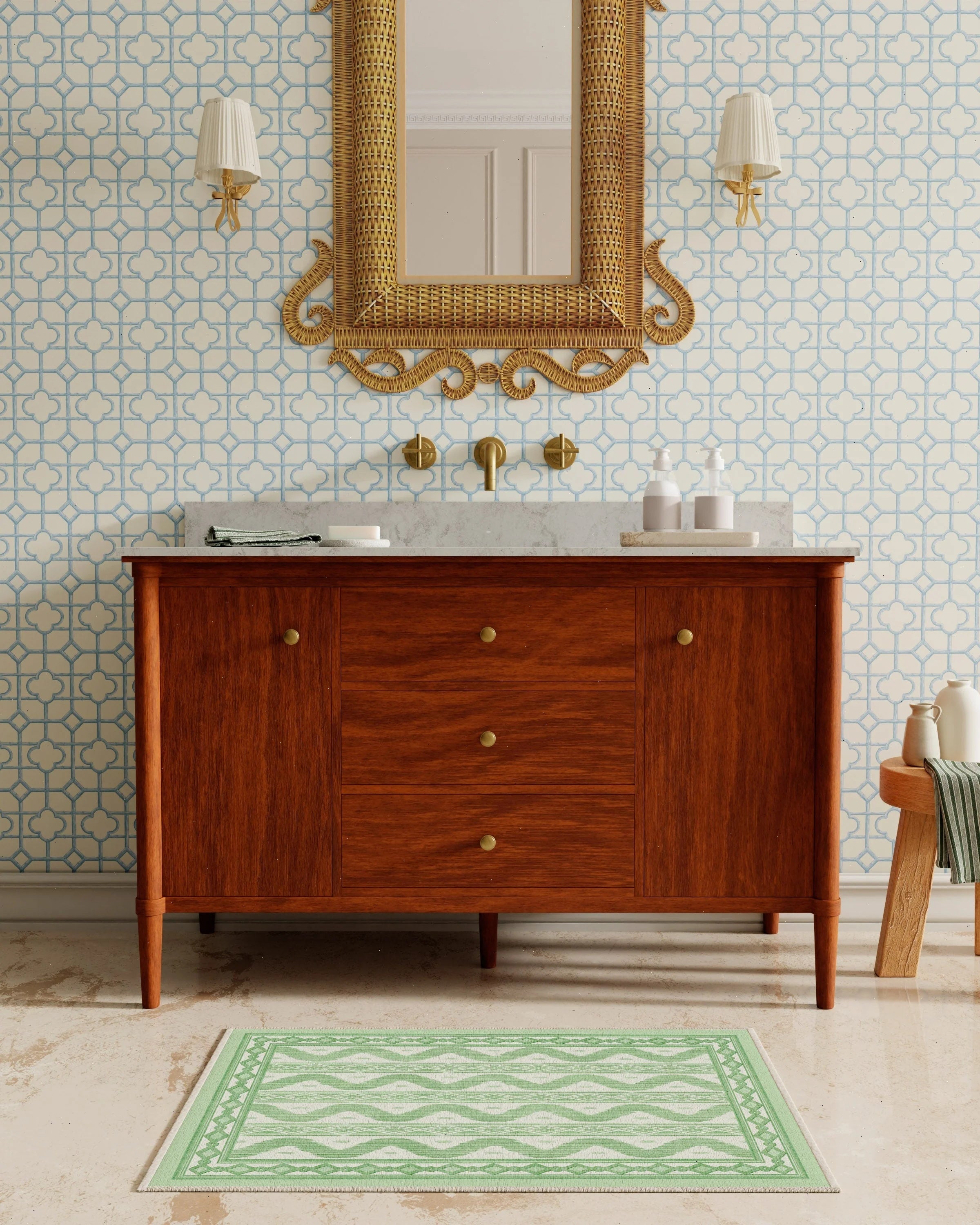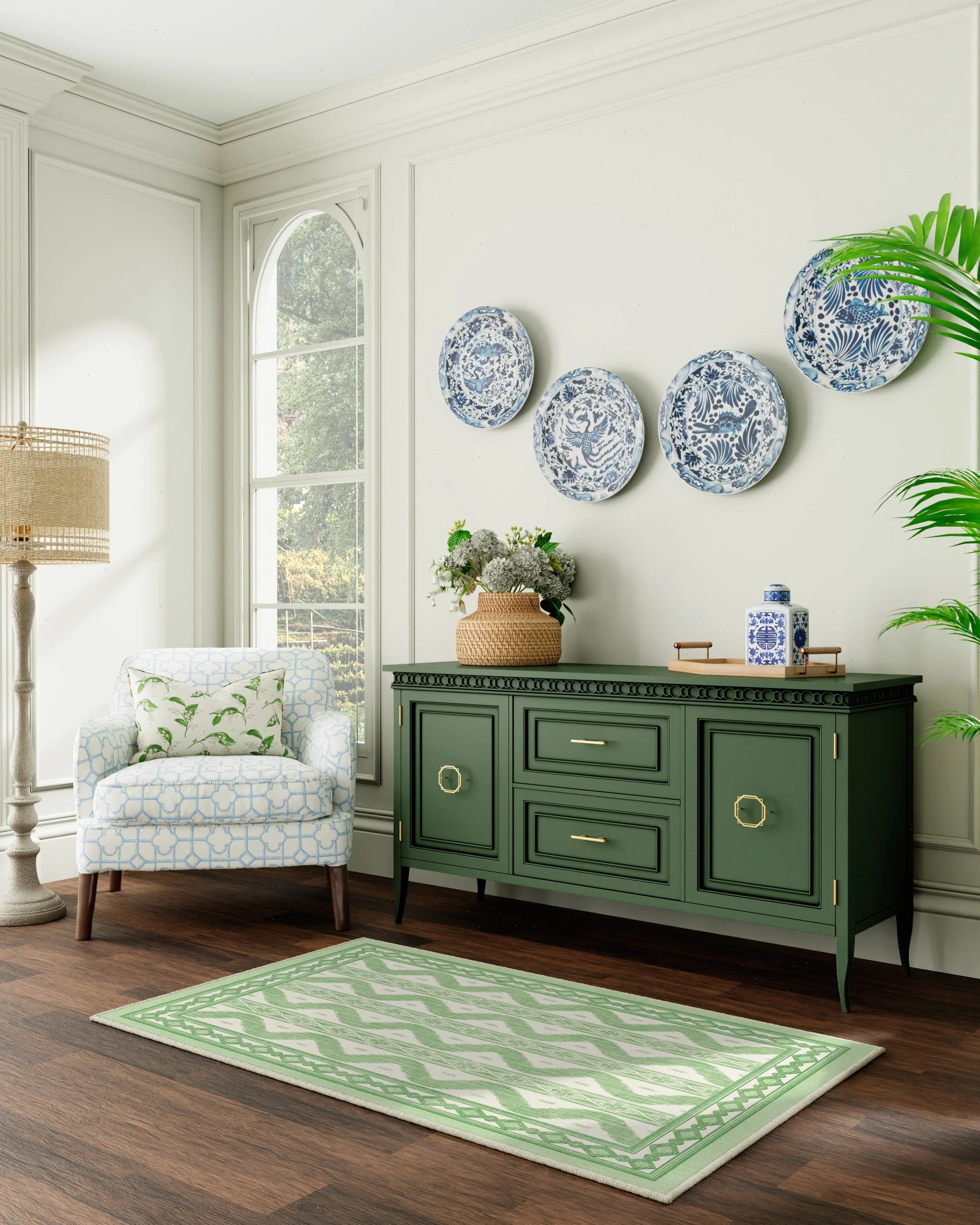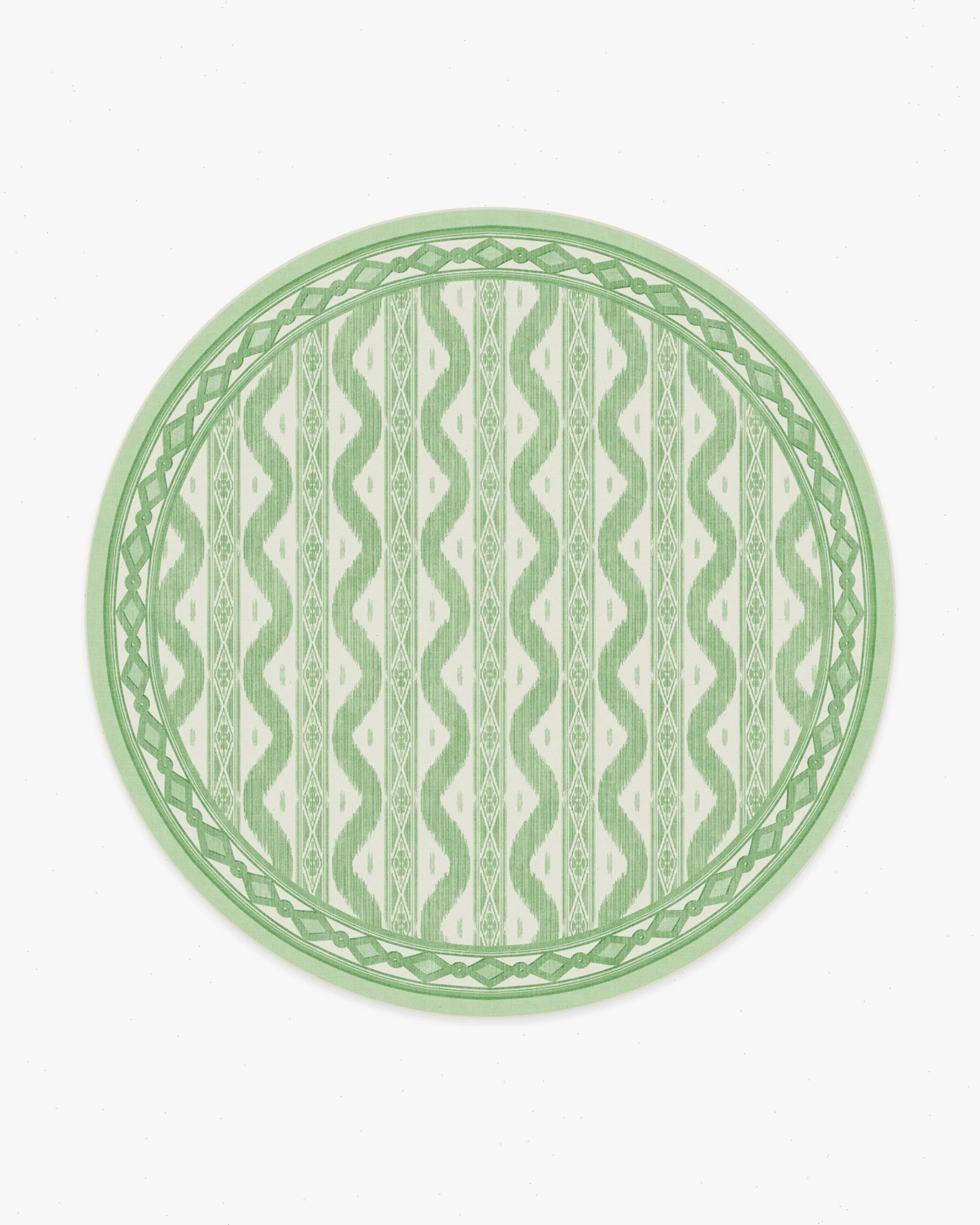 Modern elegance with a touch of fun, this design showcases Mrs. Alice’s signature Ikat patterns with a playful pop of green. Intricate patterning and a monochromatic palette of greens, from light to dark with subtle hints of yellowish-green, add depth and texture, all set against a neutral cream ground. Water-resistant, stain-resistant, and machine-washable. Rug colors may vary slightly according to your device and the lighting in your space.