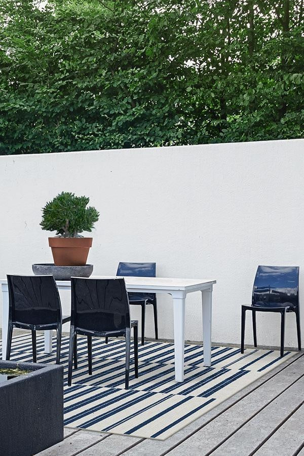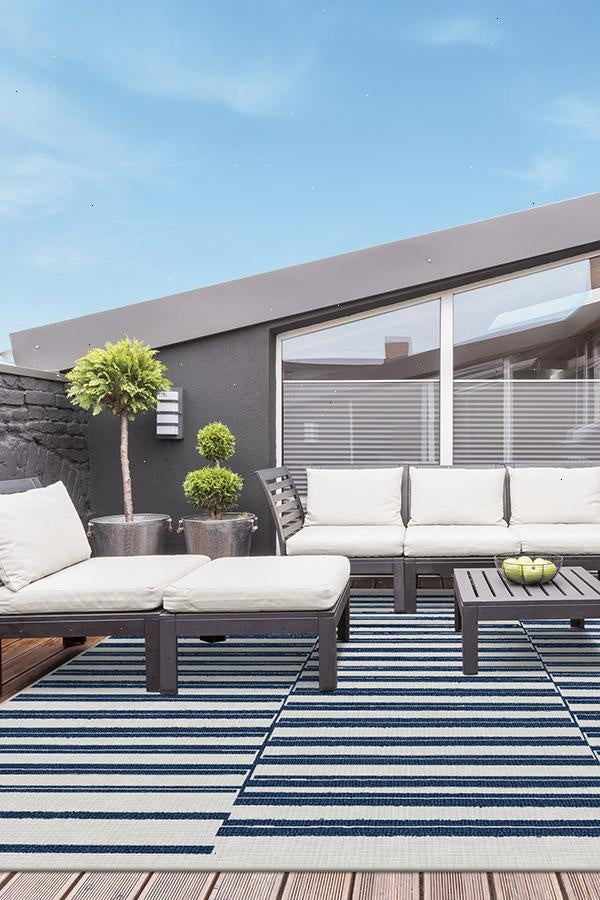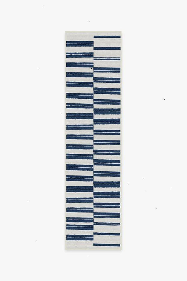 The classic stripe gets an upgrade. Our Offset Stripe Navy Rug features navy blue horizontal lines offset against one another on a neutral grey background. The extra-durable, machine-washable material is perfect for both outdoor and indoor use, especially high-traffic areas and those exposed to the elements.