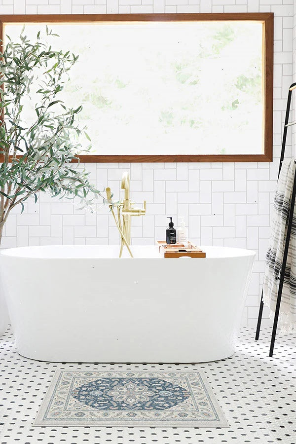 Inspired by classic Persian rug designs. Our Safiya Teal Sage Bath Mat features nature-inspired motifs with a distinguished medallion in subtle tones of pink, yellow, and sage green spread across a background of blue and off-white. Made from our highly absorbent, quick-drying, machine-washable tufted material.