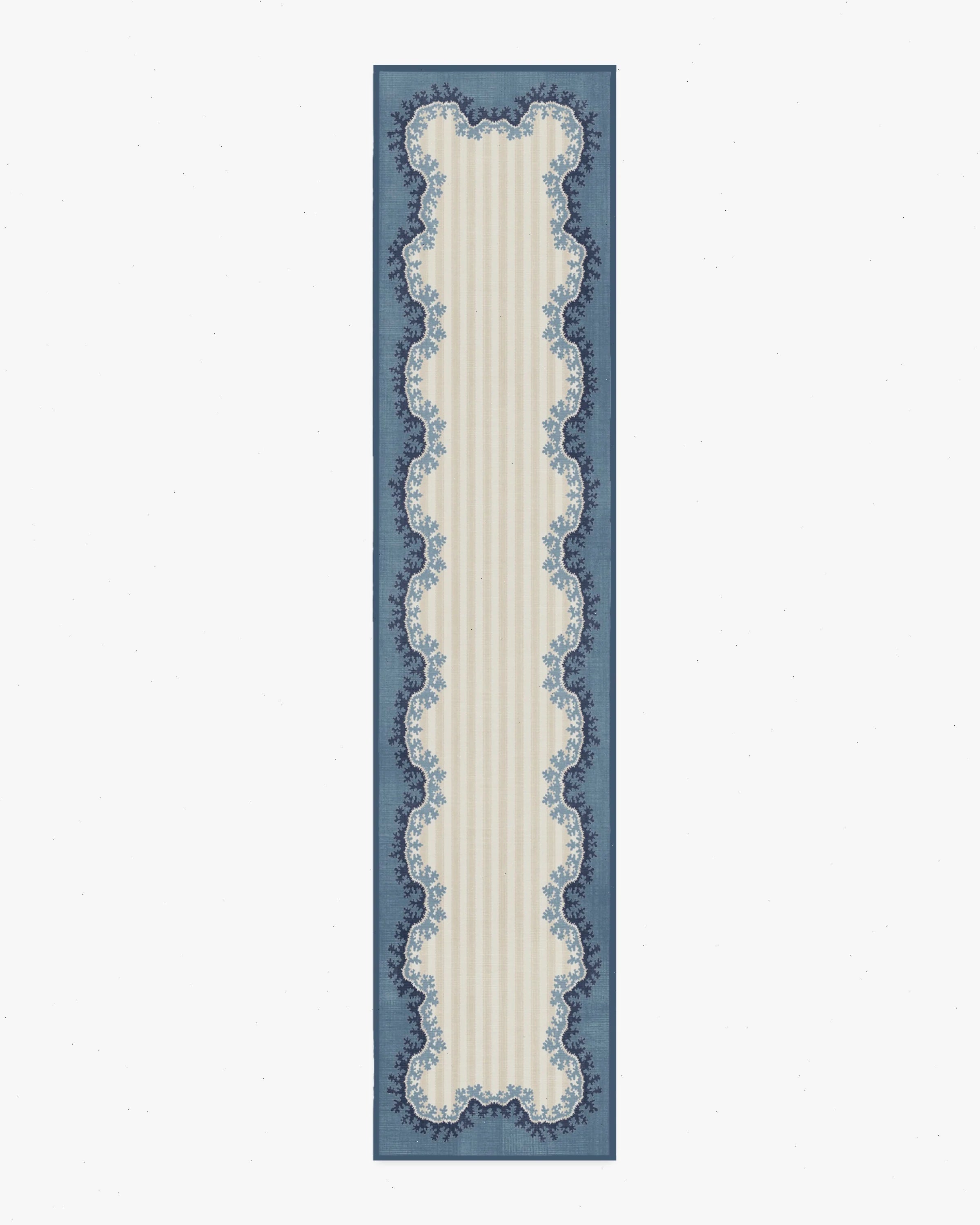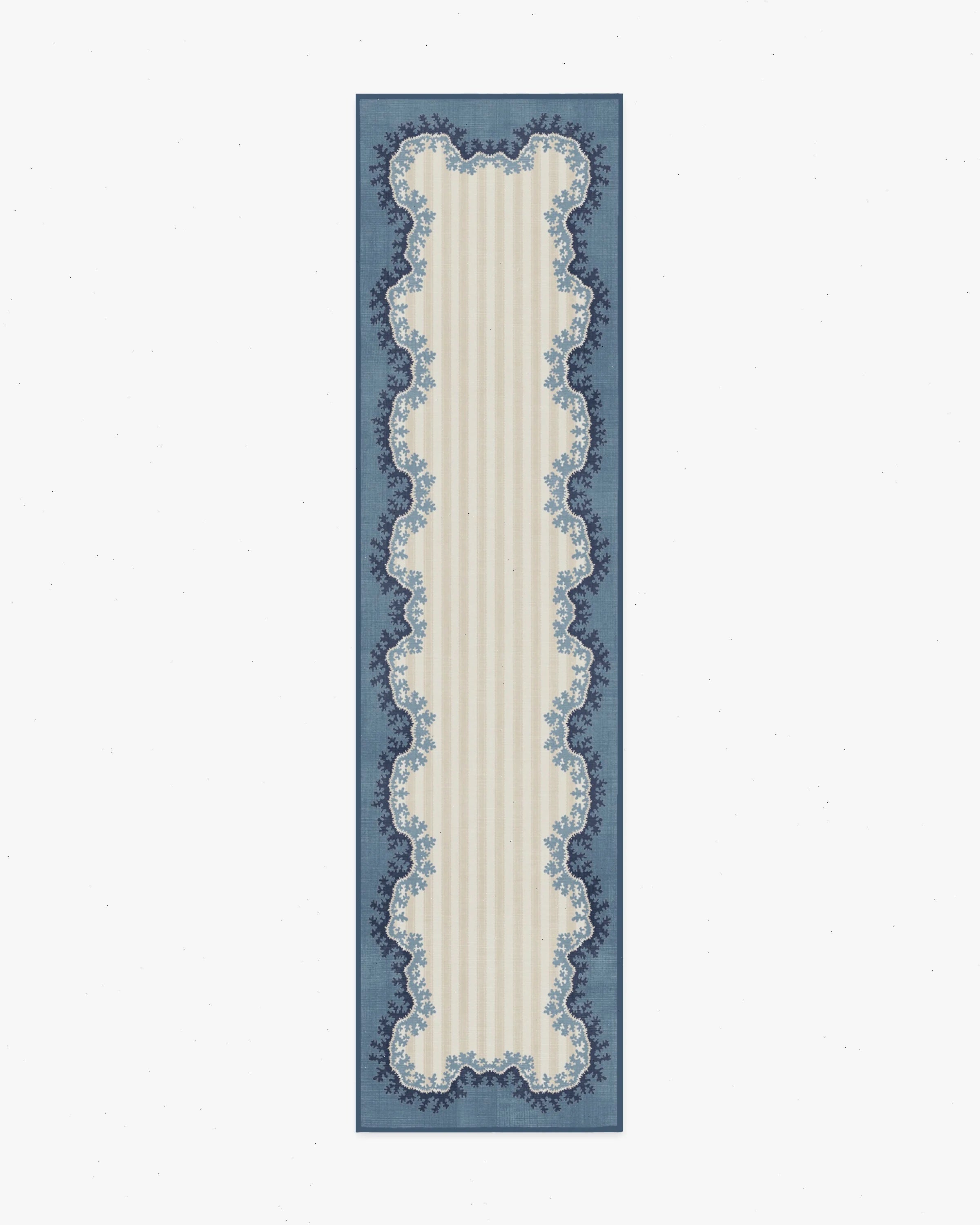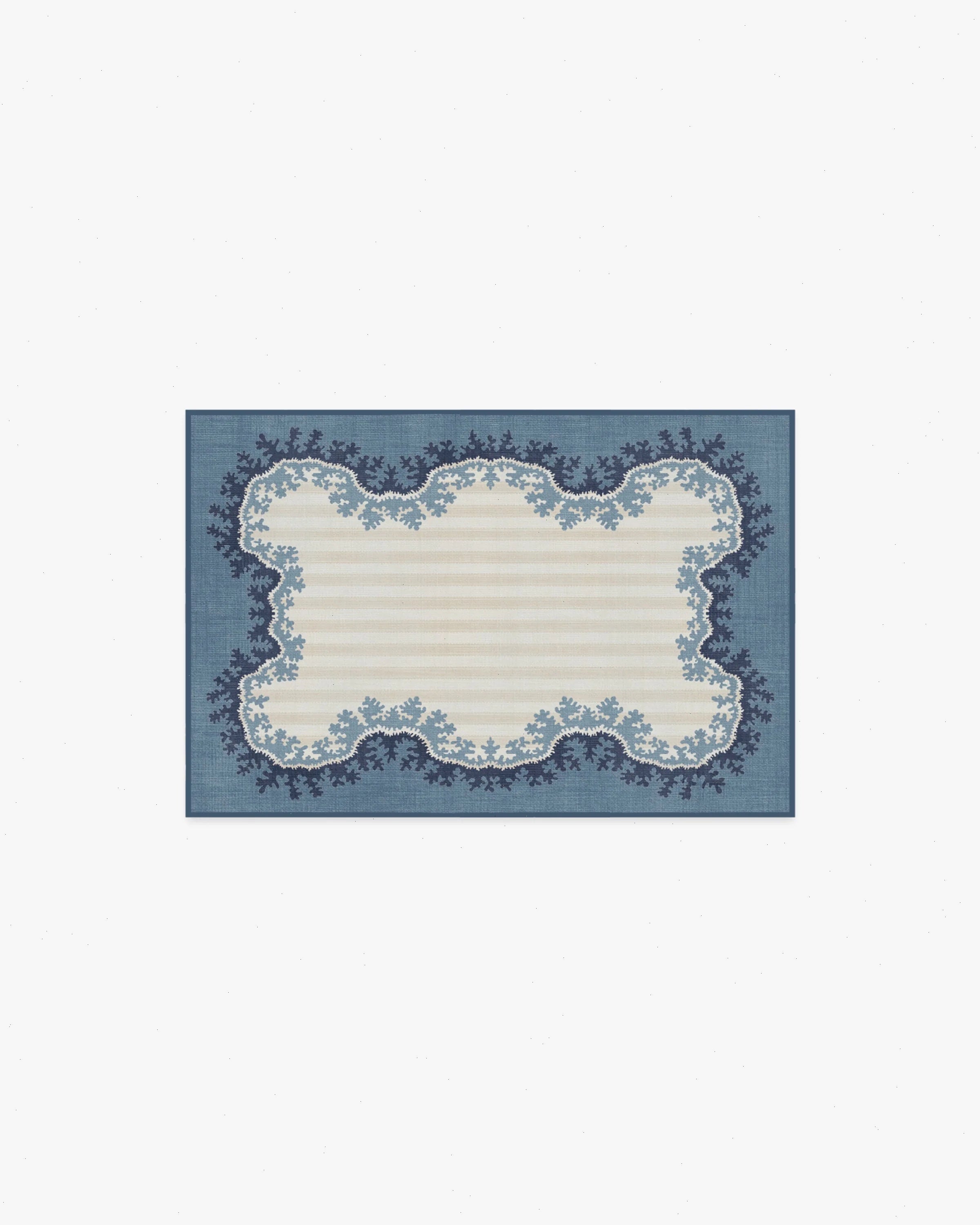 Let imagination in with our Sanderson Oxbow Indigo Rug. Referencing Sanderson’s Oxbow pattern, a stylized river design, this rug features tonal stripes and a contrasting organic border that beautifully frames the motif. Shades of slate blue and navy add depth and dimension to the cream and ivory striped background. Water-resistant, stain-resistant, and machine-washable. Rug colors may vary slightly according to your device and the lighting in your space.