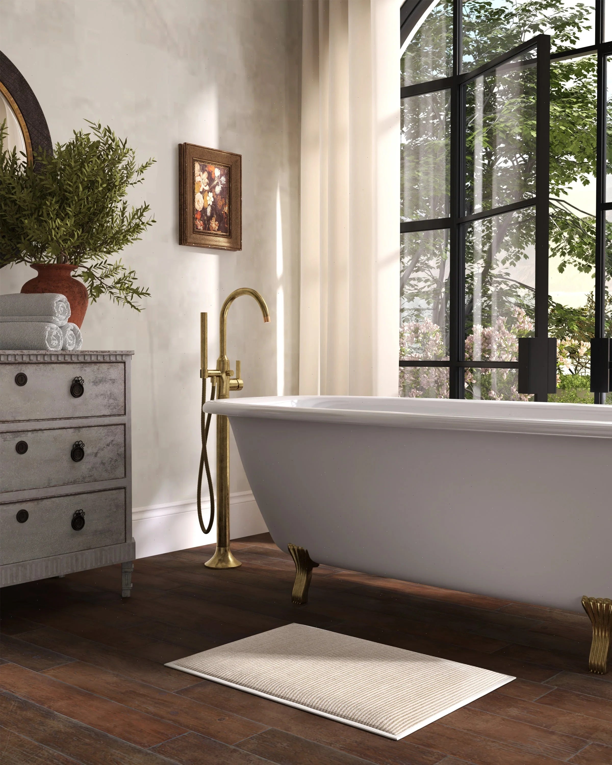 Add a fresh aesthetic to your bathroom with our Sandro Stripe Natural Bath Mat. This design features a classic pinstripe pattern, with contrasting off-white and neutral stripes. Water-resistant, stain-resistant, and machine-washable. Bath mat colors may vary slightly according to your device and the lighting in your space.