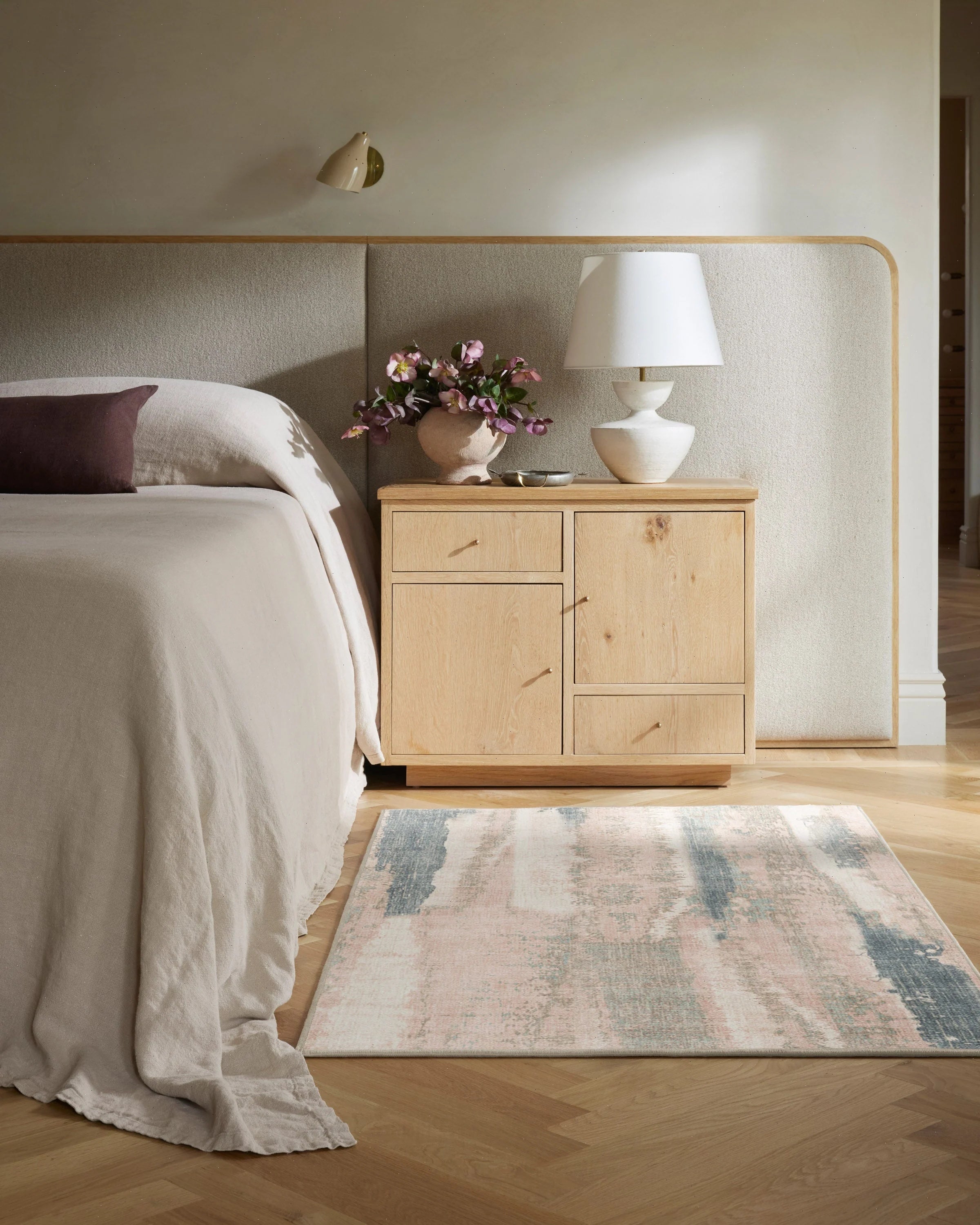 Sometimes, you're touched by a stroke of genius. The Velin Soft Mauve Rug brings that feeling to life through fluid, paint-like gestures that sweep across the surface. Broken, overlapping lines create a soft sense of vertical movement, subtly forming an understated top and bottom border. A palette of soft pinks, blue-grey, warm grey, and soft neutrals provides serene, lived-in elegance. Water-resistant, stain-resistant, and fully machine-washable. Colors may vary by device and lighting.